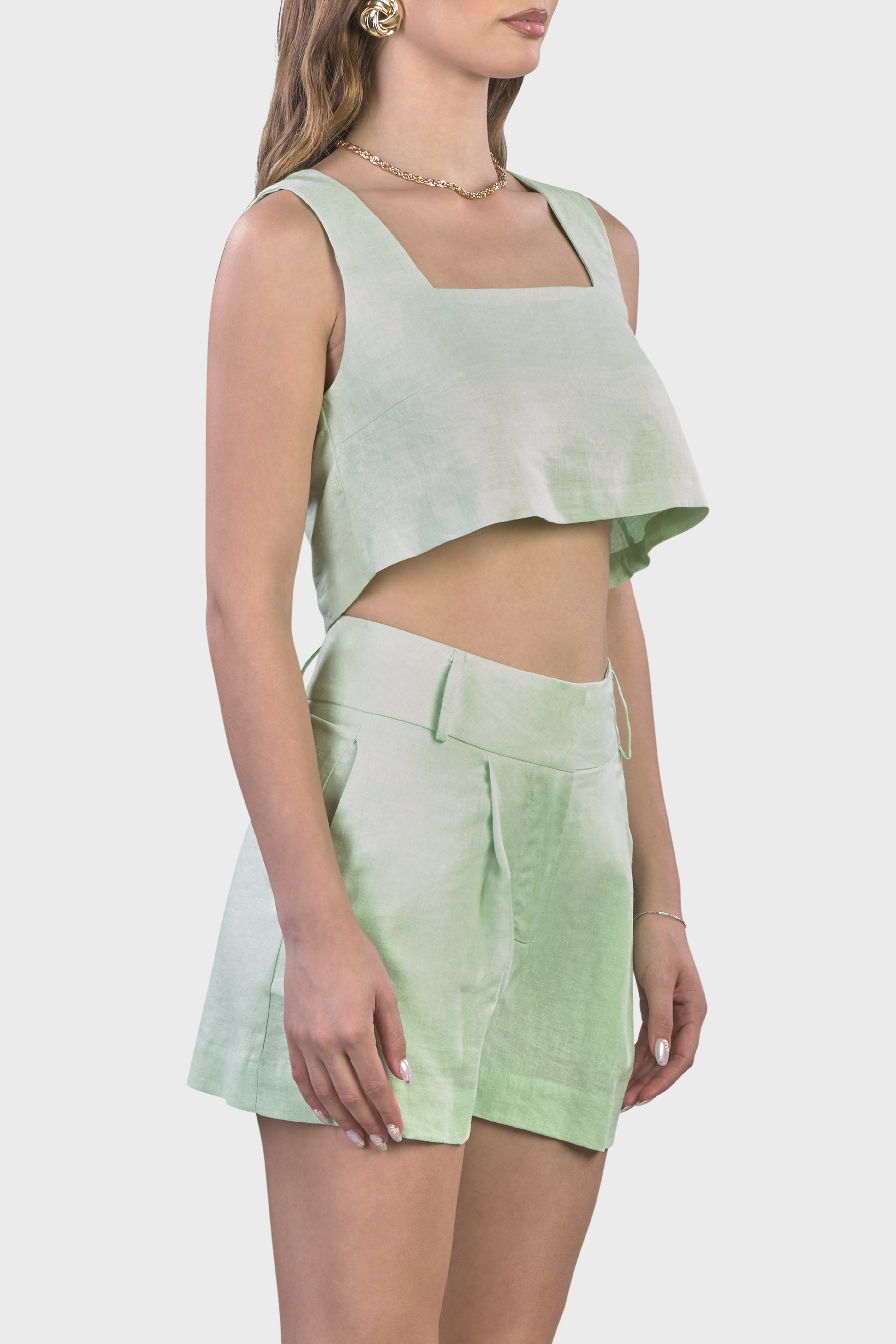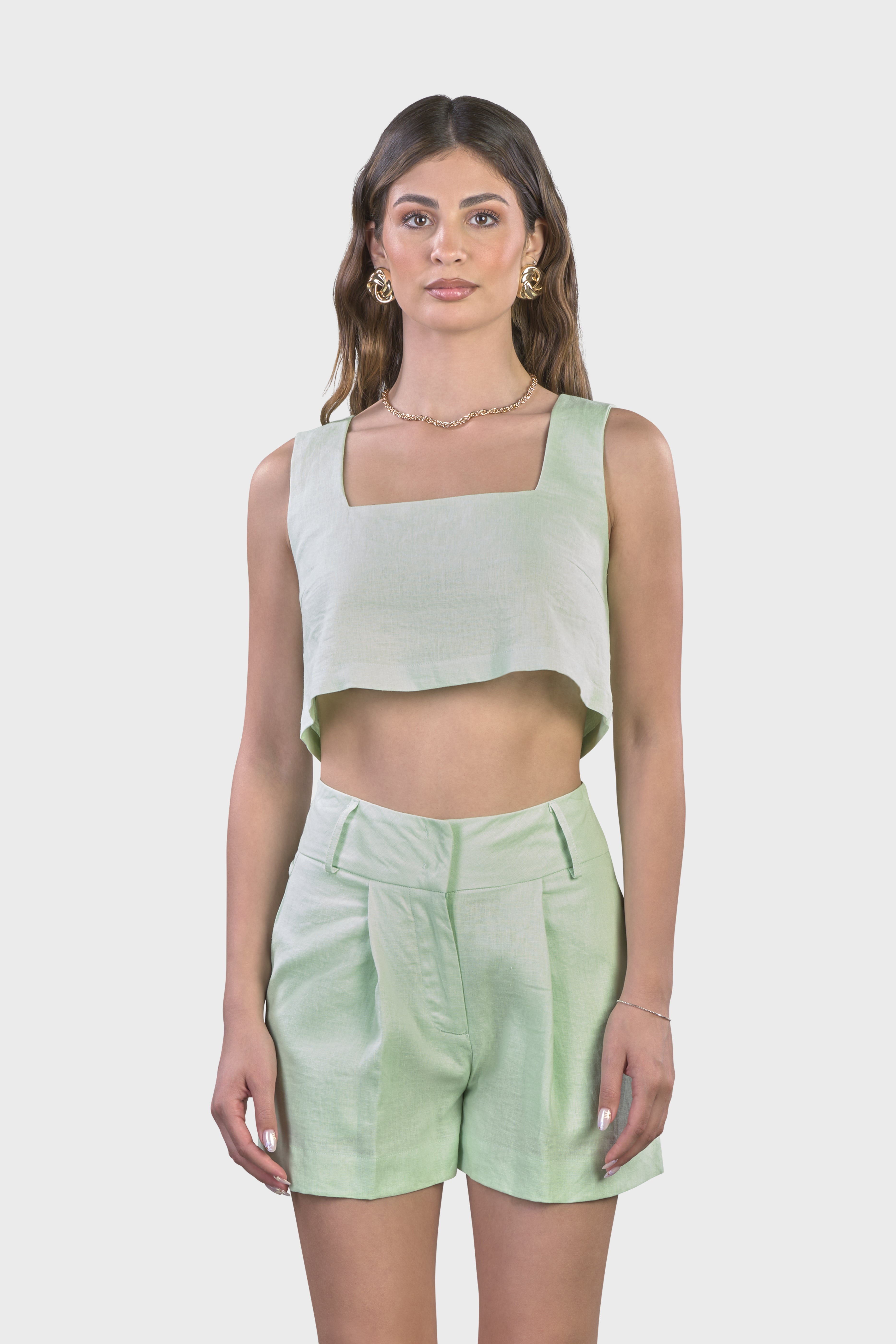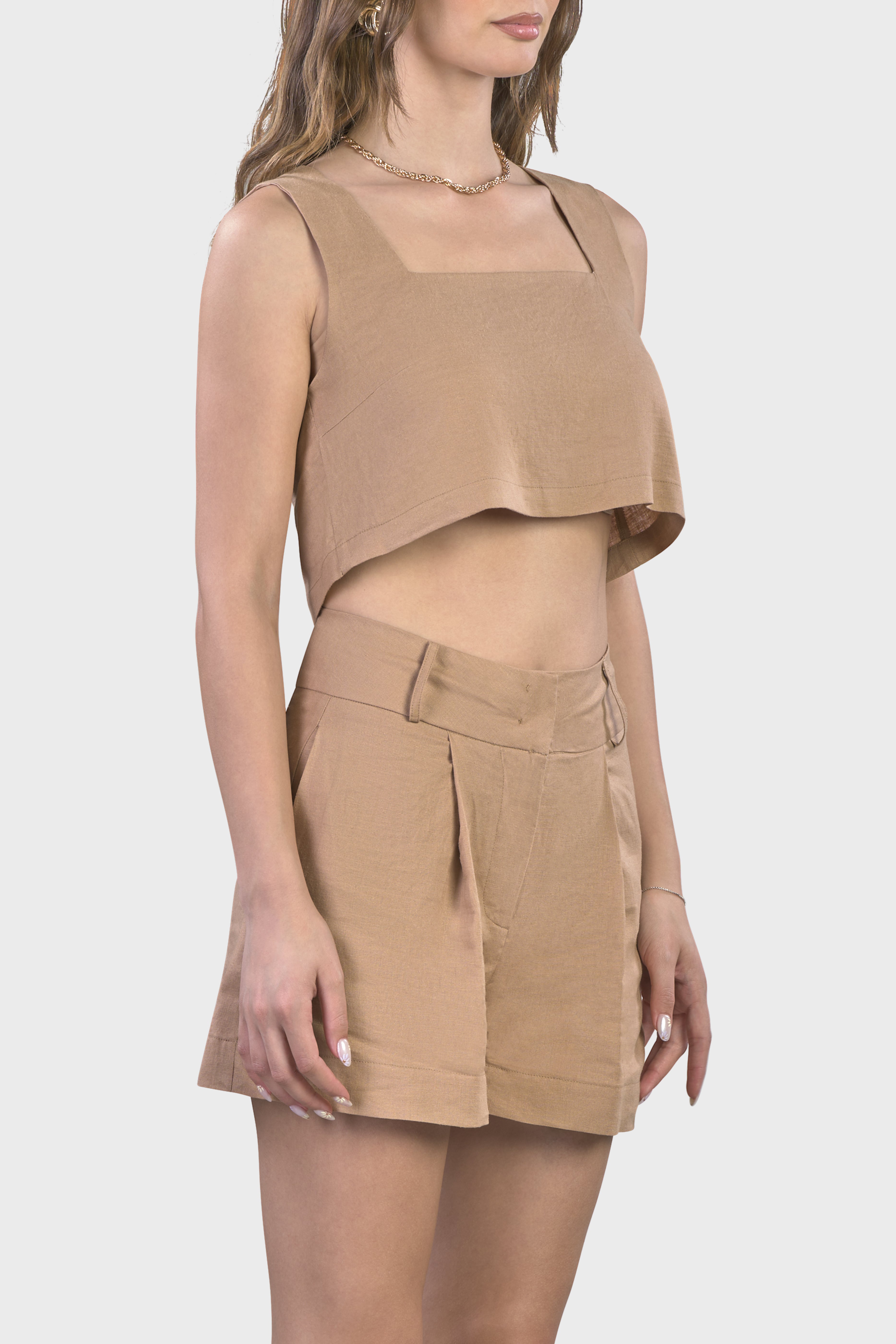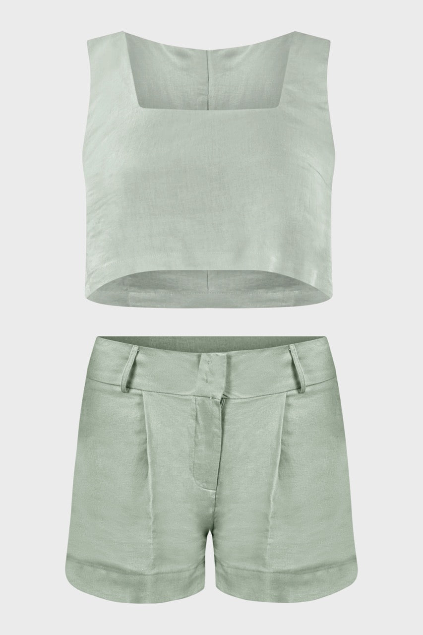 Le linee raffinate di questo coordinato ci rimandano ad uno stile sartoriale dovuto dal top senza maniche dal taglio svasato adatto a tutte le tipologie di corpo e dagli shorts vita alta,dalla vestibilità morbida e leggermente svasata.