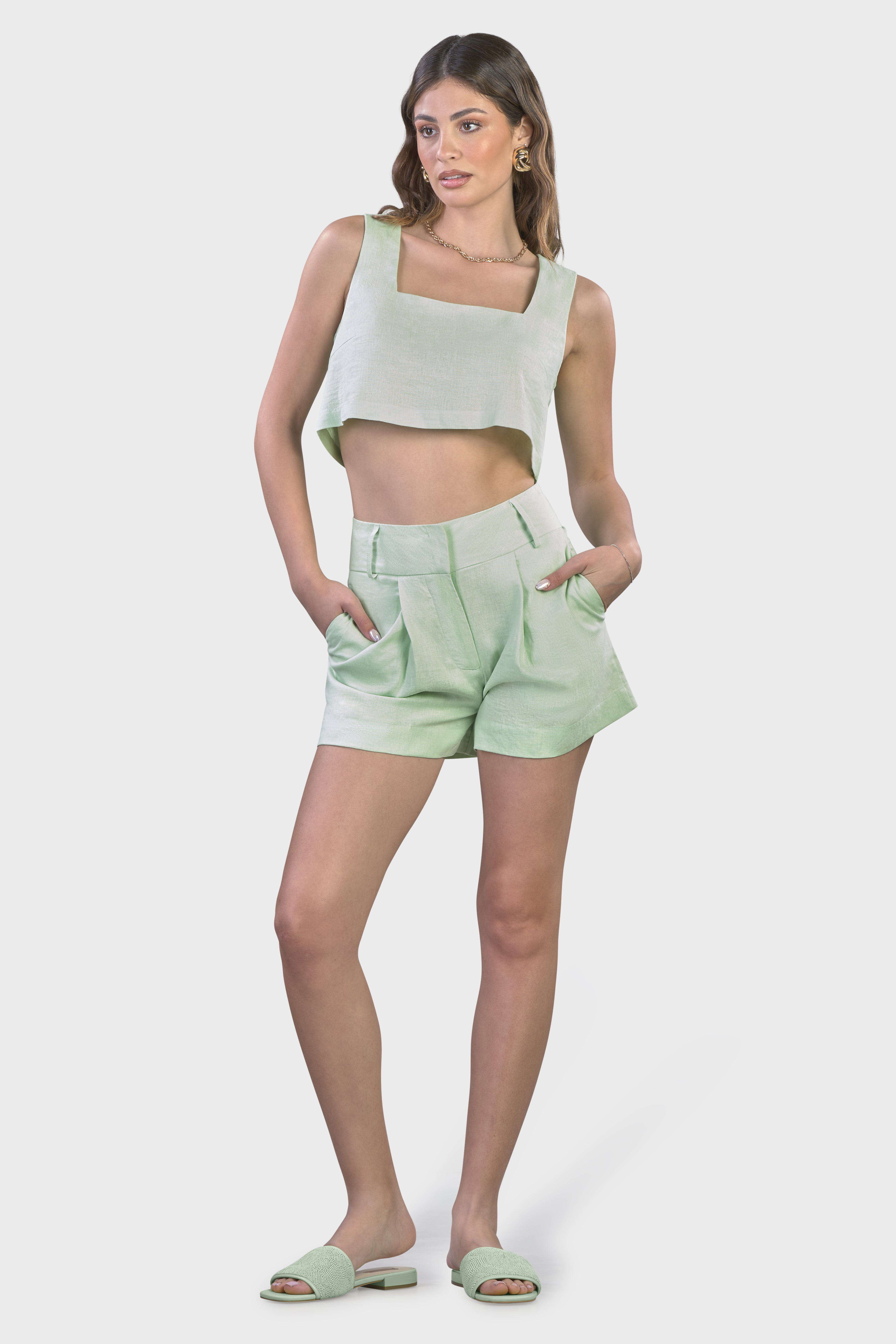 A completare il look, sono gli shorts con pences profonde rivolte verso l’esterno.Il coordinato è adatto per un look pratico, ma pur sempre chic, ideale da indossare in