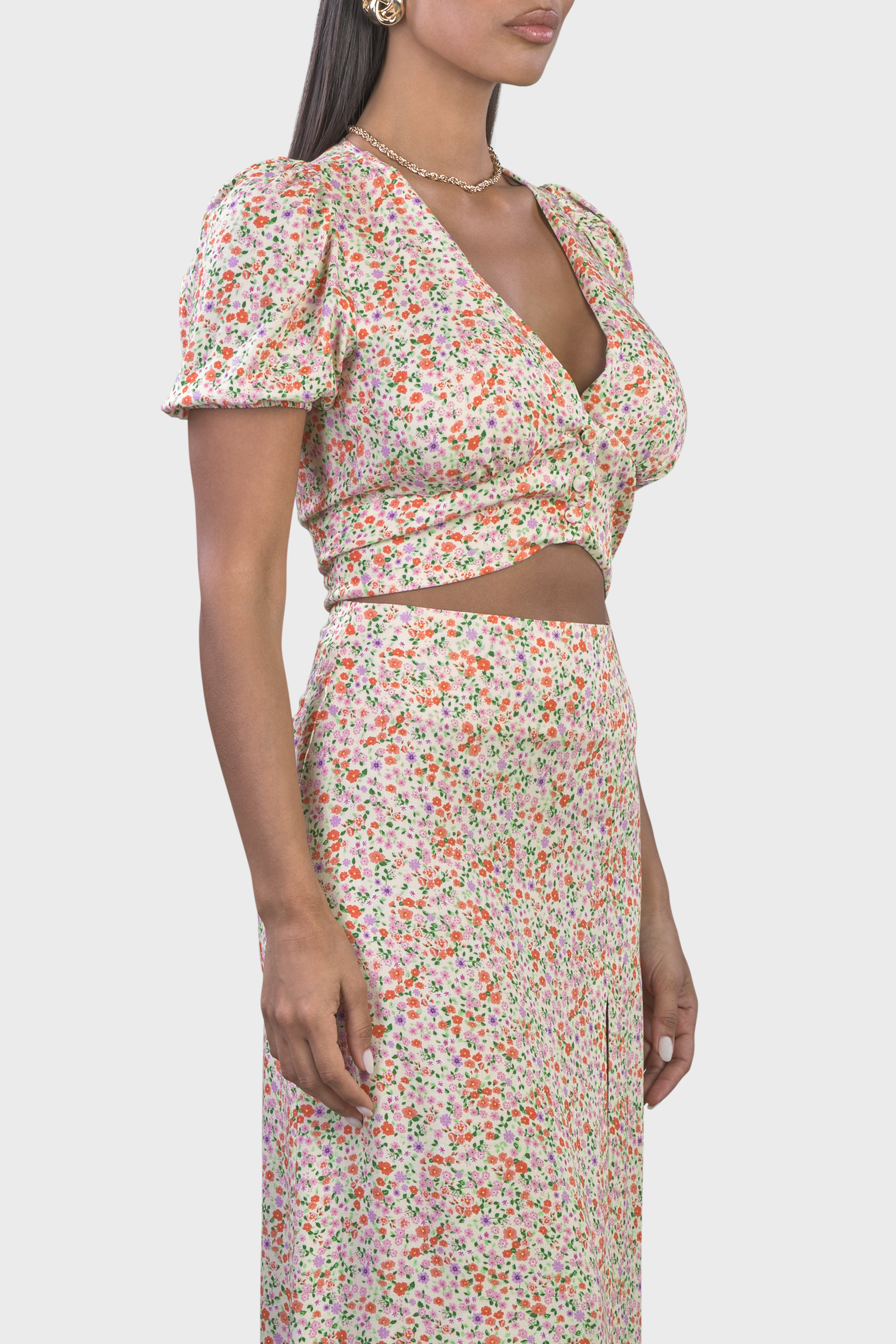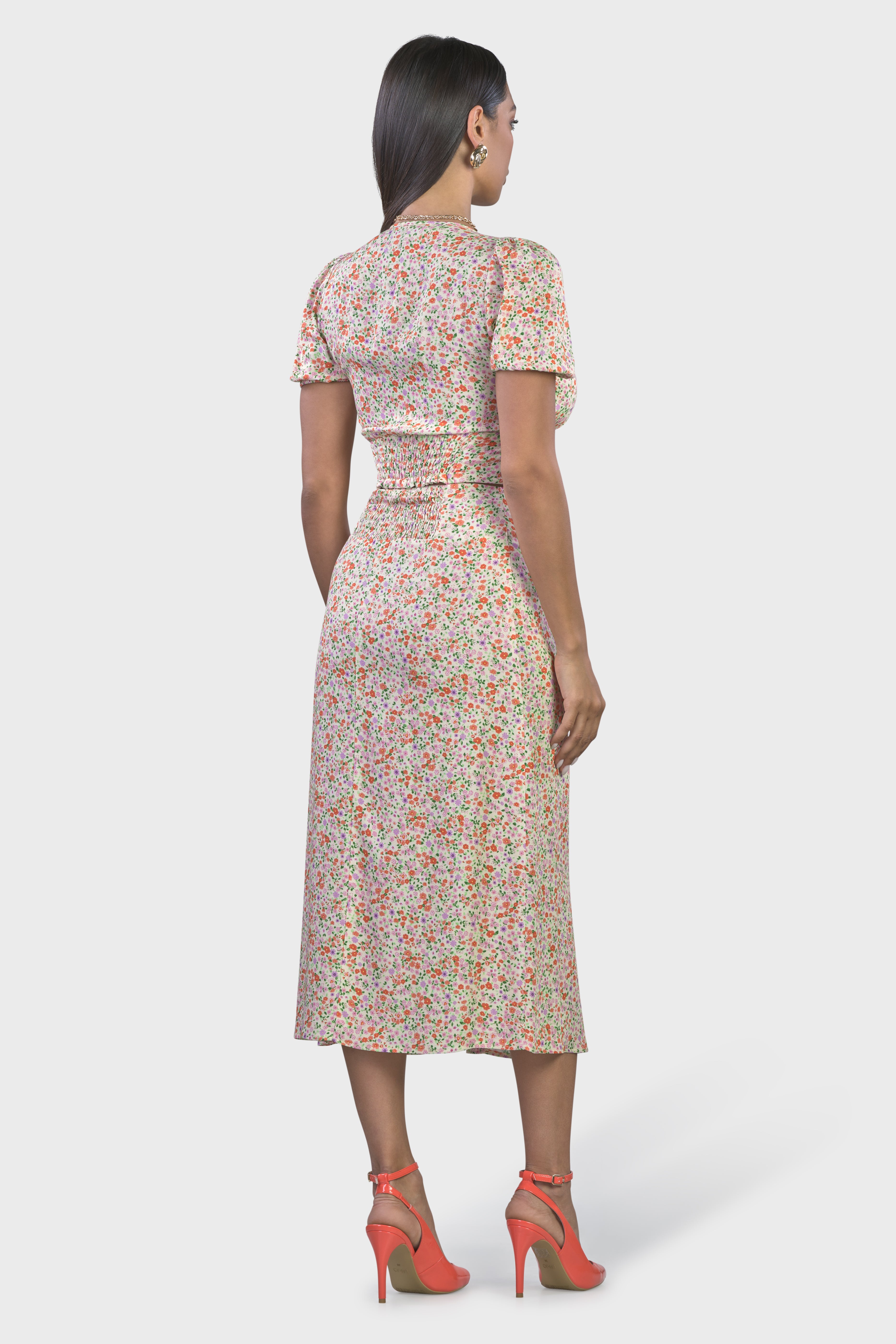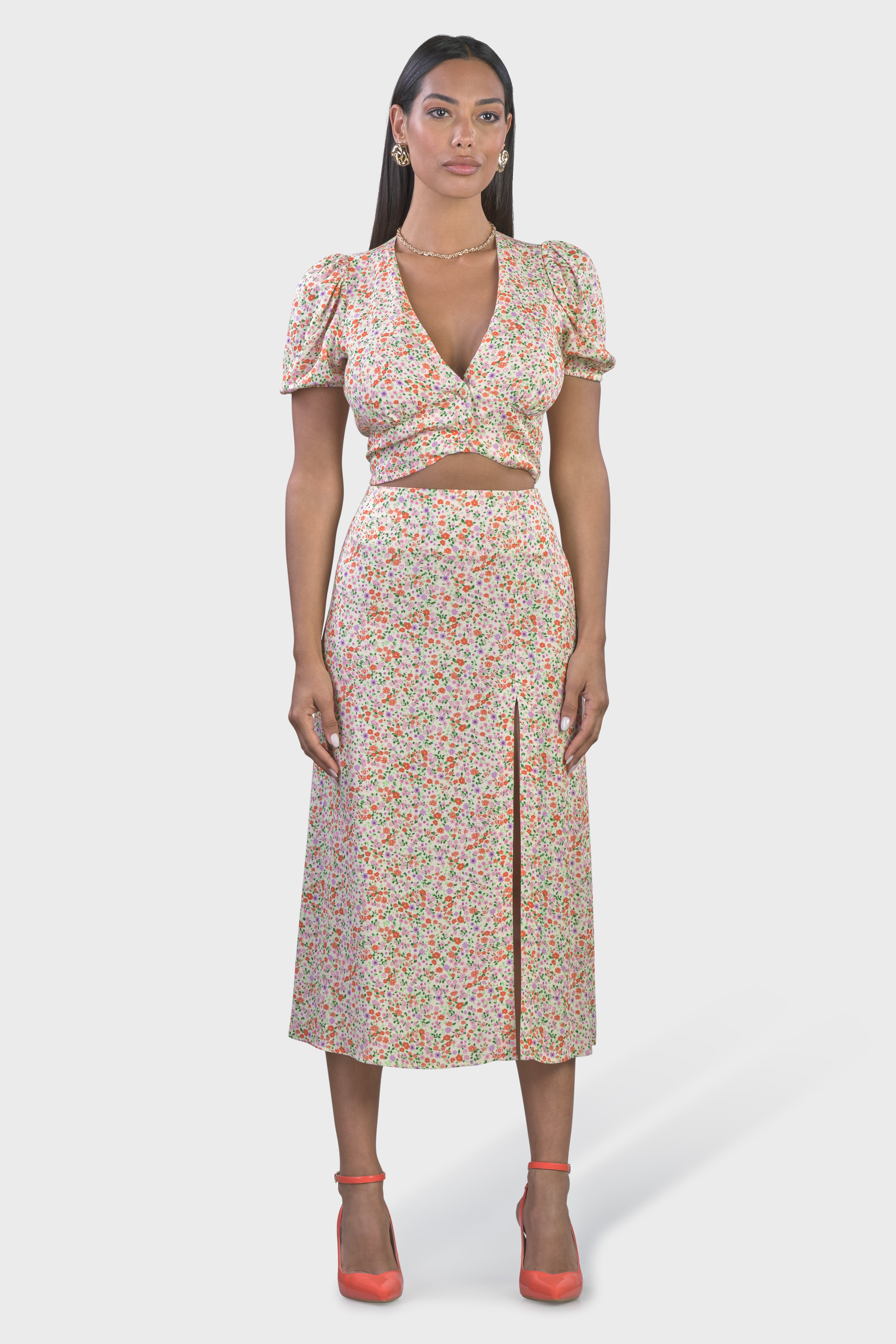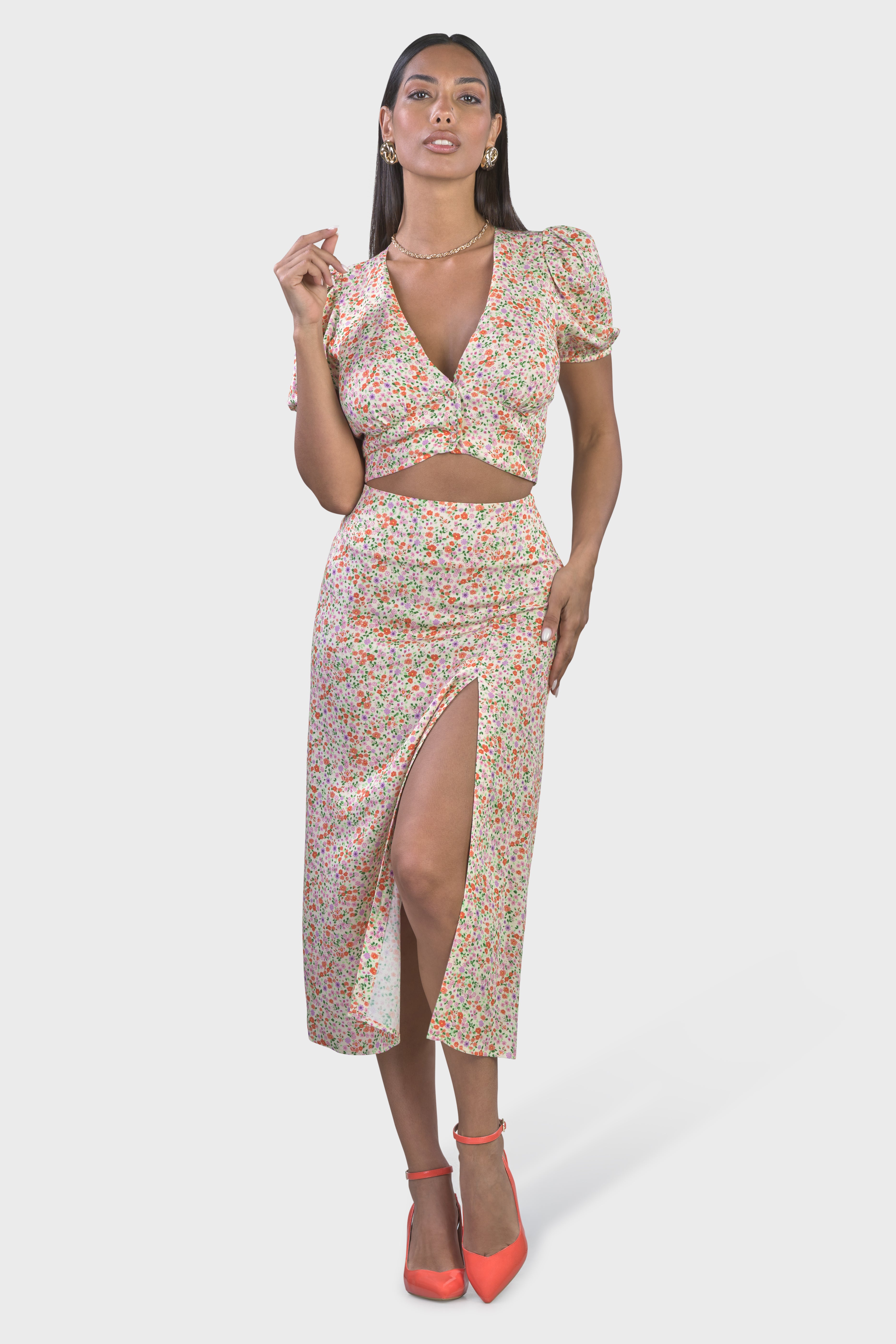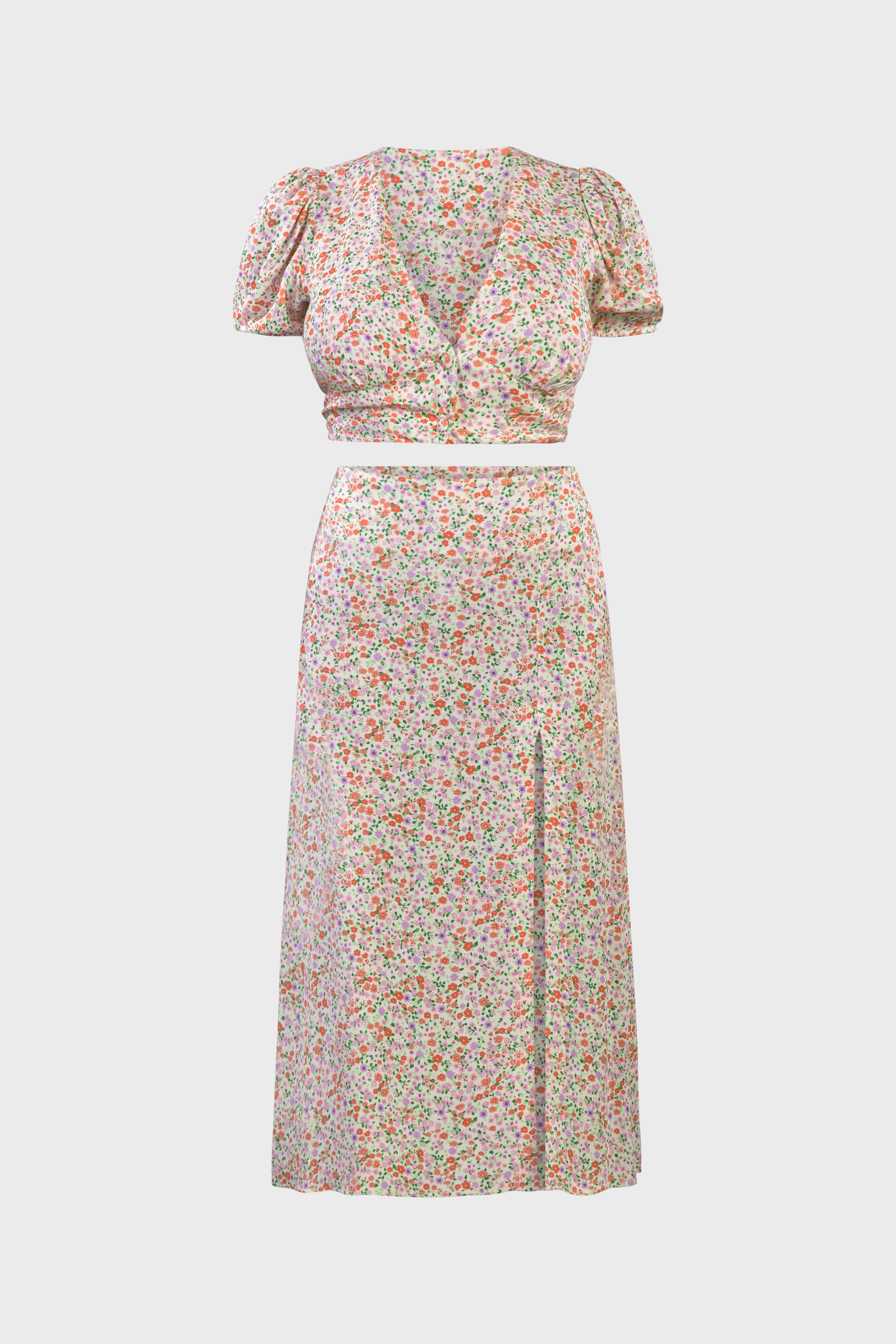 top dallo scollo a V e la manica a sbuffo e dalla gonna longuette con spacco,dalla vestibilità morbida. Realizzato in una romantica micro stampa floreale su crepe de chine di viscosa, tessuto dall’effetto crespo, che conferisce un effetto mosso, ondulato ma anche granuloso al tatto. Il top è caratterizzato dal taglio leggermente sblusato,impreziosito con bottoncini rivestiti e dal punto smock sul retro. A completare il look, è la gonna con spacco laterale, con punto stock sul retro e con cerniera nascosta nel fianco per una rifinitura sartoriale. Il coordinato è adatto per un look pratico, ma pur sempre chic, ideale da indossare in città,ma anche per occasioni più sofisticate.