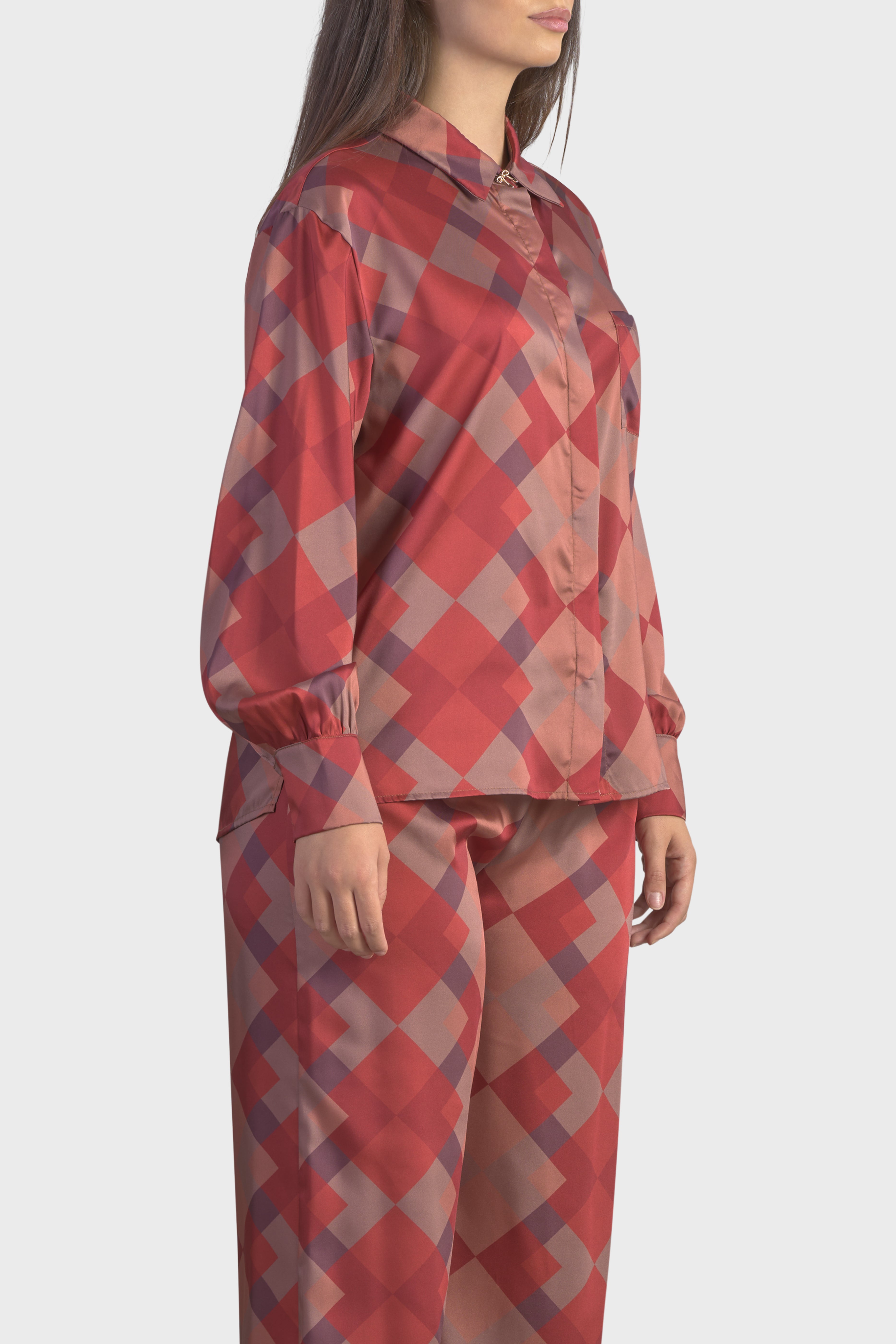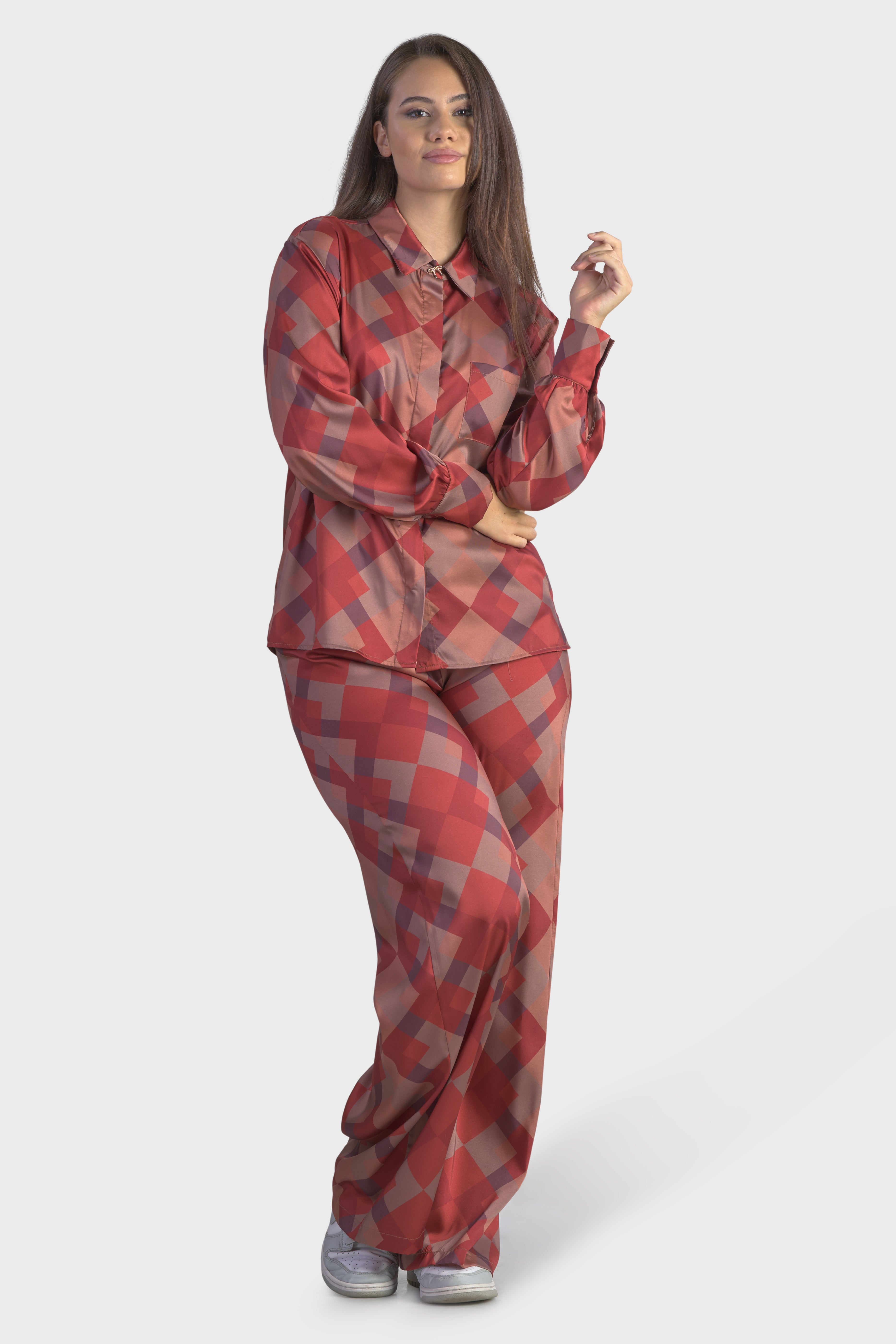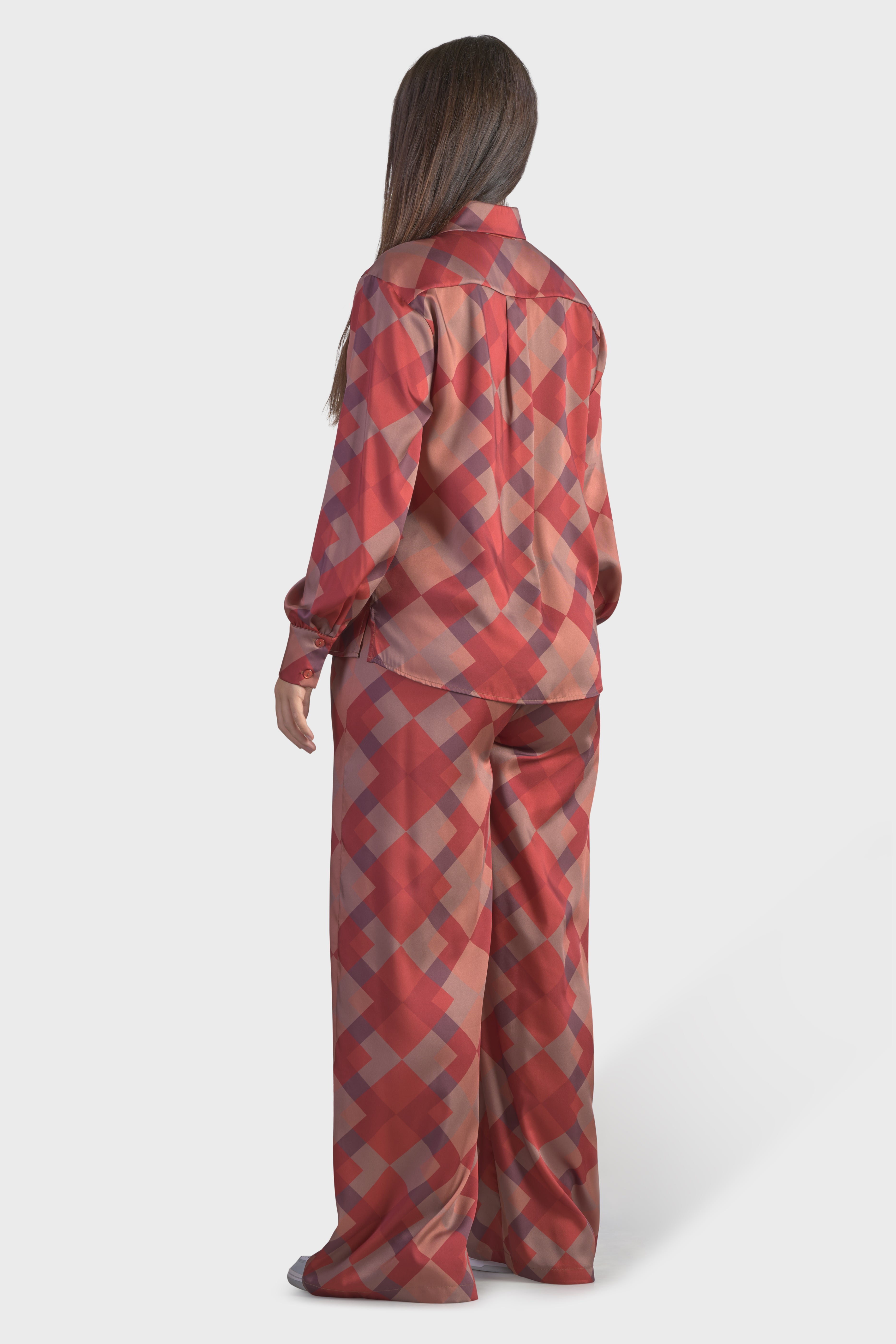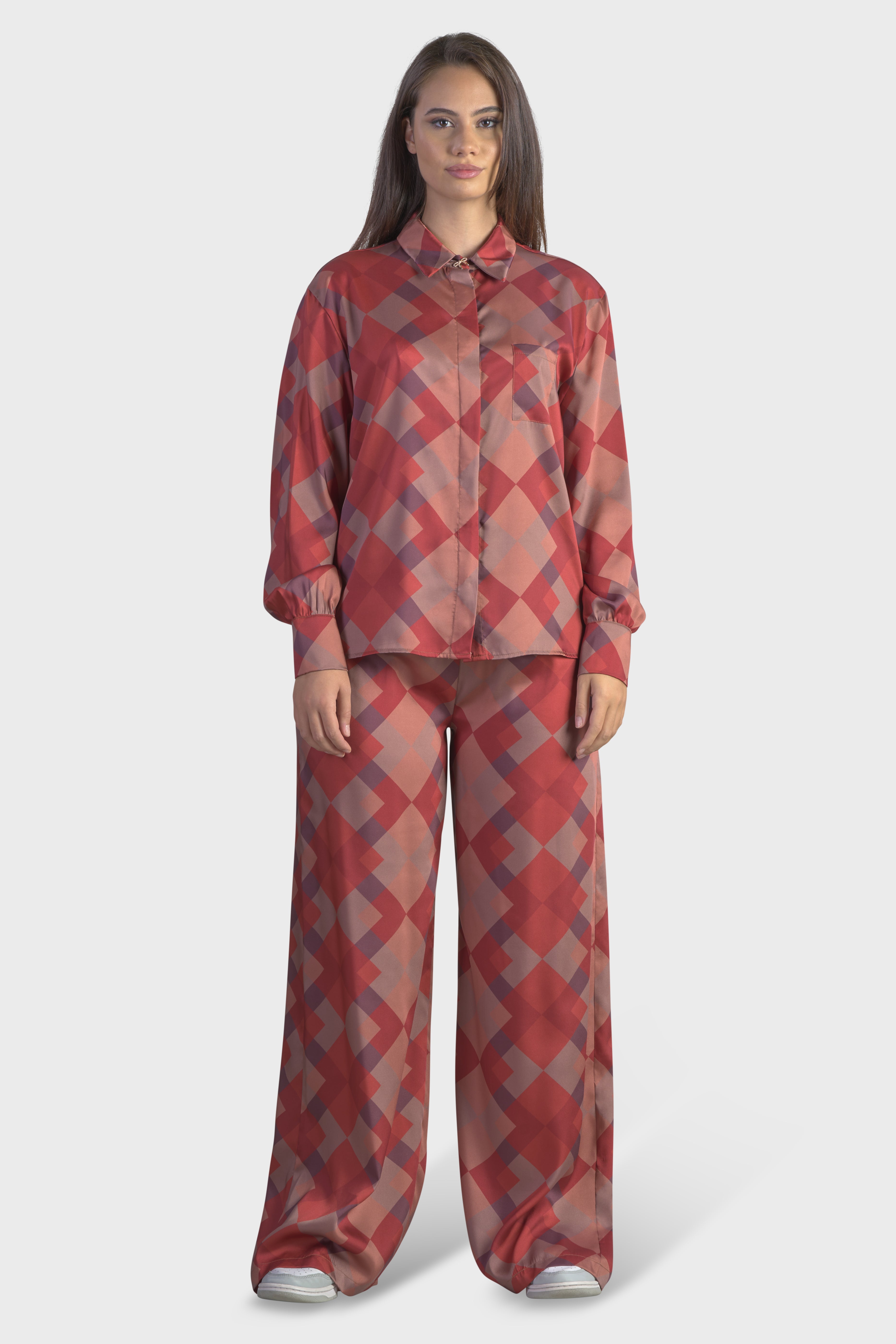 Le linee raffinate di questo coordinato, si distinguono per la loro delicatezza, conferendo una vestibilità lineare e confortevole. Realizzato in raso stampato, tessuto scivoloso e lucente, liscio al tatto. La stampa geometrica crea giochi di rombi in diverse forme e colori. La camicia dritta con abbottonatura all’inglese e colletto a punta trasmette stile ed eleganza. A completare il modello è il taschino sul davanti. Il pantalone è dettagliato dall’elastico in vita mentre la gamba scende dritta. Questo cord set è perfetto da indossare con facilità nel quotidiano o di sera insieme ad un paio di tacchi e una mini borsa a tracolla.