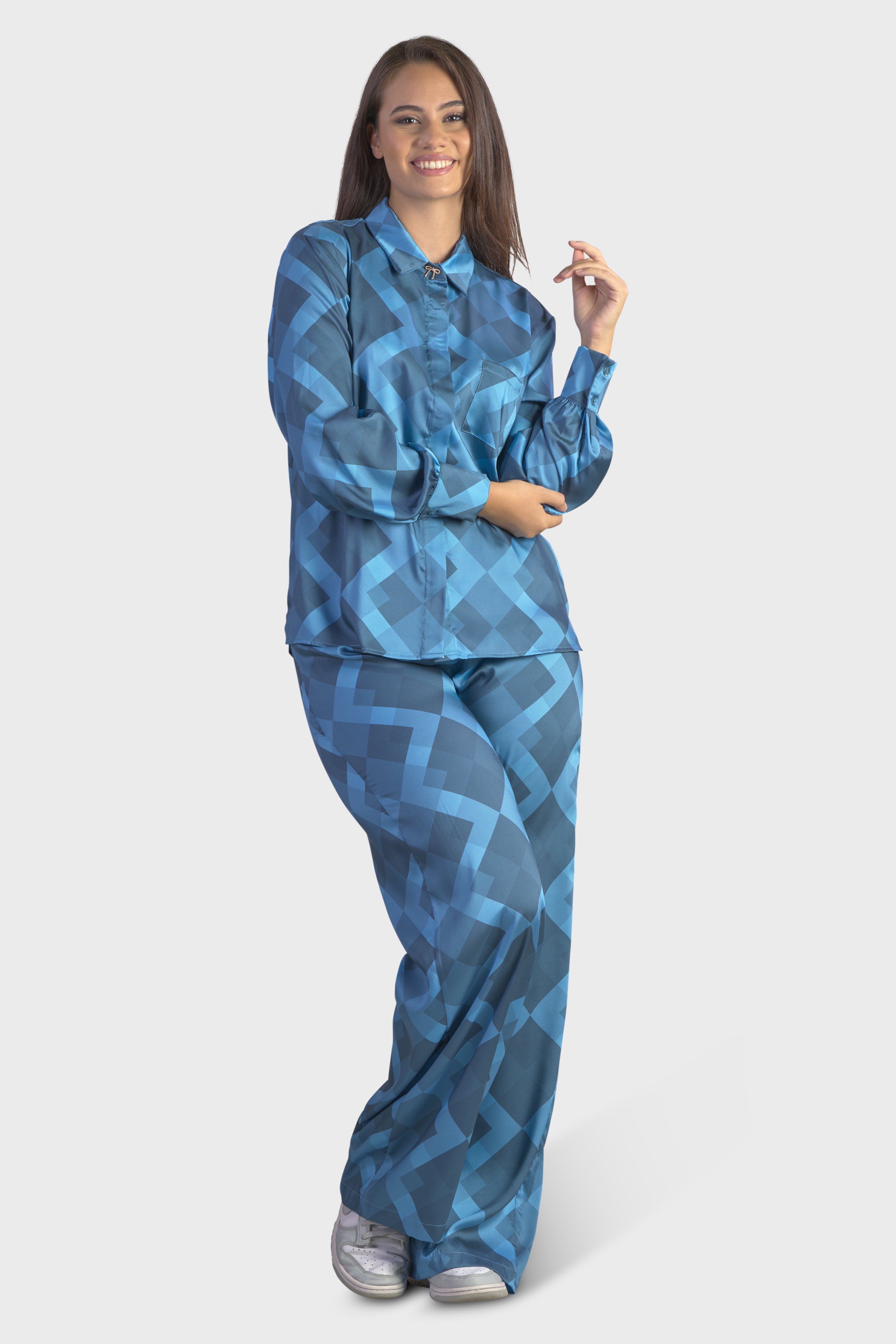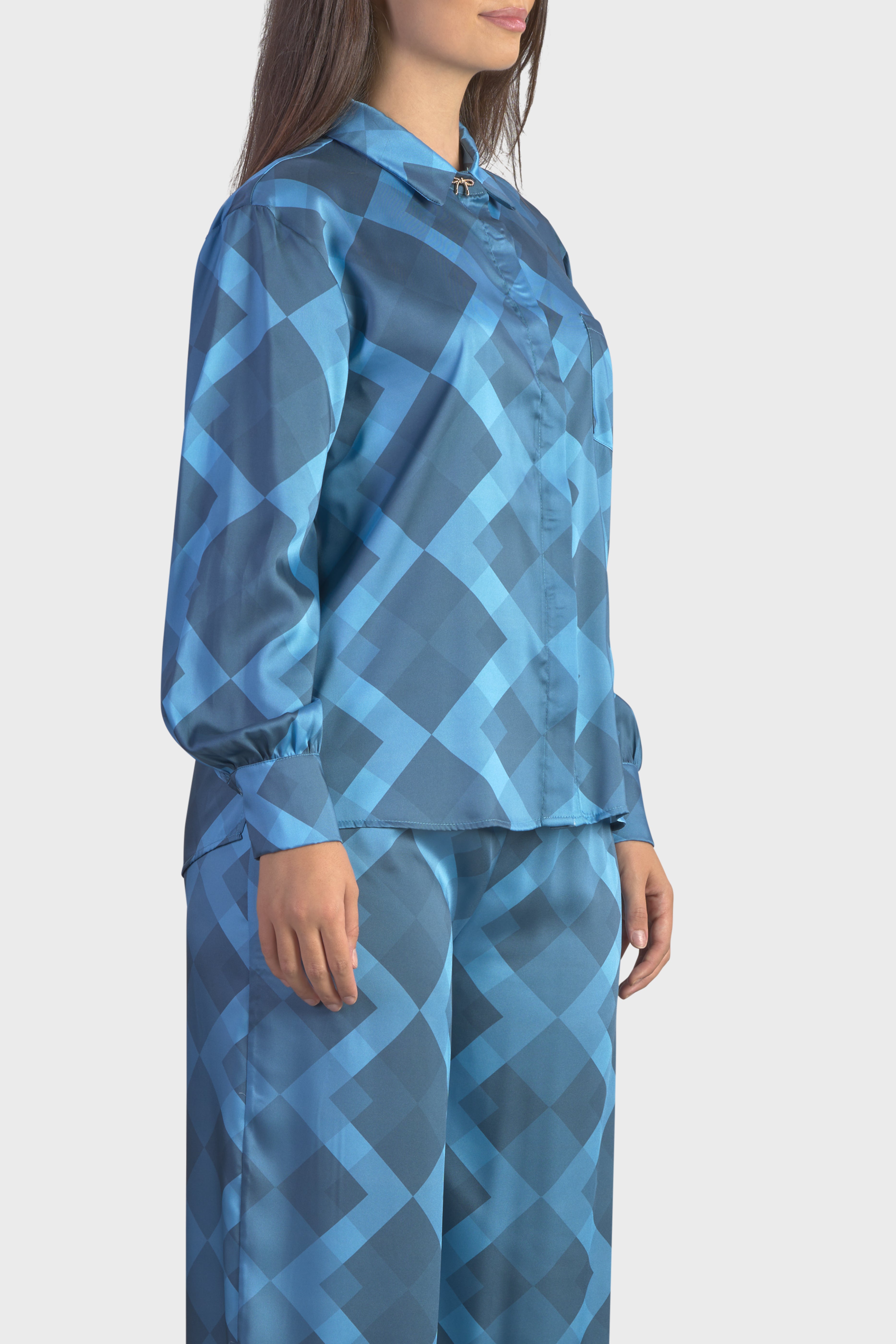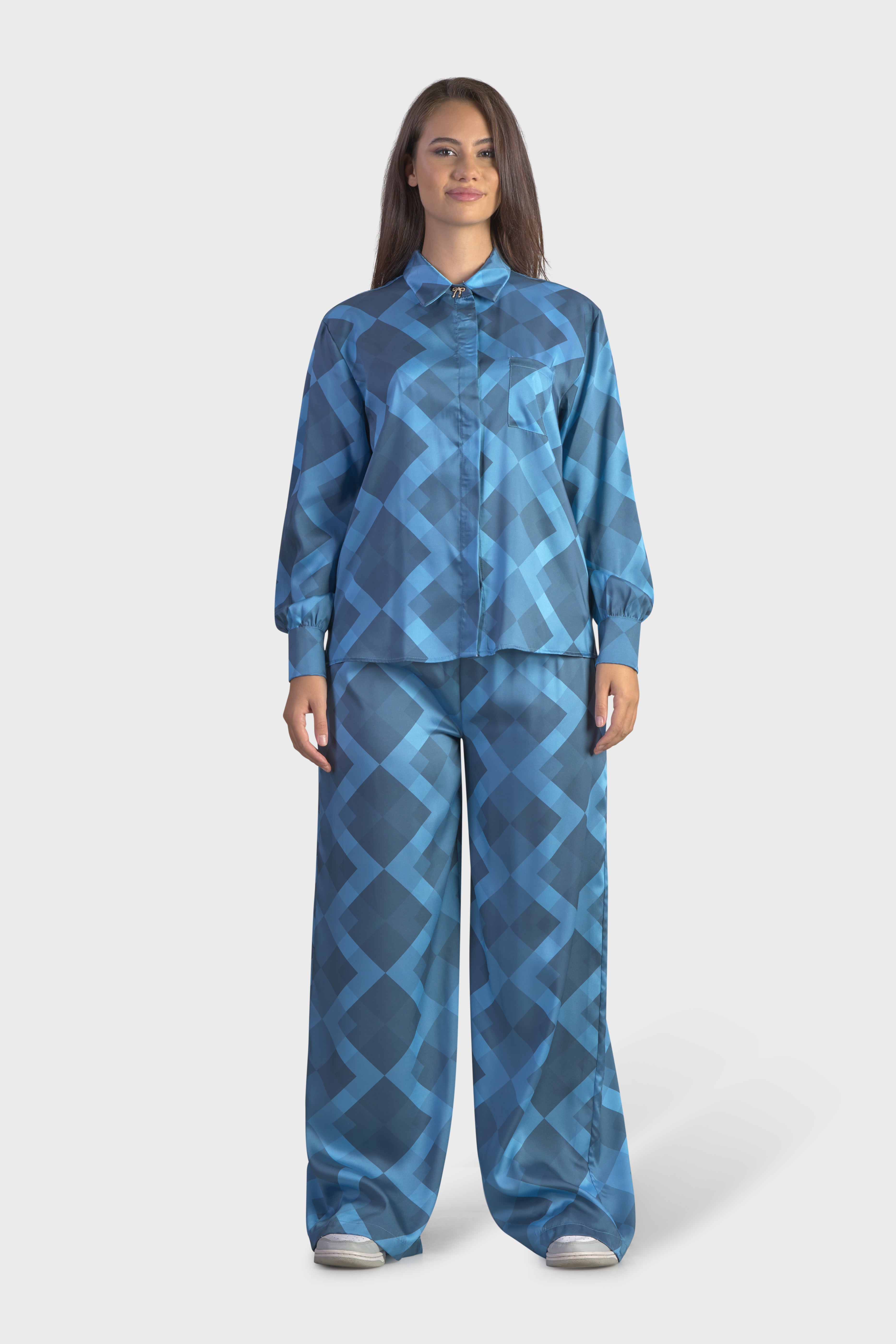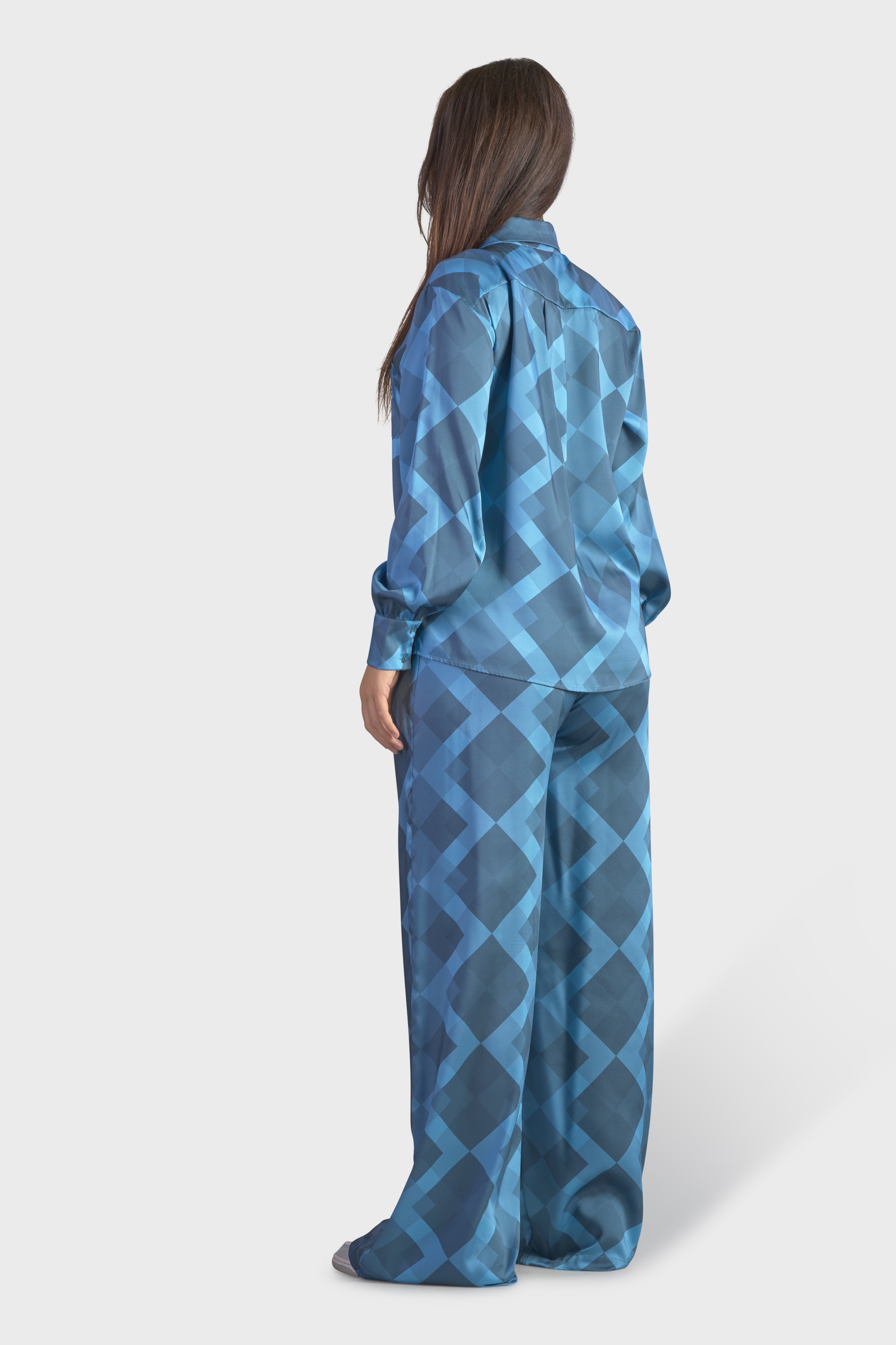 Le linee raffinate di questo coordinato, si distinguono per la loro delicatezza, conferendo una vestibilità lineare e confortevole. Realizzato in raso stampato, tessuto scivoloso e lucente, liscio al tatto. La stampa geometrica crea giochi di rombi in diverse forme e colori. La camicia dritta con abbottonatura all’inglese e colletto a punta trasmette stile ed eleganza. A completare il modello è il taschino sul davanti. Il pantalone è dettagliato dall’elastico in vita mentre la gamba scende dritta. Questo cord set è perfetto da indossare con facilità nel quotidiano o di sera insieme ad un paio di tacchi e una mini borsa a tracolla.