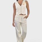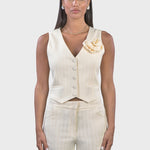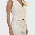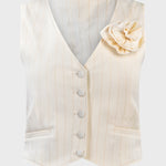 Il completo è composto dal gilet monopetto,non troppo scollato e ben strutturato impreziosito dai bottoni rivestiti nello stesso tessuto e la spilla a forma di rosa,l’emblema della collezione e dal pantalone stile 5 tasche con gamba dritta e chiusura con gancio nascosto.