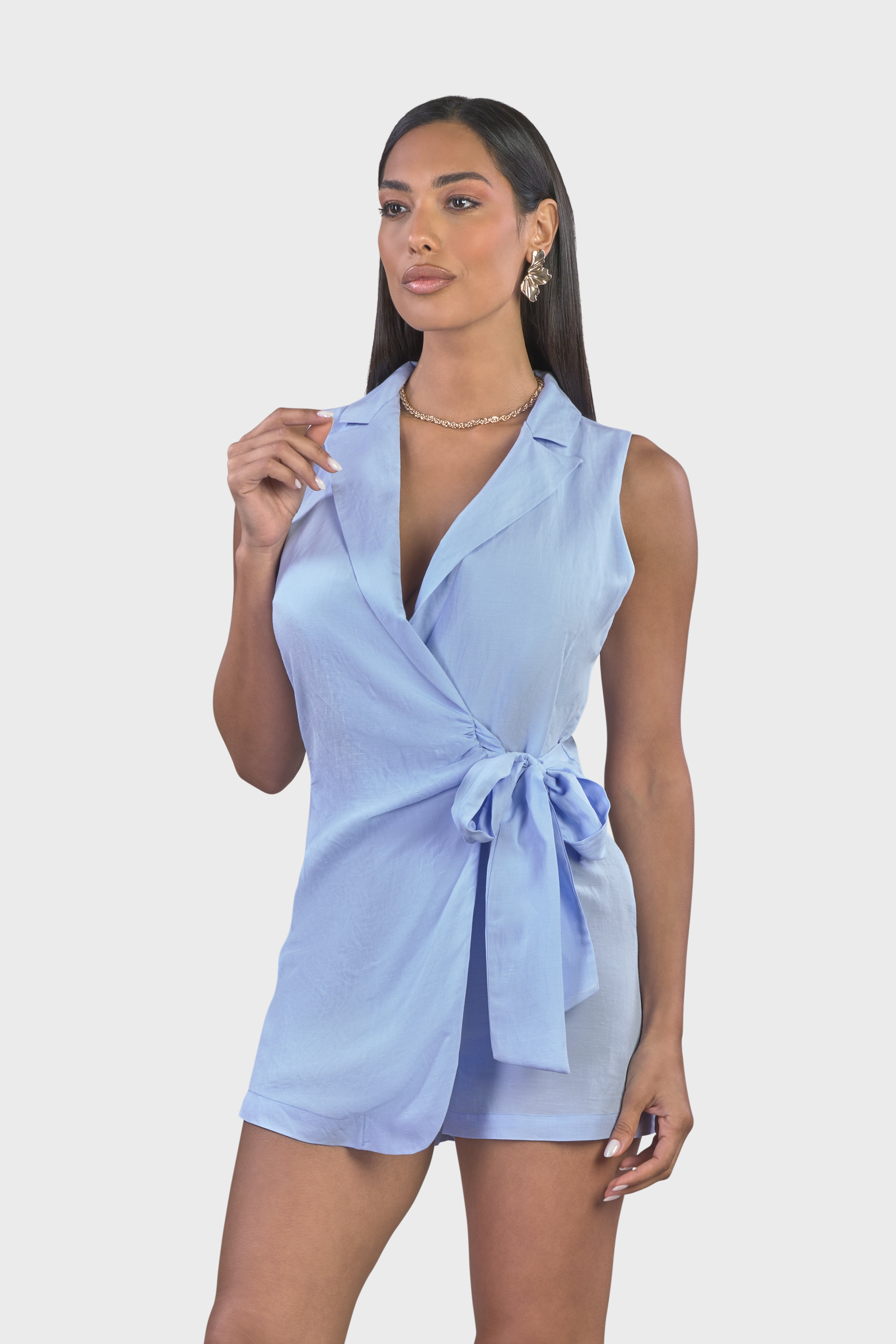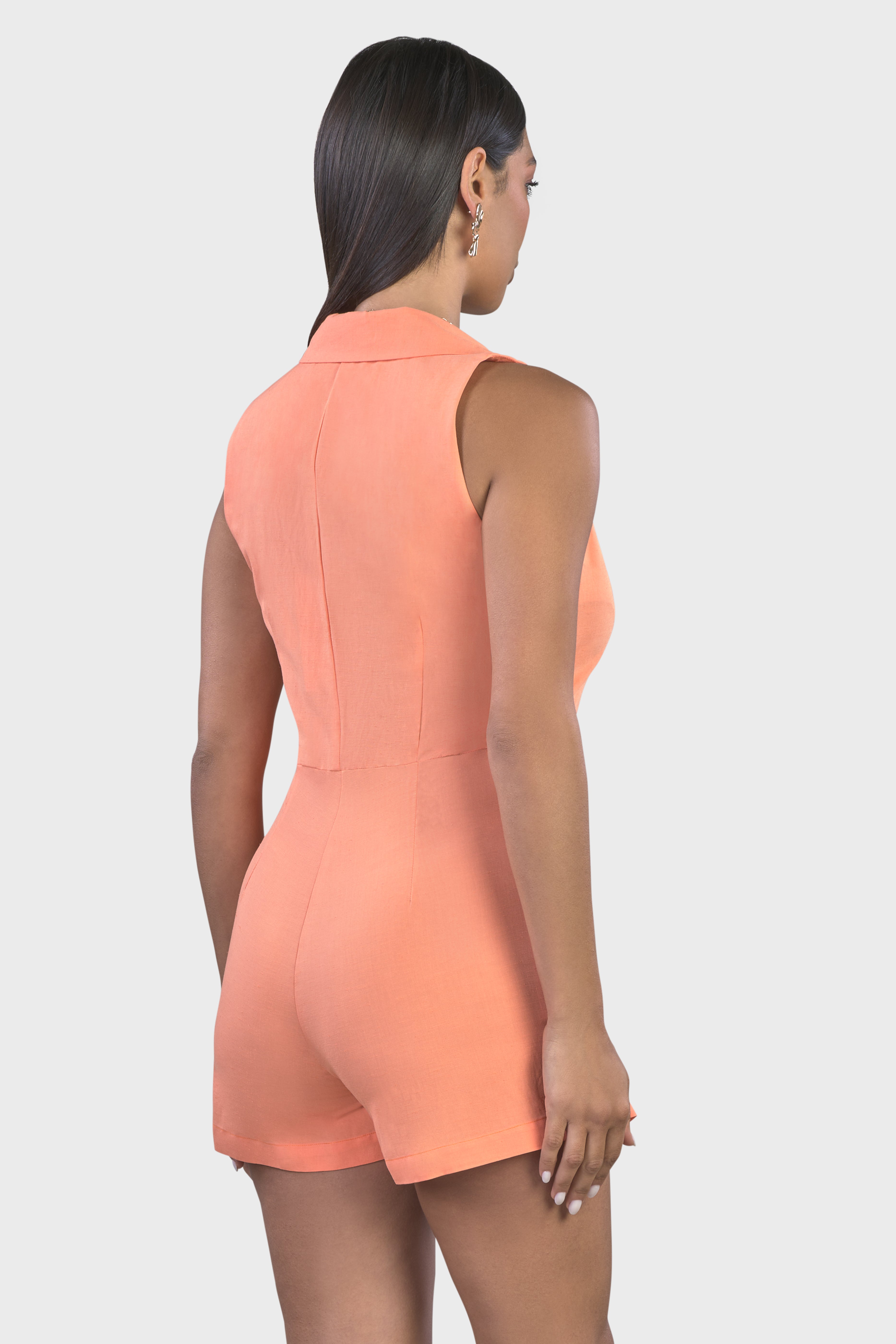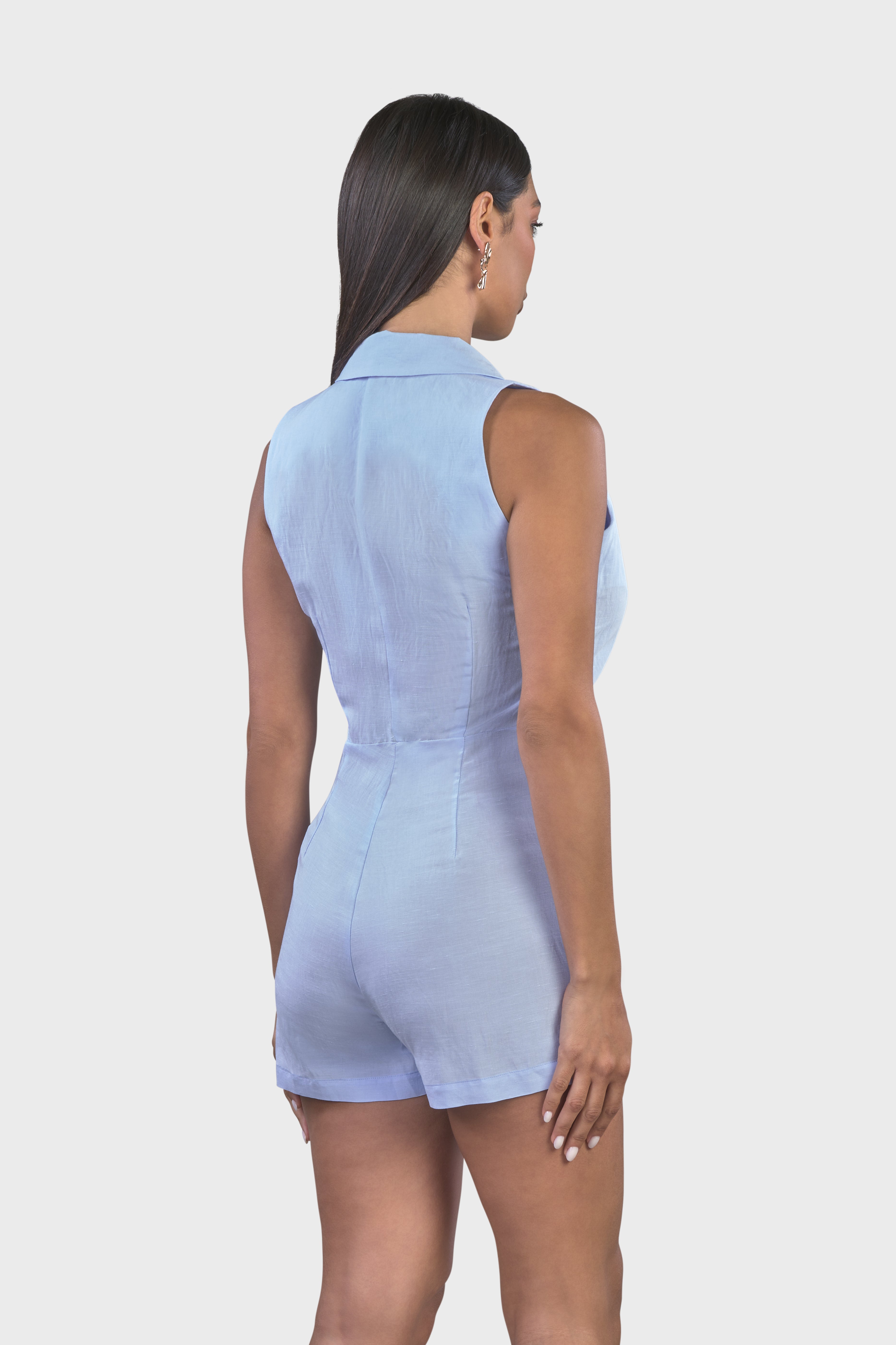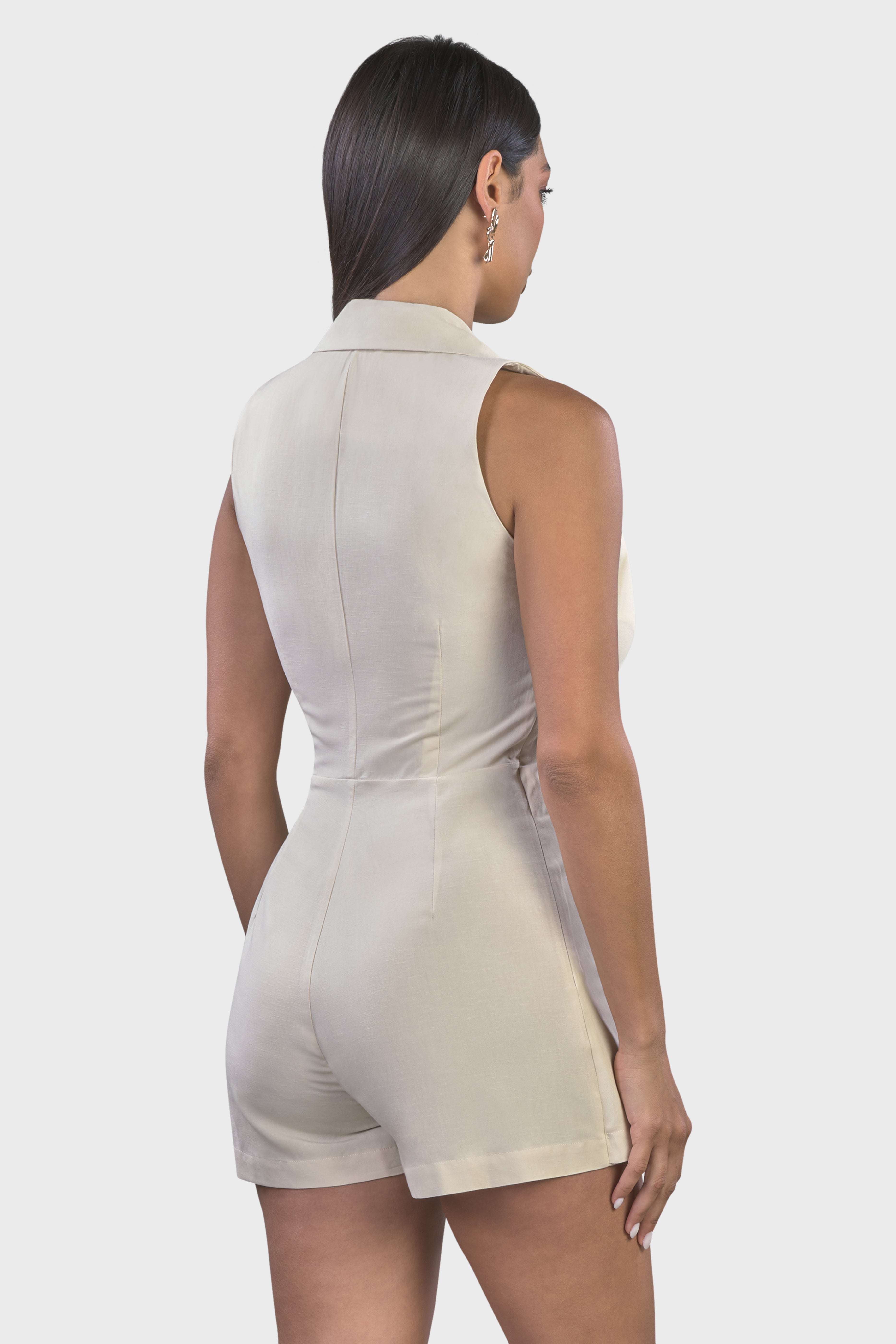 Le linee di questa tuta corta ci rimandano all’eleganza di un blazer, ma allo stesso tempo, in grado di conferire praticità, grazie allo shorts sottostante. Realizzato in un morbido misto lino, tessuto che dona freschezza. Il modello è caratterizzato dal revers e dall’abbottonatura annodata sul davanti. Il capo è completato dalla cerniera nascosta laterale, per una maggiore rifinitura. La tuta intera si distingue per la sua versatilità, adattandosi a diverse situazioni grazie alla sua natura “one-piece”. È particolarmente pratica per chi ha poco tempo o preferisce un look senza sforzo, in quanto elimina la necessità di coordinare diversi pezzi d’abbigliamento.