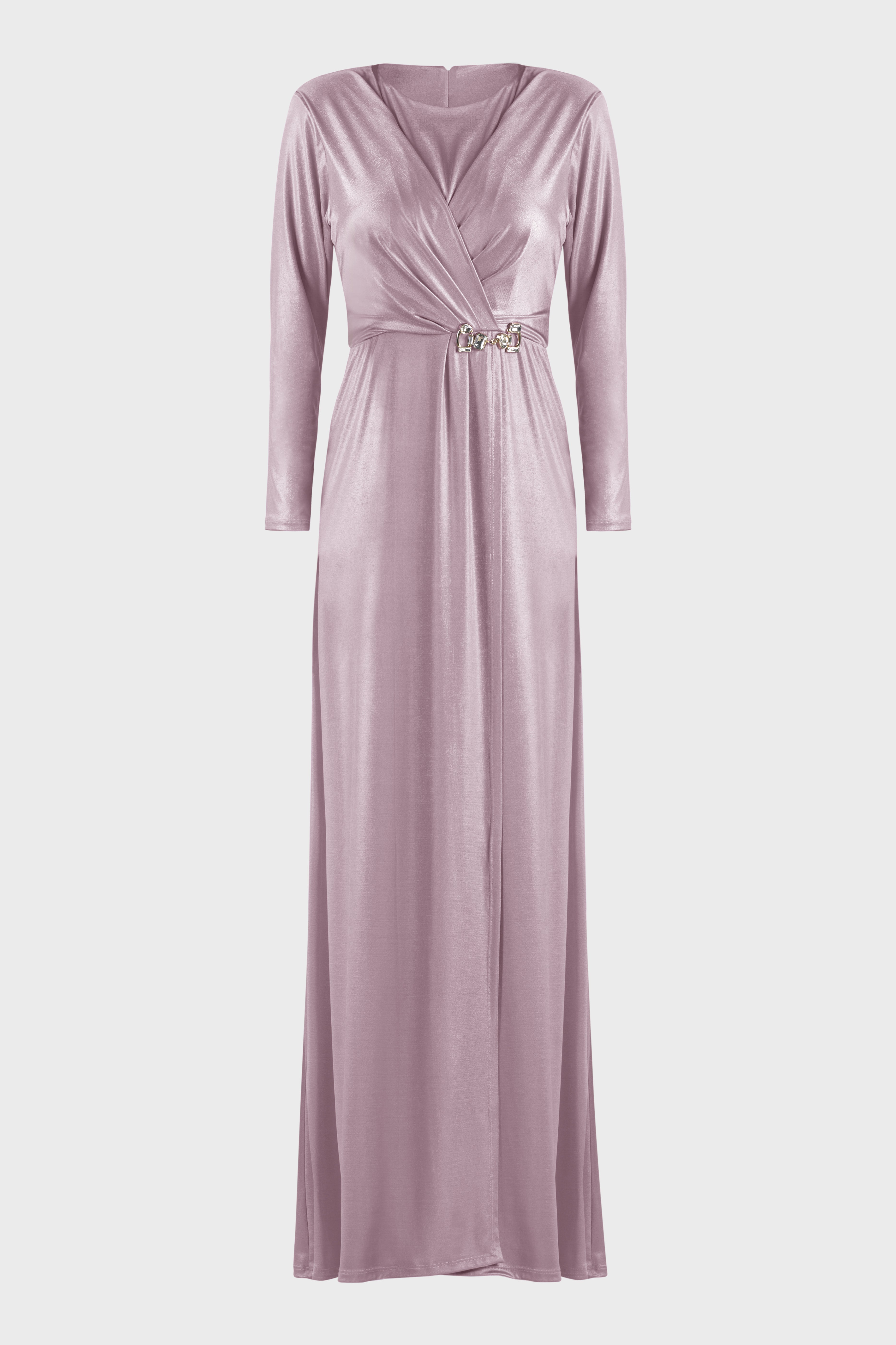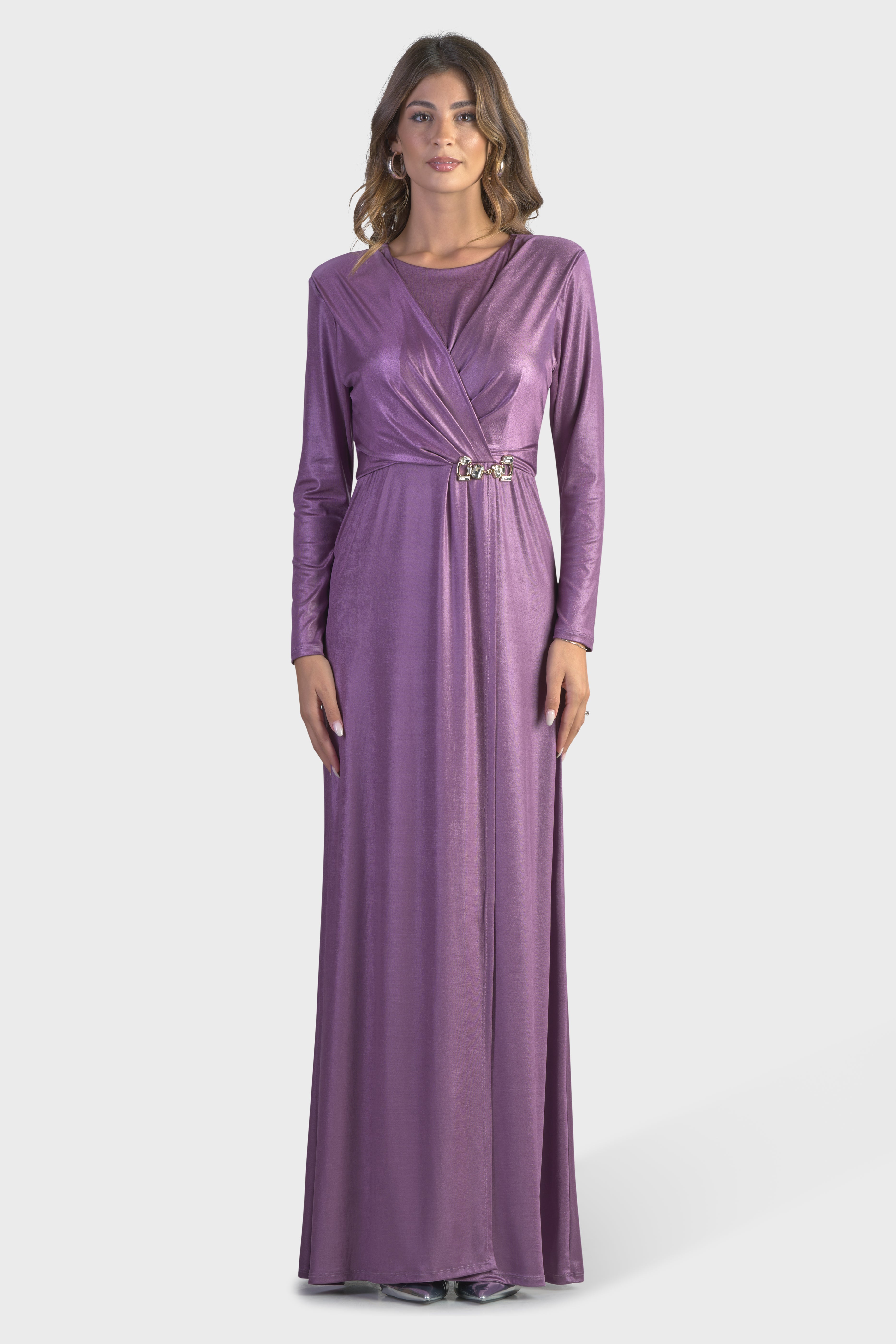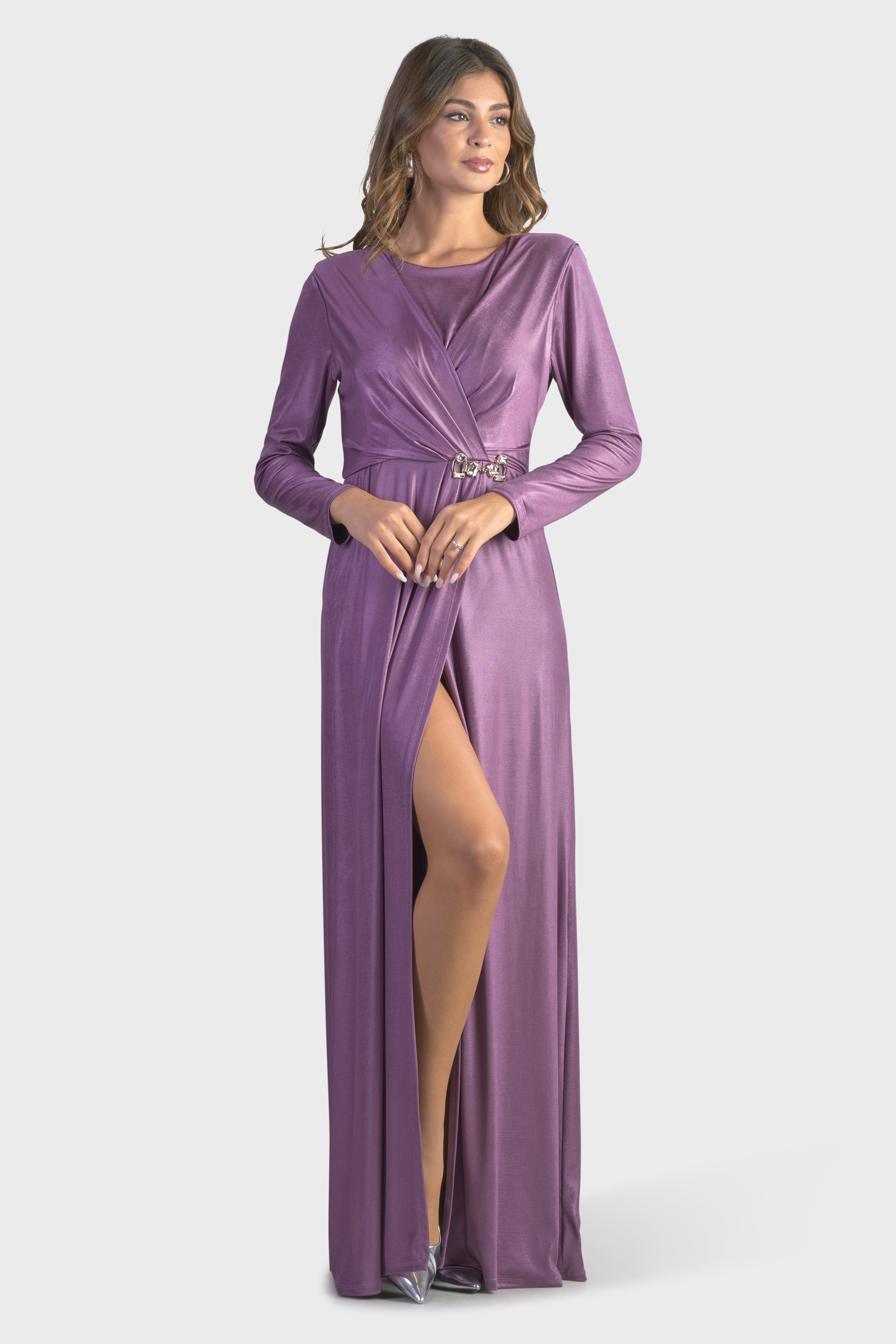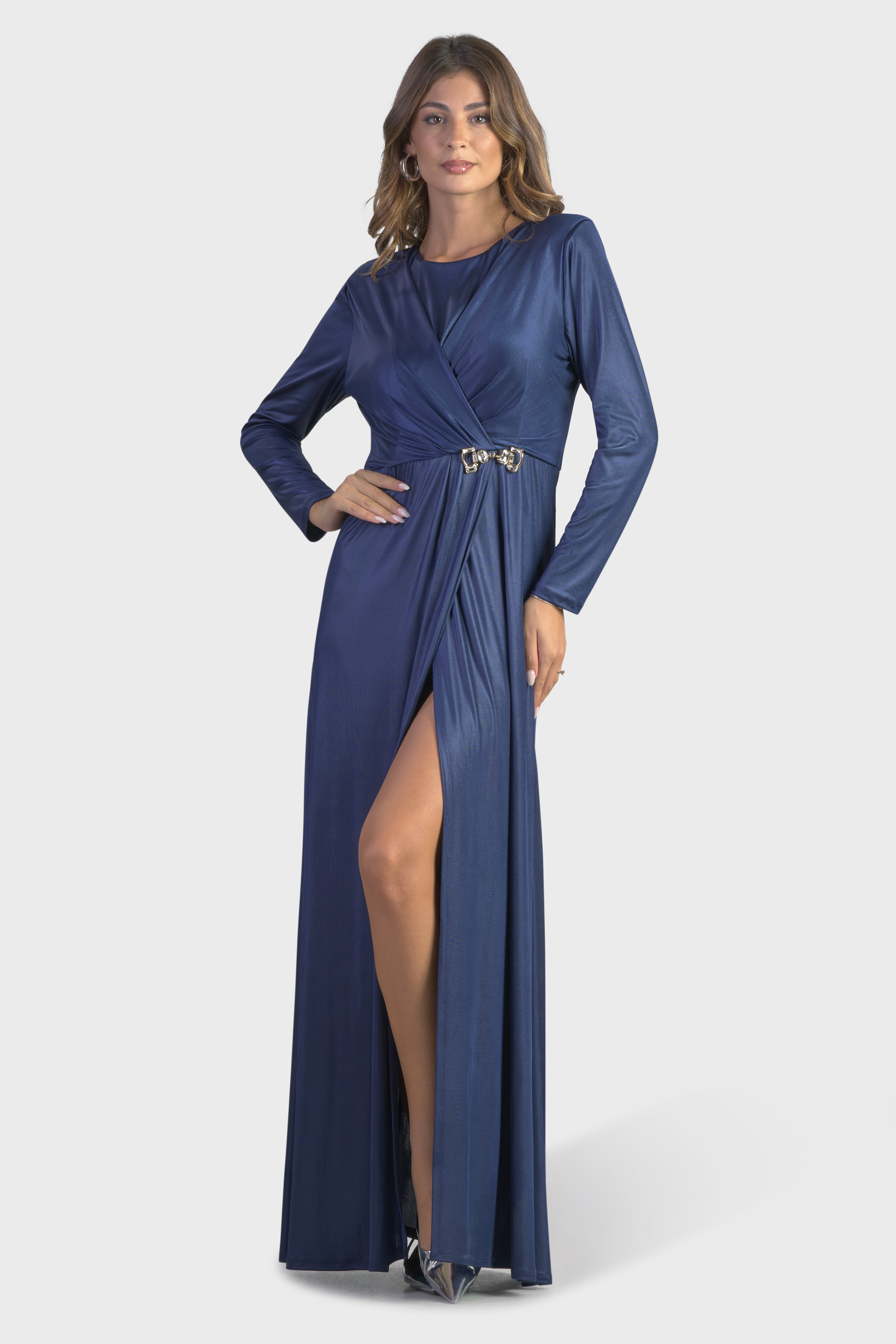 Quest’abito lungo a girocollo è il mix perfetto di drammaticità ed eleganza, ideale per chi vuole farsi notare. Realizzato in un tessuto elasticizzato dall’aspetto scintillante, in grado di catturare la luce in modo seducente. Il modello è caratterizzato dal drappeggio sul davanti che culmina nel taglio in vita, impreziosito dall’accessorio dorato sul fianco. La gonna con apertura a portafoglio e alto spacco diagonale aggiunge un tocco di sensualità, rivelando la gamba con grazia. Nella parte sottostante, quest’abito è rifinito con una chiusura a body, per offrire una maggiore coprenza. Infine sul retro presenta una chiusura con cerniera nascosta. Perfetto per occasioni di prestigio, questo abito è pensato per la donna che ama essere al centro dell'attenzione con stile e sicurezza.