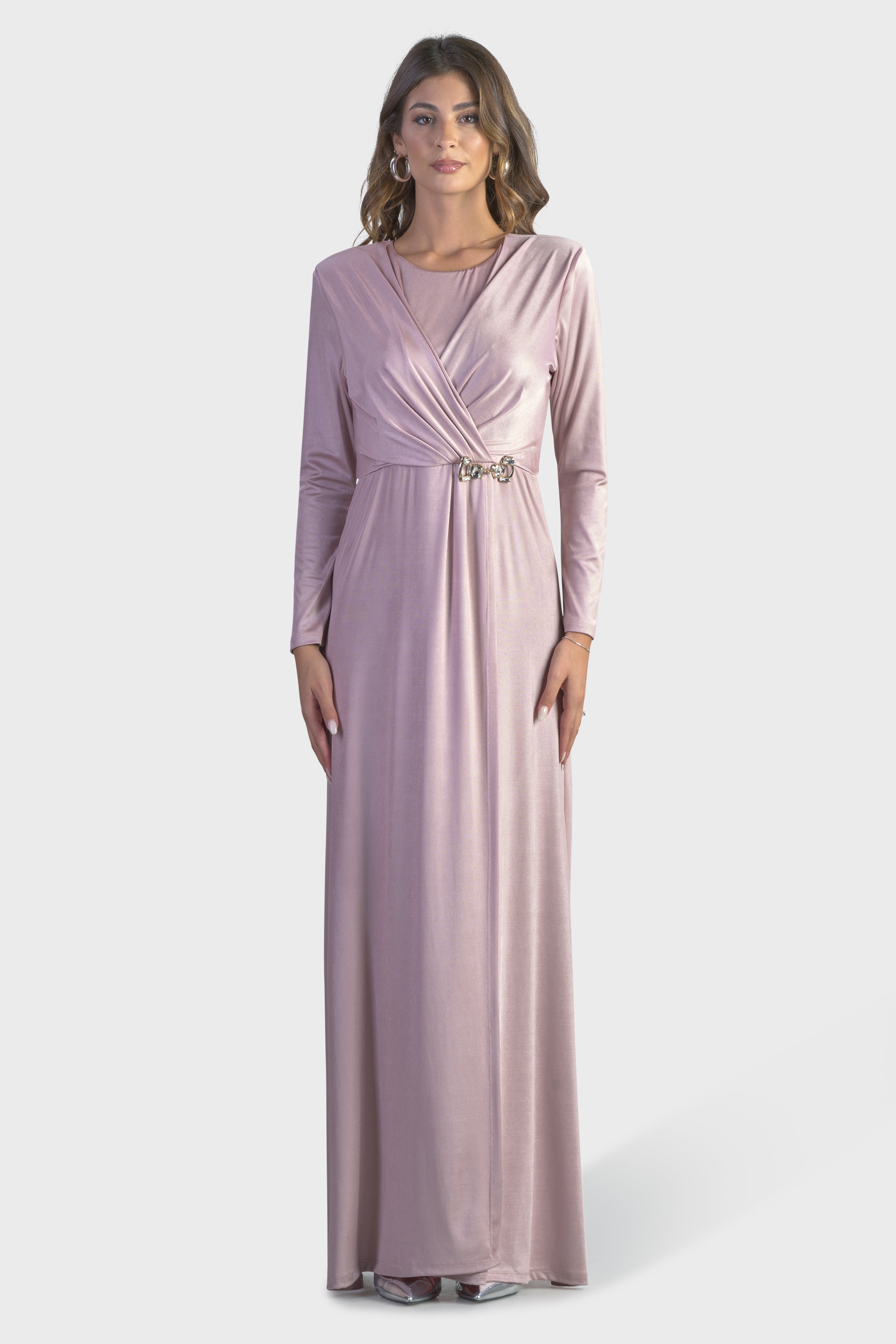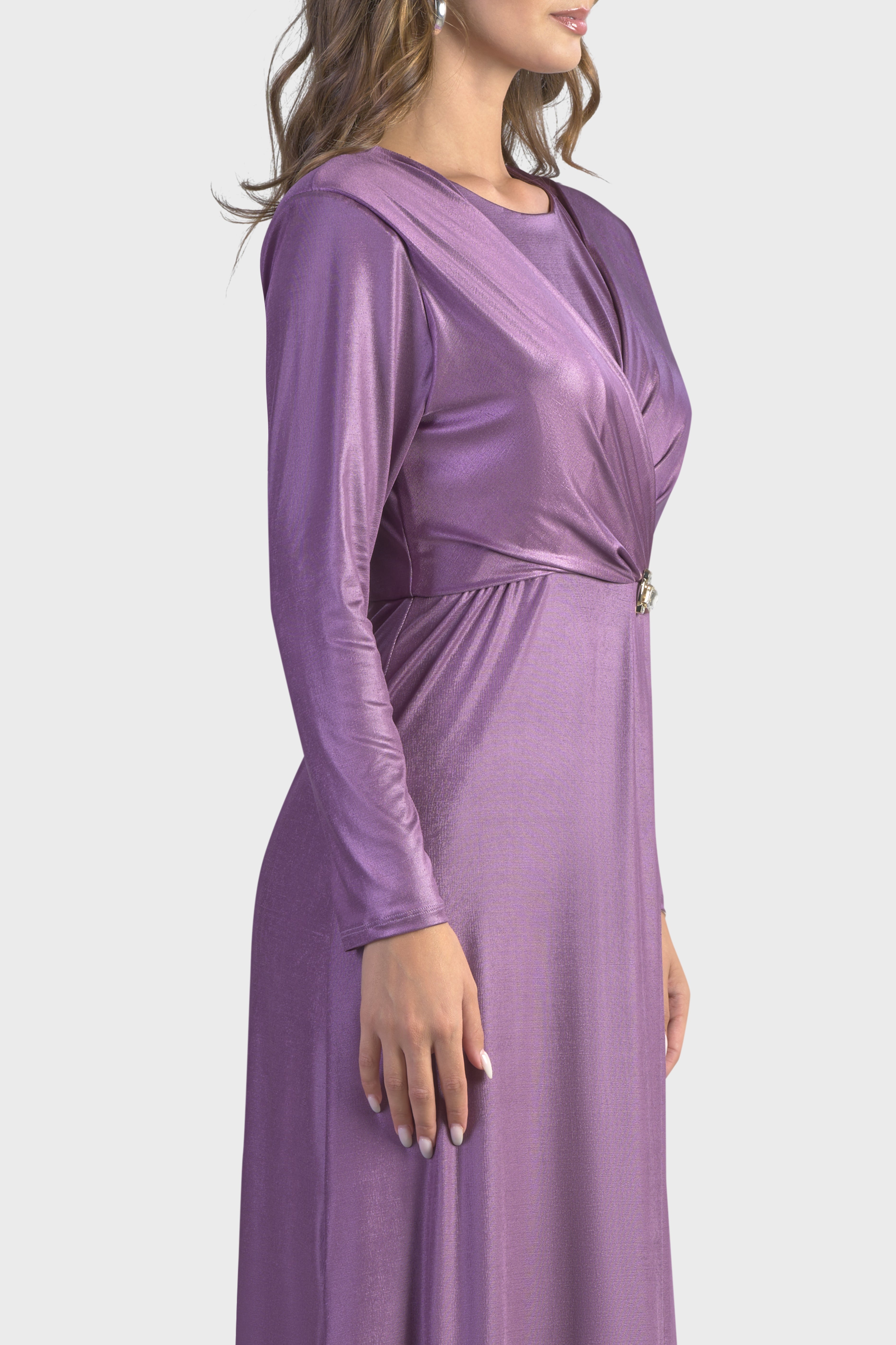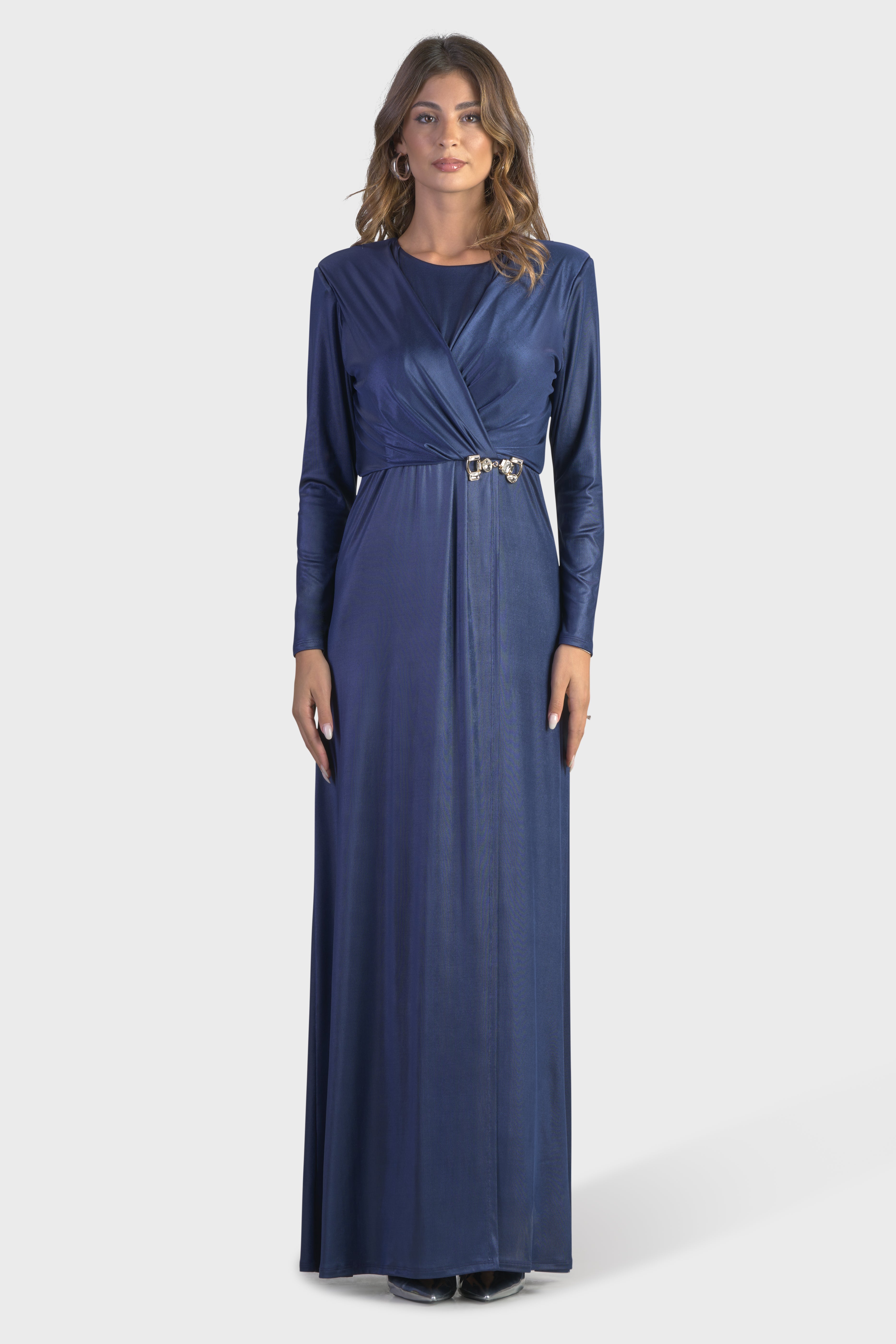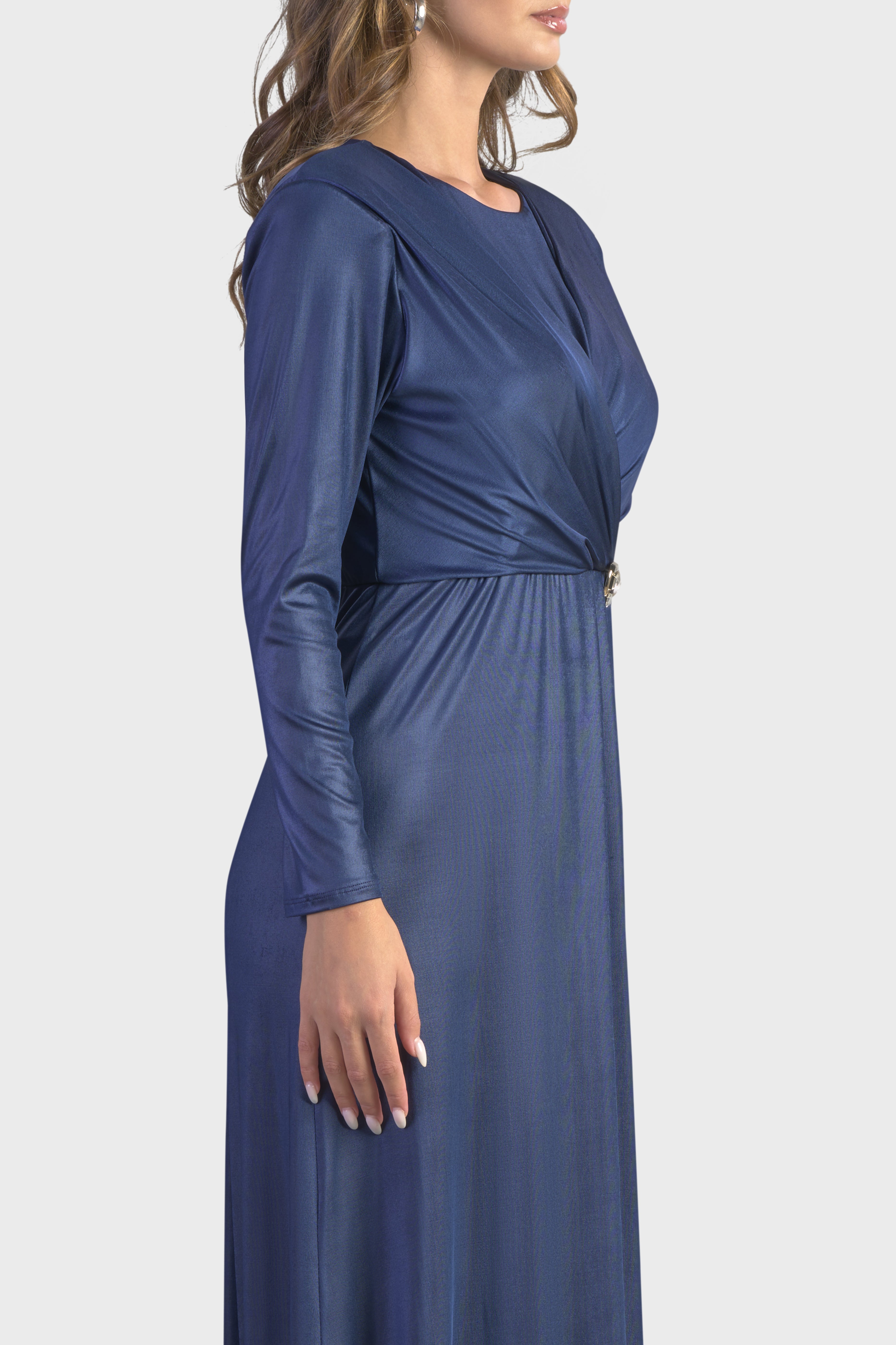 Quest’abito lungo a girocollo è il mix perfetto di drammaticità ed eleganza, ideale per chi vuole farsi notare. Realizzato in un tessuto elasticizzato dall’aspetto scintillante, in grado di catturare la luce in modo seducente. Il modello è caratterizzato dal drappeggio sul davanti che culmina nel taglio in vita, impreziosito dall’accessorio dorato sul fianco. La gonna con apertura a portafoglio e alto spacco diagonale aggiunge un tocco di sensualità, rivelando la gamba con grazia. Nella parte sottostante, quest’abito è rifinito con una chiusura a body, per offrire una maggiore coprenza. Infine sul retro presenta una chiusura con cerniera nascosta. Perfetto per occasioni di prestigio, questo abito è pensato per la donna che ama essere al centro dell'attenzione con stile e sicurezza.