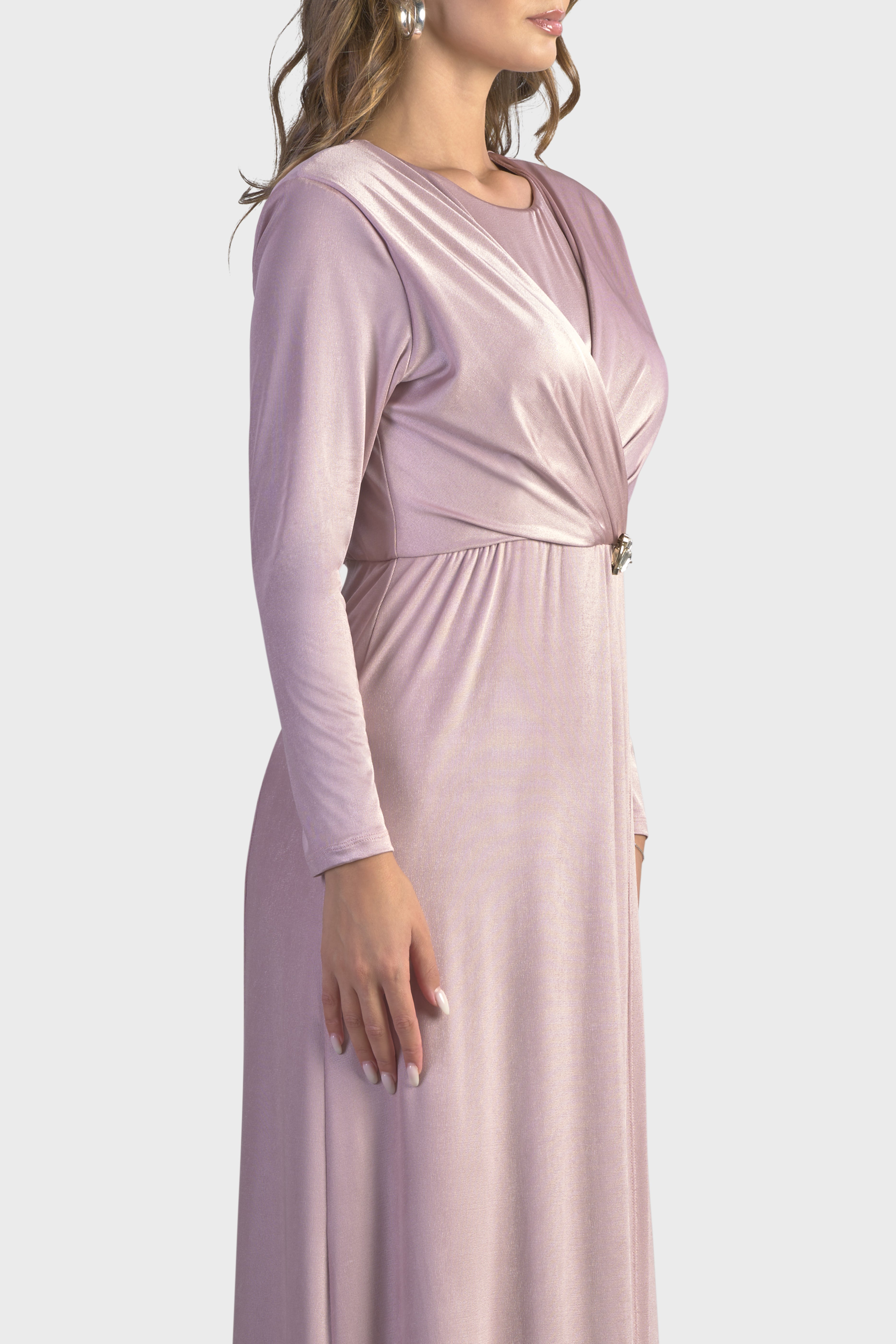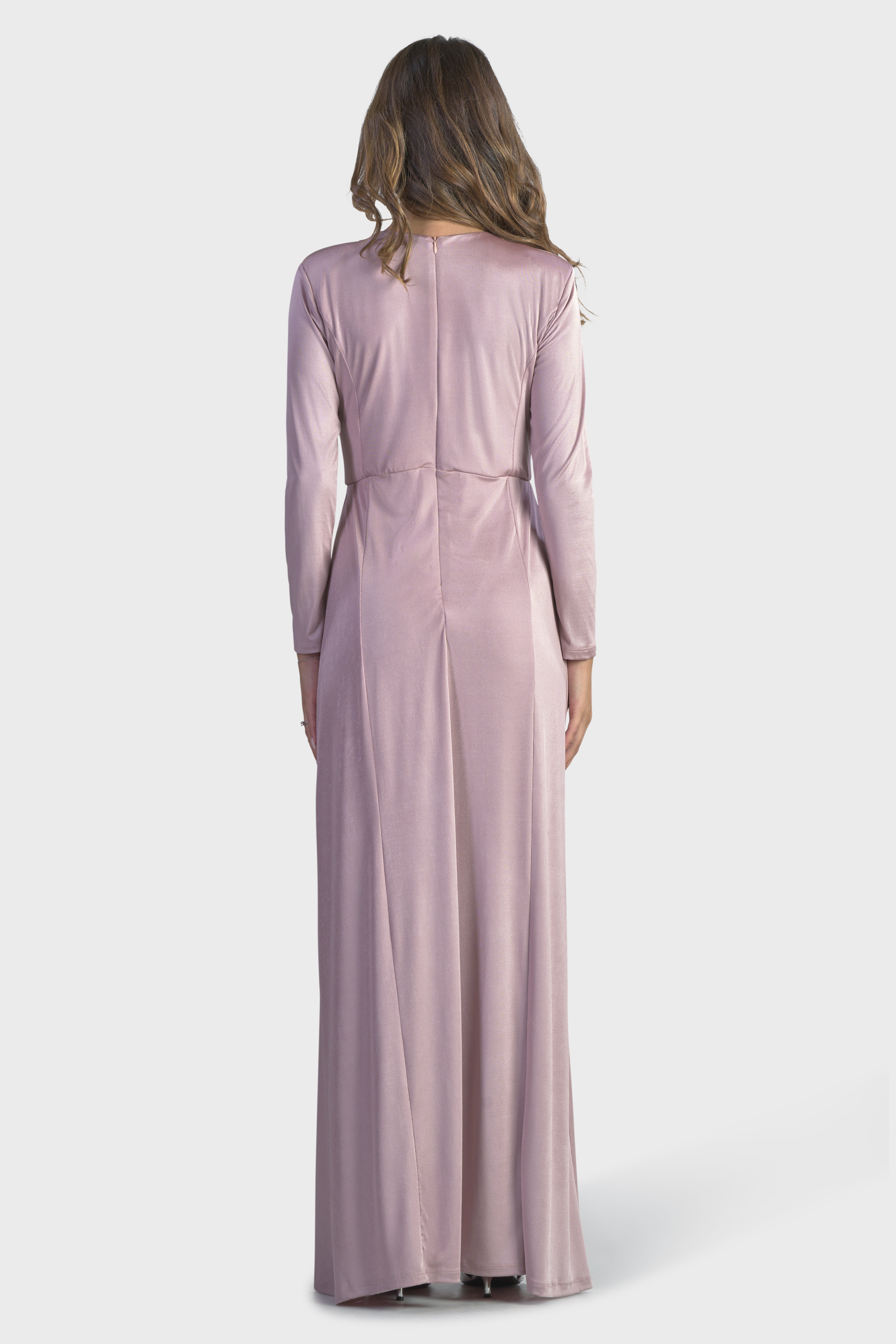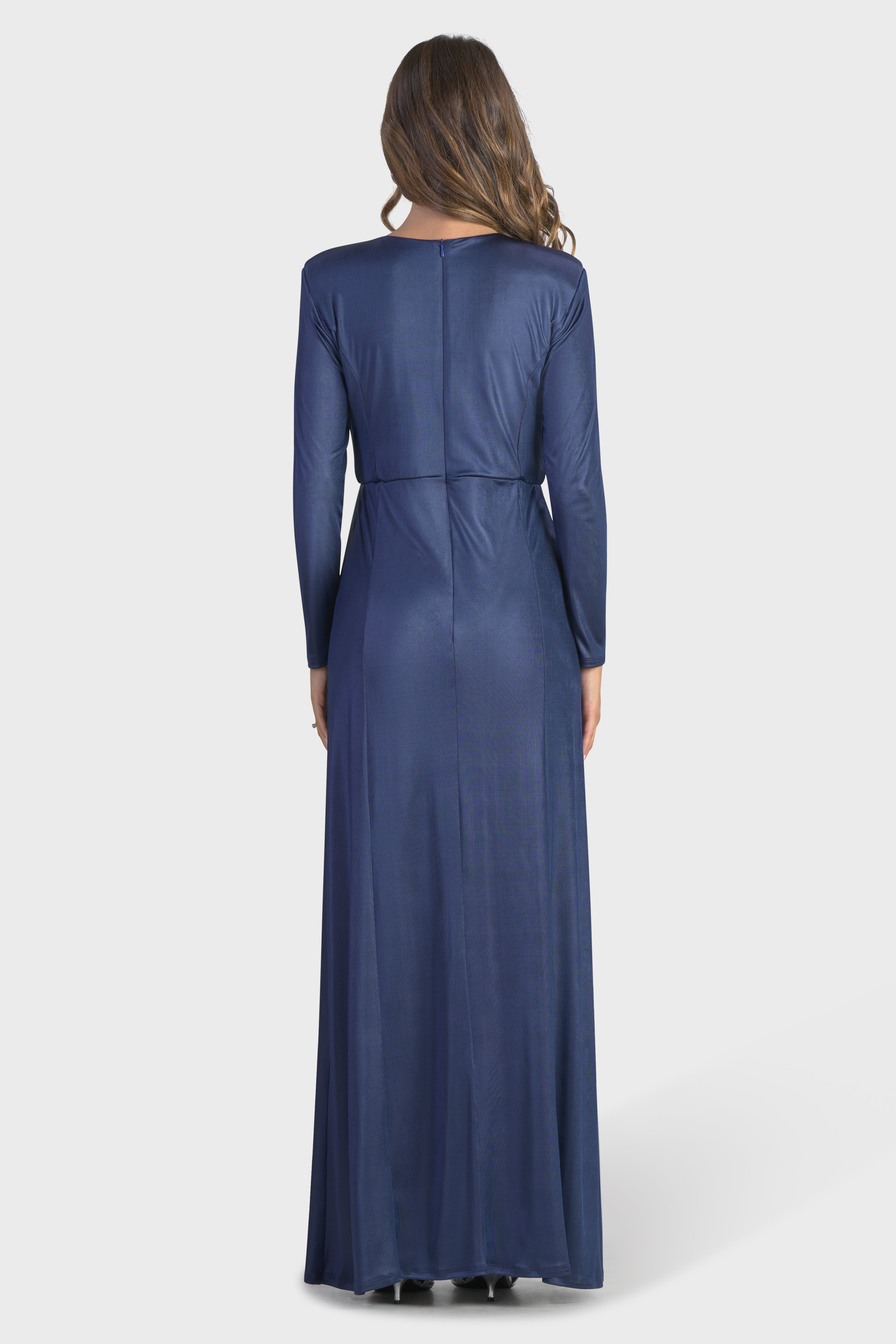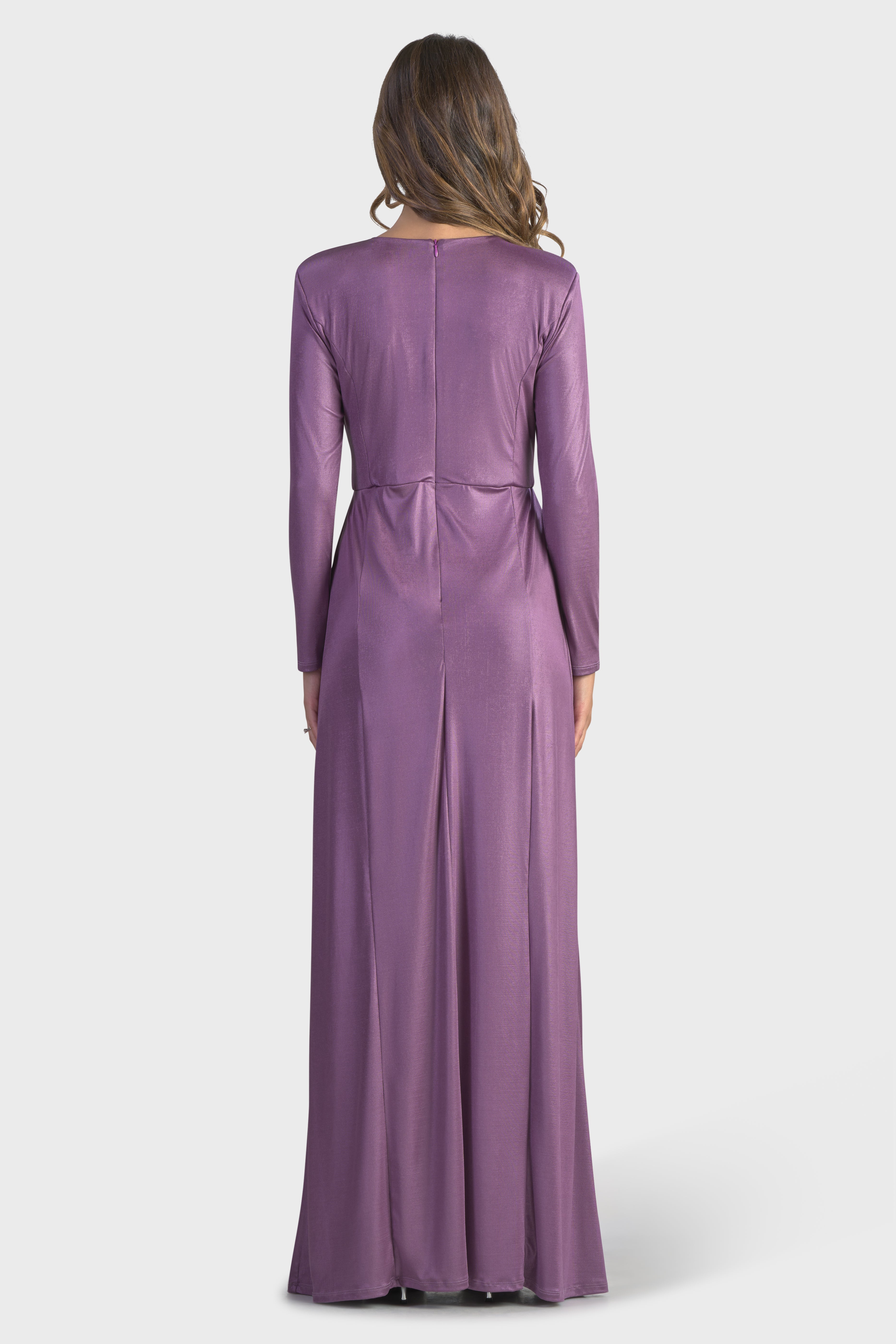 Quest’abito lungo a girocollo è il mix perfetto di drammaticità ed eleganza, ideale per chi vuole farsi notare. Realizzato in un tessuto elasticizzato dall’aspetto scintillante, in grado di catturare la luce in modo seducente. Il modello è caratterizzato dal drappeggio sul davanti che culmina nel taglio in vita, impreziosito dall’accessorio dorato sul fianco. La gonna con apertura a portafoglio e alto spacco diagonale aggiunge un tocco di sensualità, rivelando la gamba con grazia. Nella parte sottostante, quest’abito è rifinito con una chiusura a body, per offrire una maggiore coprenza. Infine sul retro presenta una chiusura con cerniera nascosta. Perfetto per occasioni di prestigio, questo abito è pensato per la donna che ama essere al centro dell'attenzione con stile e sicurezza.
