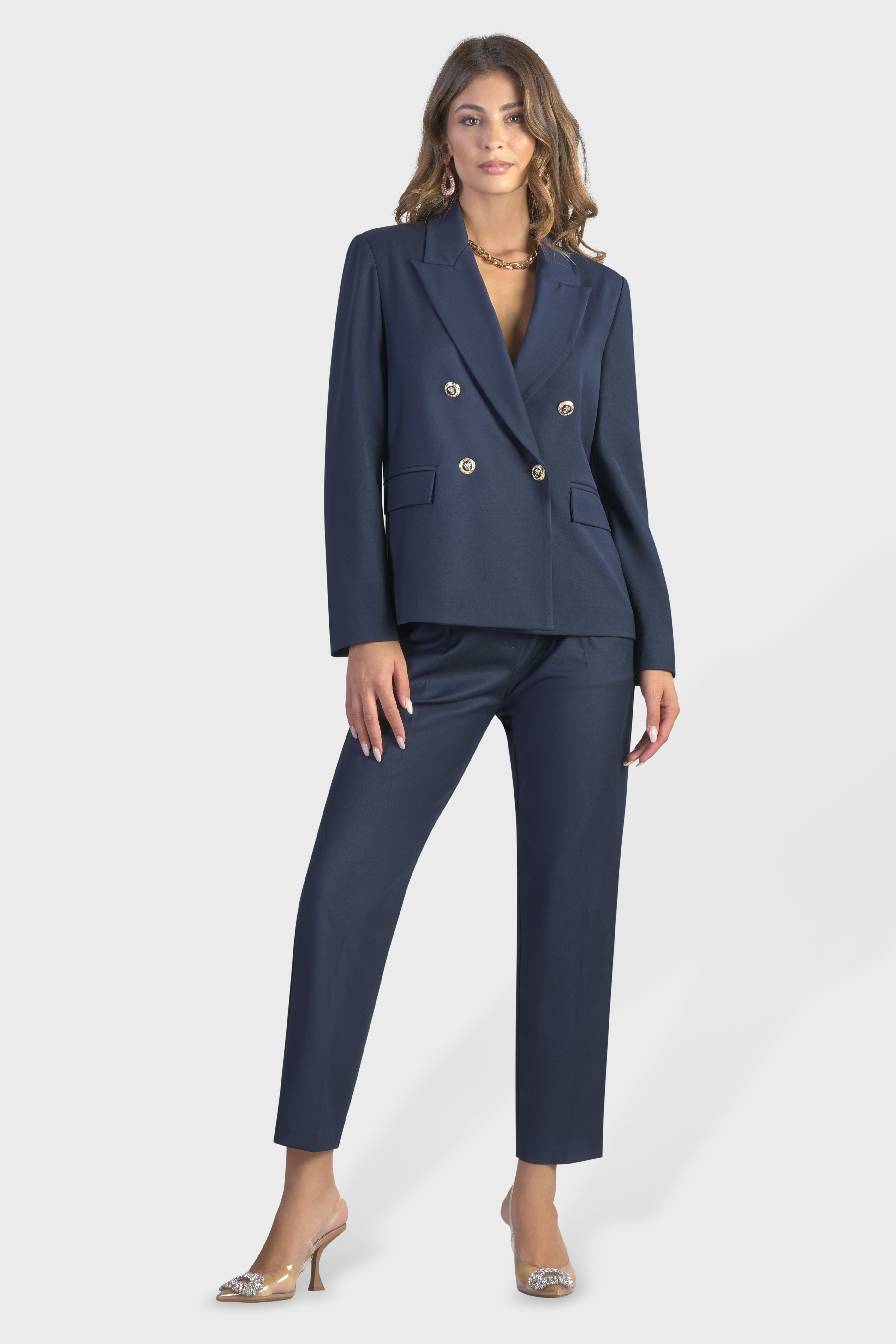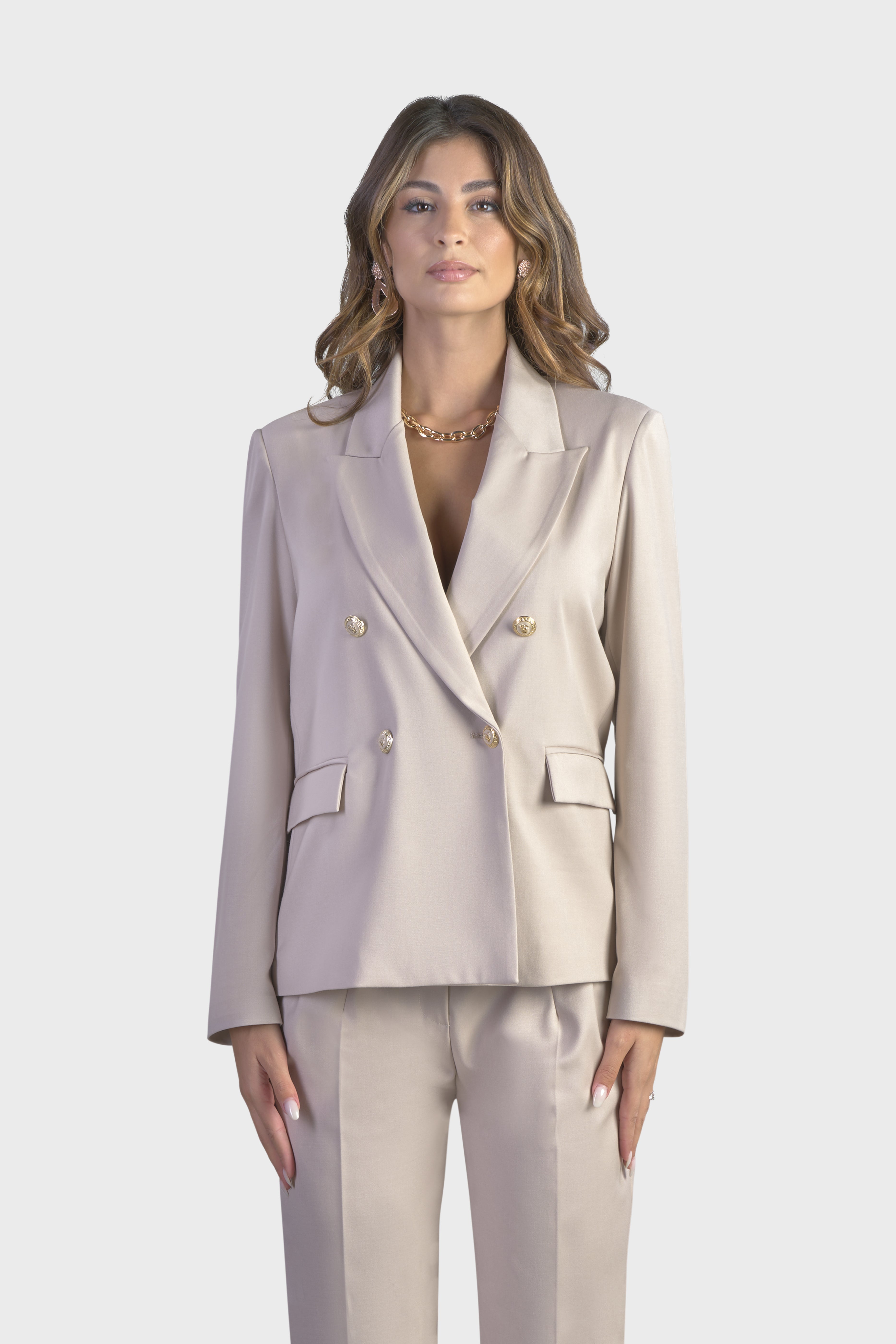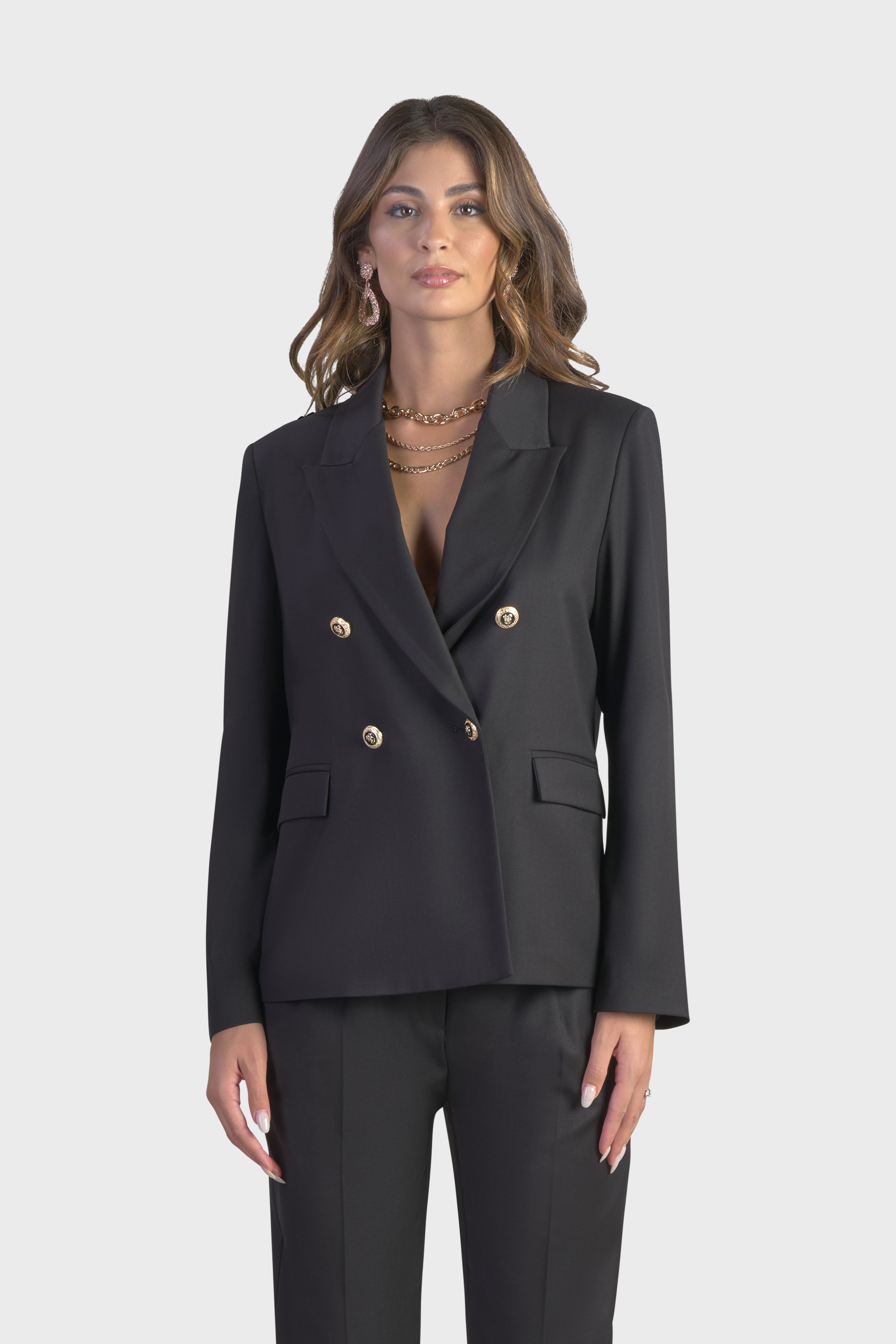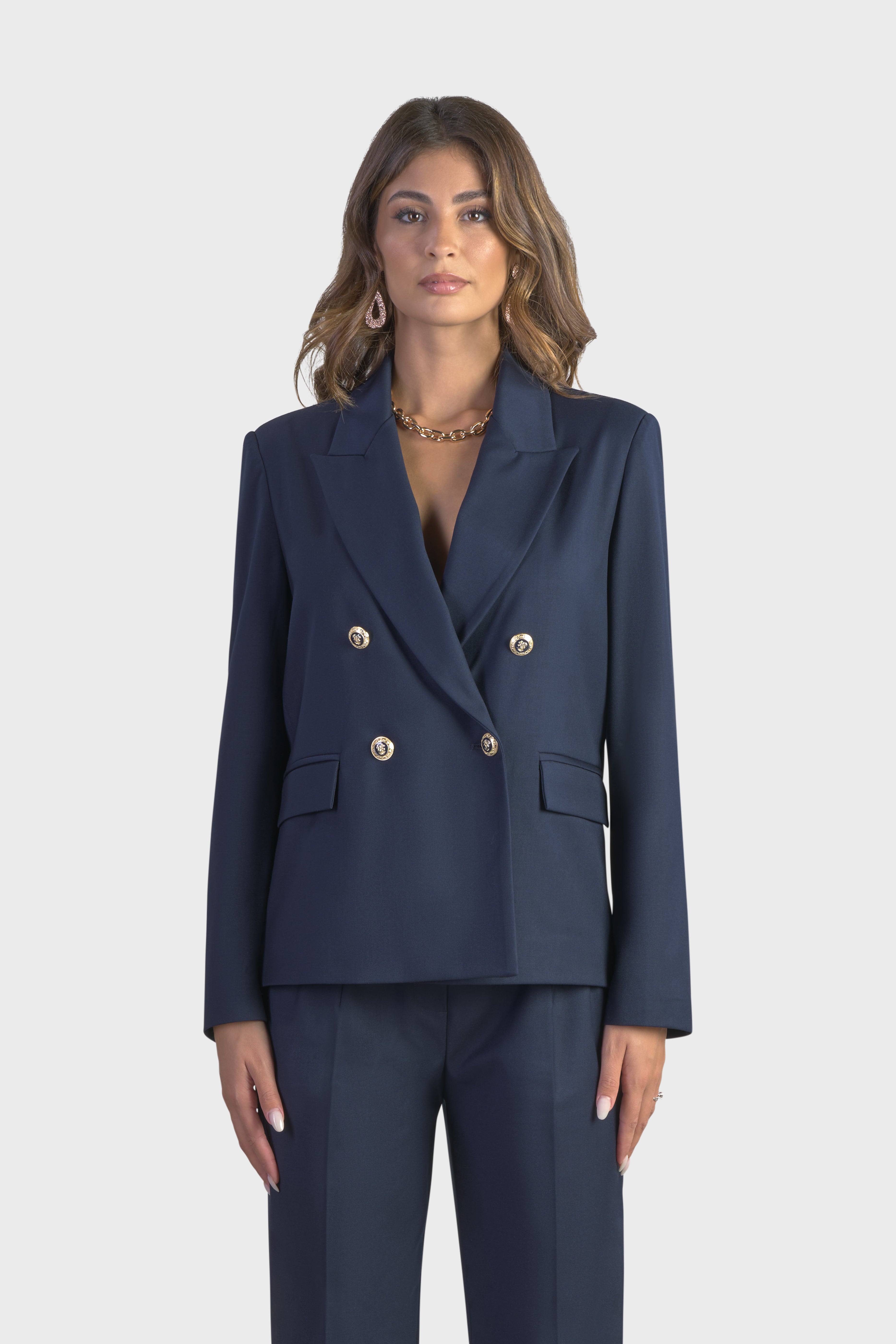 Questa giacca a doppiopetto con collo a rovere è l’incarnazione della classe e della sofisticatezza. Realizzato in mano lana, tessuto dalla mano morbida e caldo al tatto. Il modello è caratterizzato dall’abbottonatura impreziosita dai bottoni dal bordo dorato,mentre le maniche lunghe,aggiungono un dettaglio sartoriale distintivo. La vestibilità regolare e la lunghezza sotto al bacino la rendono perfetta per un look elegante e professionale. Ideale da abbinare al pantalone Kelly in coordinato della collezione.