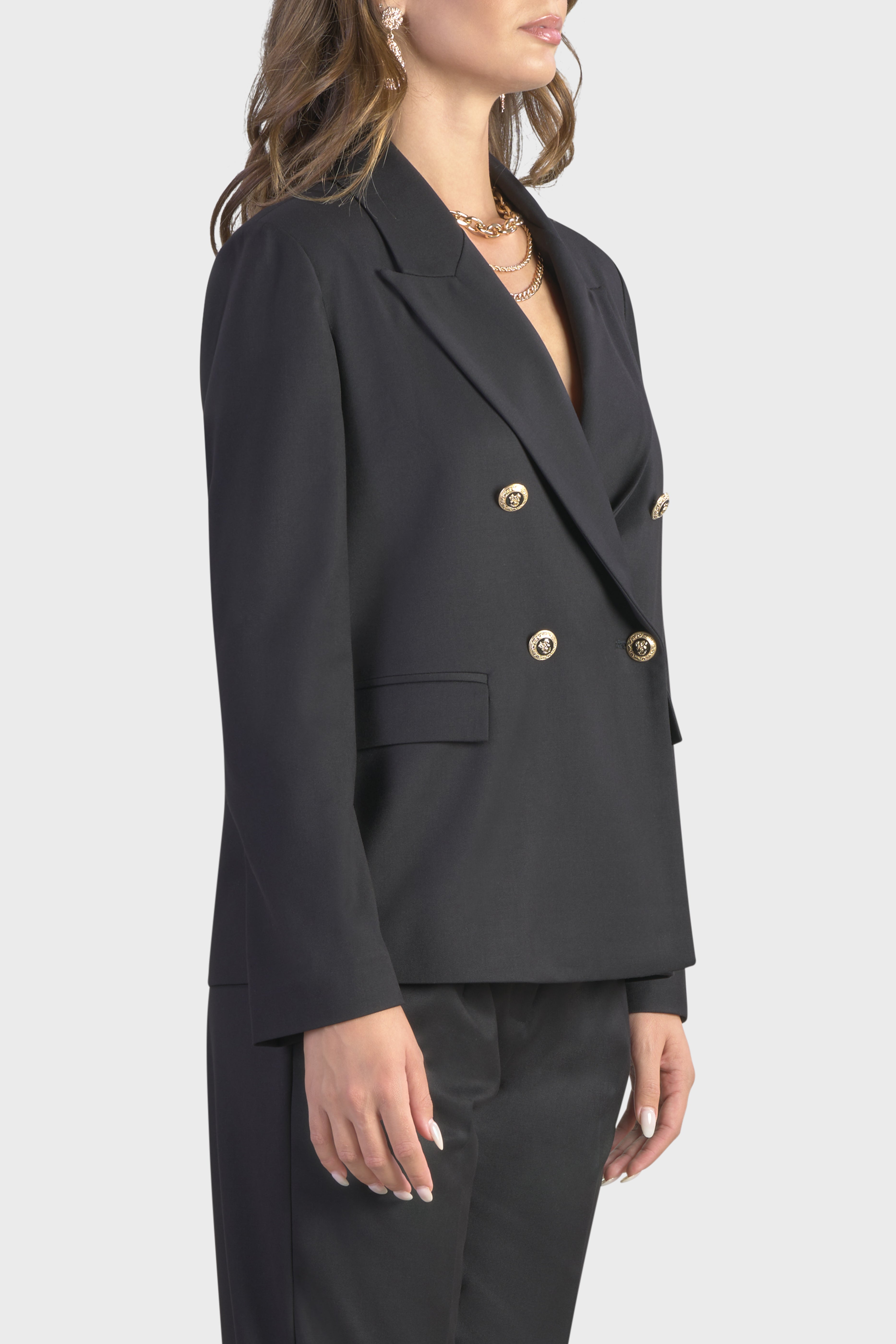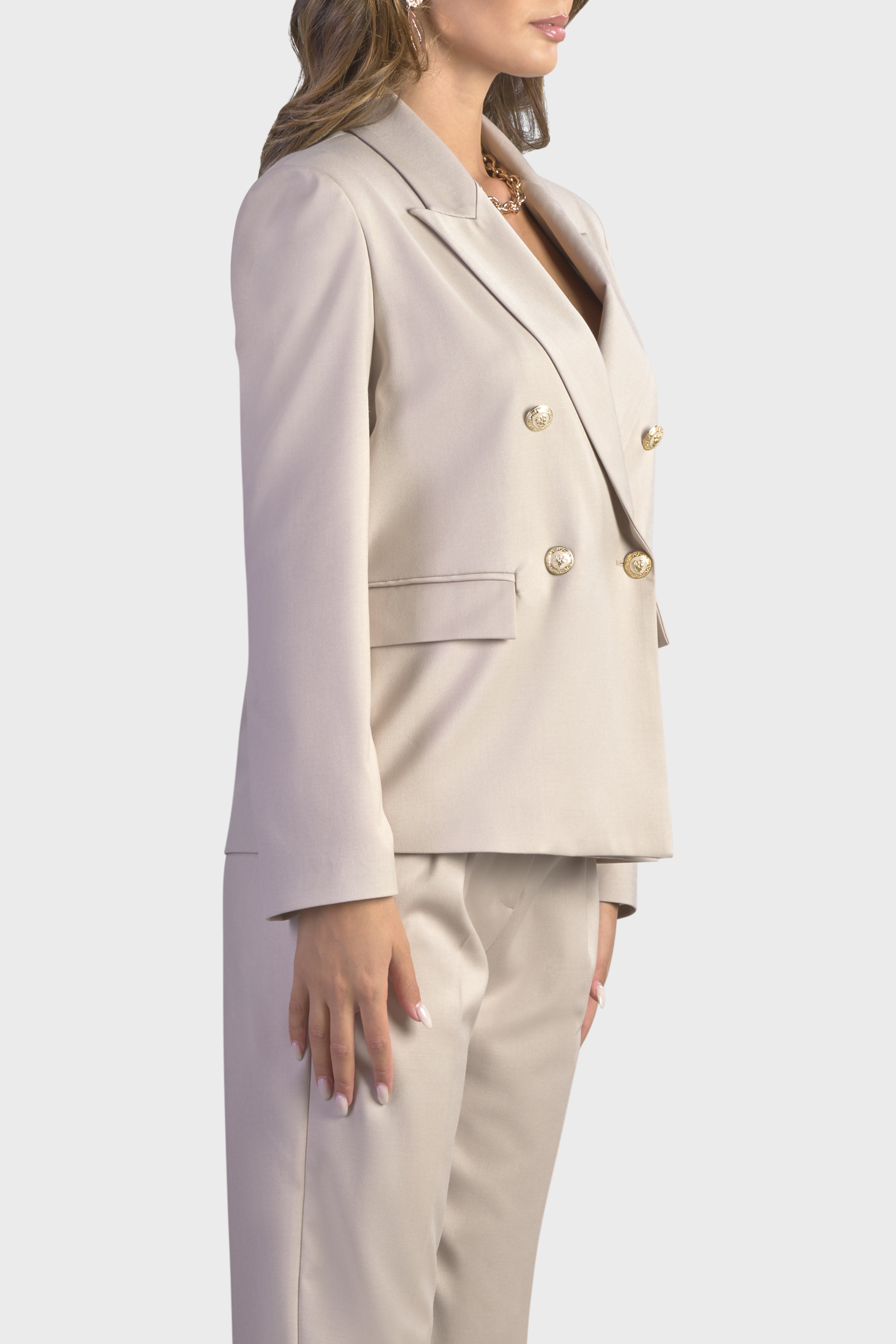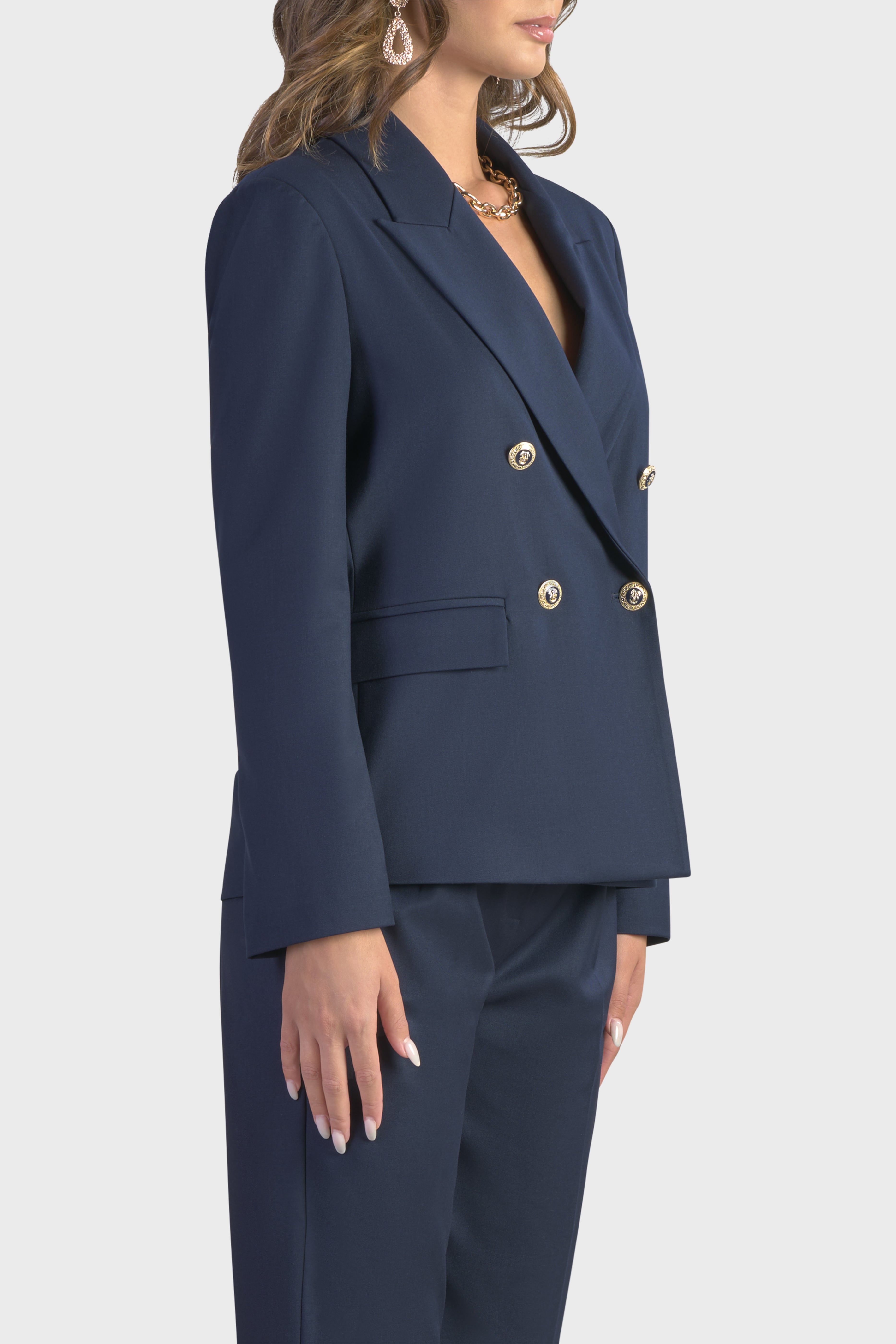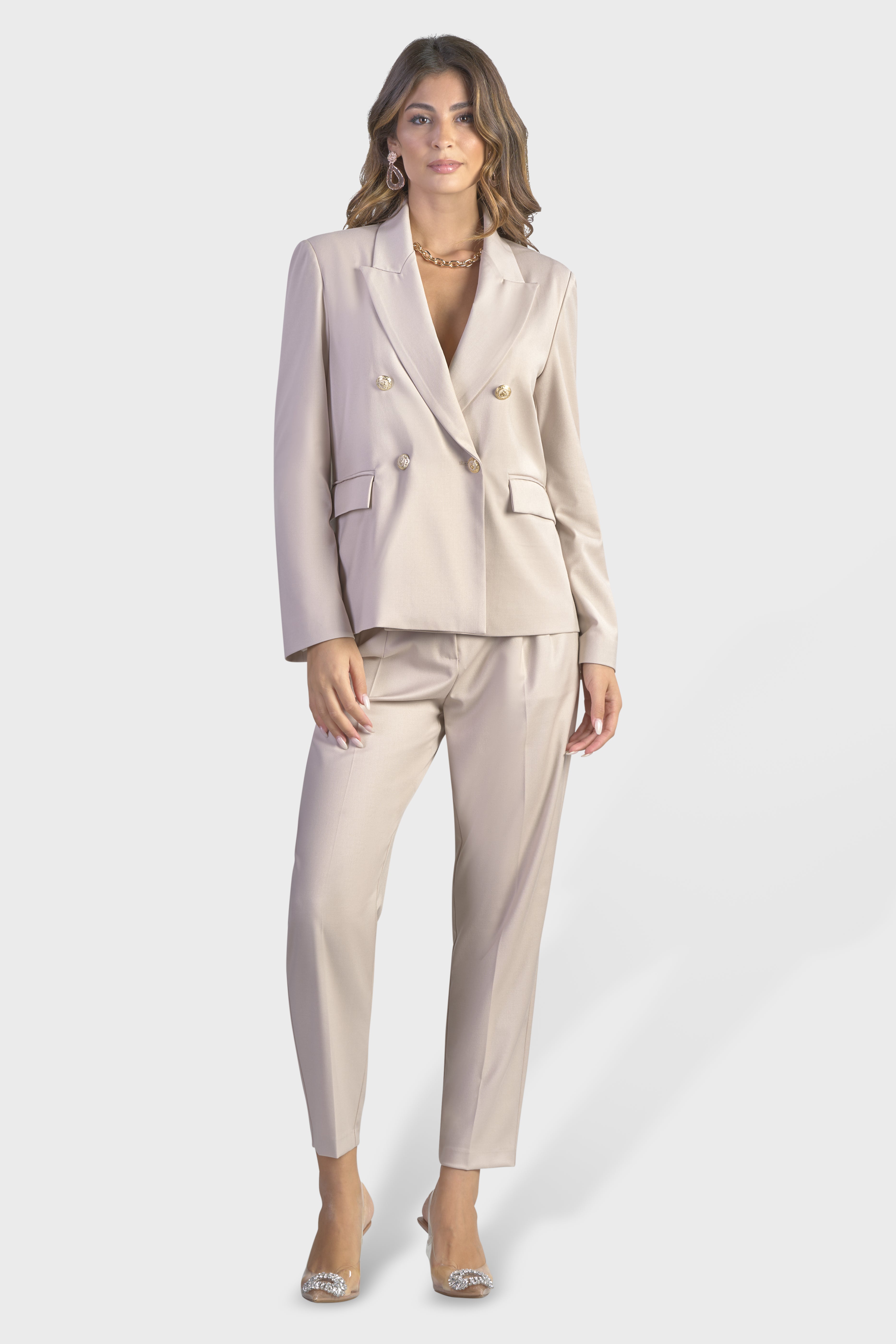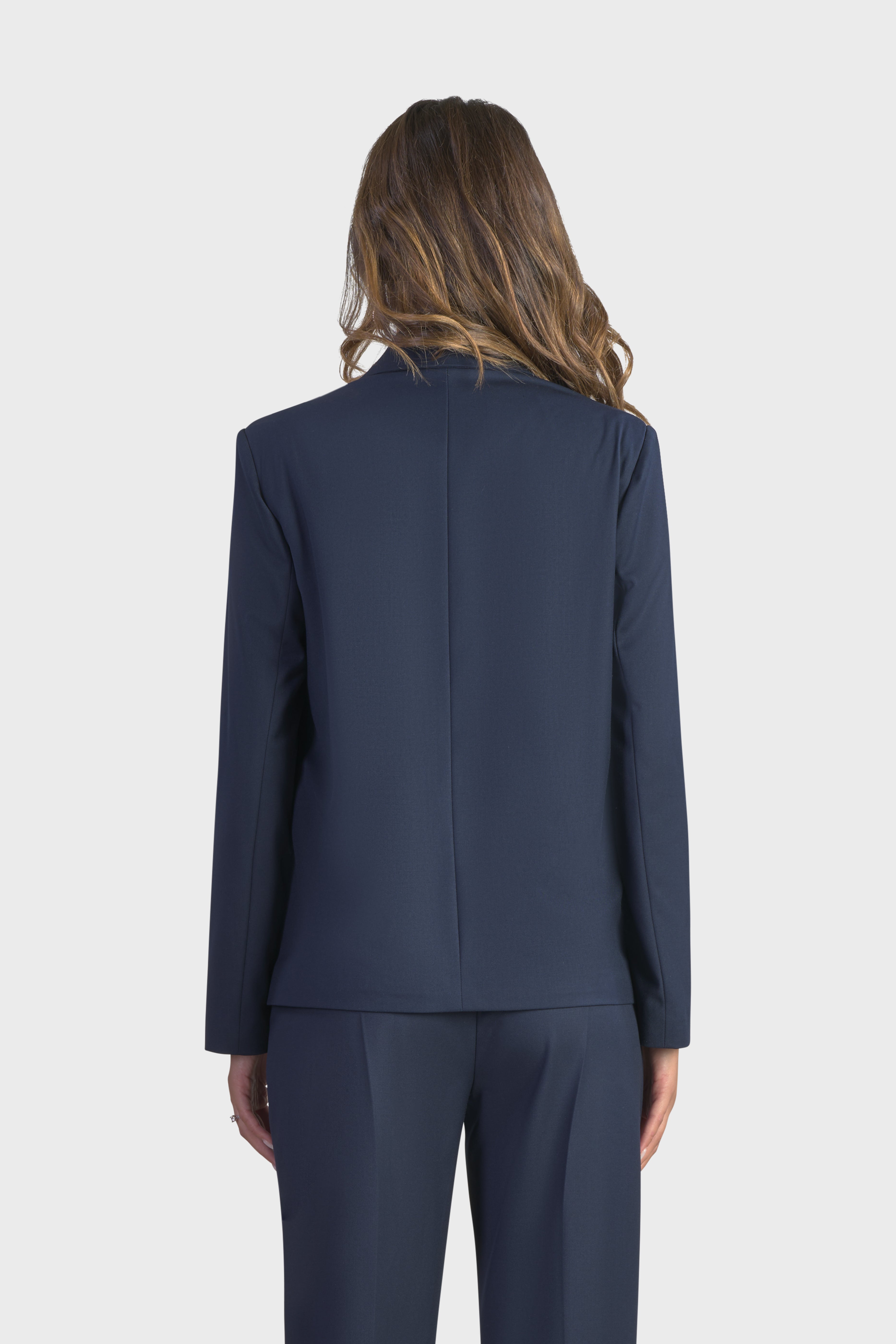 Questa giacca a doppiopetto con collo a rovere è l’incarnazione della classe e della sofisticatezza. Realizzato in mano lana, tessuto dalla mano morbida e caldo al tatto. Il modello è caratterizzato dall’abbottonatura impreziosita dai bottoni dal bordo dorato,mentre le maniche lunghe,aggiungono un dettaglio sartoriale distintivo. La vestibilità regolare e la lunghezza sotto al bacino la rendono perfetta per un look elegante e professionale. Ideale da abbinare al pantalone Kelly in coordinato della collezione.