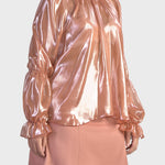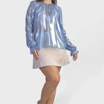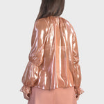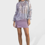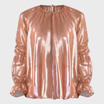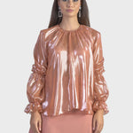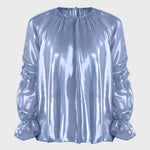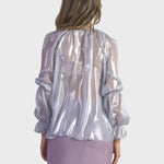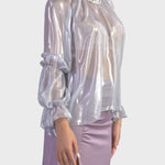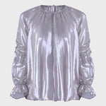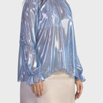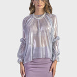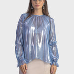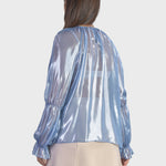 This raglan sleeve blouse is a masterpiece of modern elegance. Crafted from bright iridescent chiffon, a very lightweight yet durable sheer fabric. The crew neck model, with a loose fit, falls to the hips, gracefully embracing the silhouette. The long sleeves are characterised by the puffed effect created by the elastic that runs along the elbow and wrist. Finally, on the back the garment is detailed with a teardrop closure with a button covered in the same fabric. This blouse is a refined touch over a pair of jeans or extremely elegant when worn with a pair of black trousers or a pencil skirt.