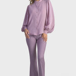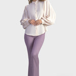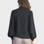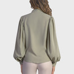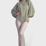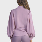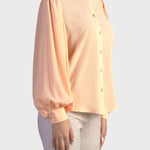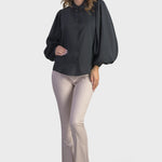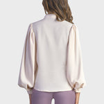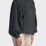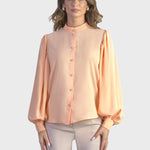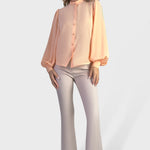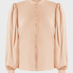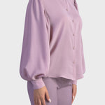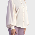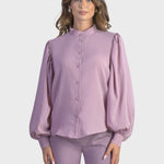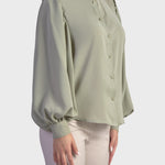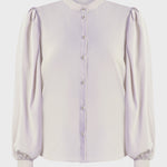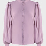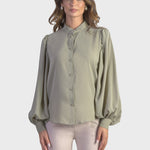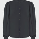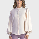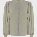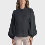 Questa camicia dalle maniche a sbuffo, è un capolavoro di eleganza moderna. Realizzata in un cady leggero, tessuto scivoloso dall’aspetto lucente. Il modello dal colletto alla coreana e l’abbottonatura sul davanti impreziosita dai bottoni rivestiti rendono la camicia perfetta per una donna che apprezza i dettagli unici e lo stile senza tempo. La vestibilità lusinghiera e la lunghezza al bacino donano comfort e sofisticazione. Perfetta da abbinare ad una gonna o un pantalone della collezione, per completare un look glamour e di super tendenza.