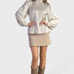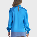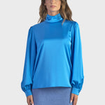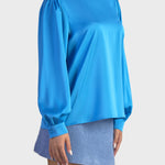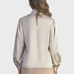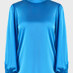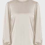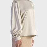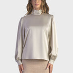 The relaxed line of this blouse combines classic charm with modern sophistication. Made of matte satin, a smooth and pleasant to the touch fabric. The model is characterized by soft gathered sleeves both on the shoulder point and at the cuffs that give a touch of effortless elegance to every look. The high collar, with closure on the back with fabric-covered buttons makes this blouse a refined garment. Its length ends gracefully at the hips, thus proposing a versatile garment suitable for different situations. Ideal to wear on casual or semi-formal occasions together with one of the trousers from the collection.