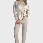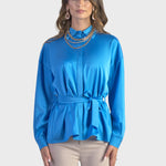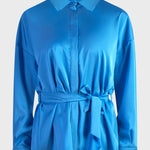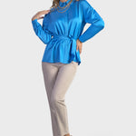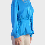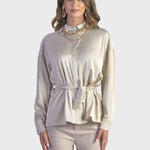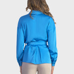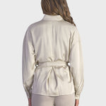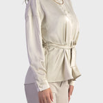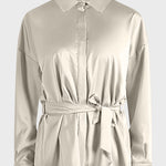This shirt with a classic collar and hidden button placket is an example of modern elegance. Made of satin, a smooth and pleasant-to-the-touch fabric. The long-sleeved model is characterized by the dropped shoulder and the sash at the waist made of the same fabric, adding a touch of refinement to the garment. The design is embellished by the visible covered button on the piping. This shirt is ideal to wear with trousers for a versatile look or in the evening with a skirt to create an elegant and super trendy outfit.