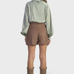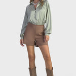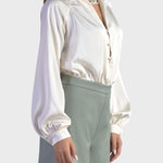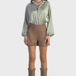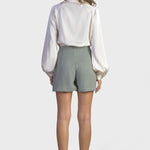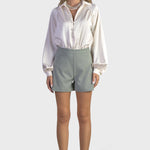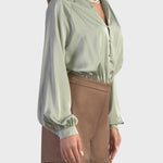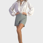 This short jumpsuit enhances the silhouette in an elegant and seductive way. The combination of fabrics, satin, smooth to the touch and soft flannel, makes this garment unique and inimitable. The upper part is characterized by the countless gathers at the waist, giving shape to a flared effect. The long raglan sleeves and the pointed collar enrich the splendid V-neck, embellished with jewel buttons. Adding a special touch are the shirt cuffs, where the same buttons are repeated. The cut at the waist highlights the fit designed to remain close to the body. Finally, the model features a hidden zip closure on the side, for greater finishing. Perfect to wear for a brunch, this jumpsuit is the ideal garment for a casual look.