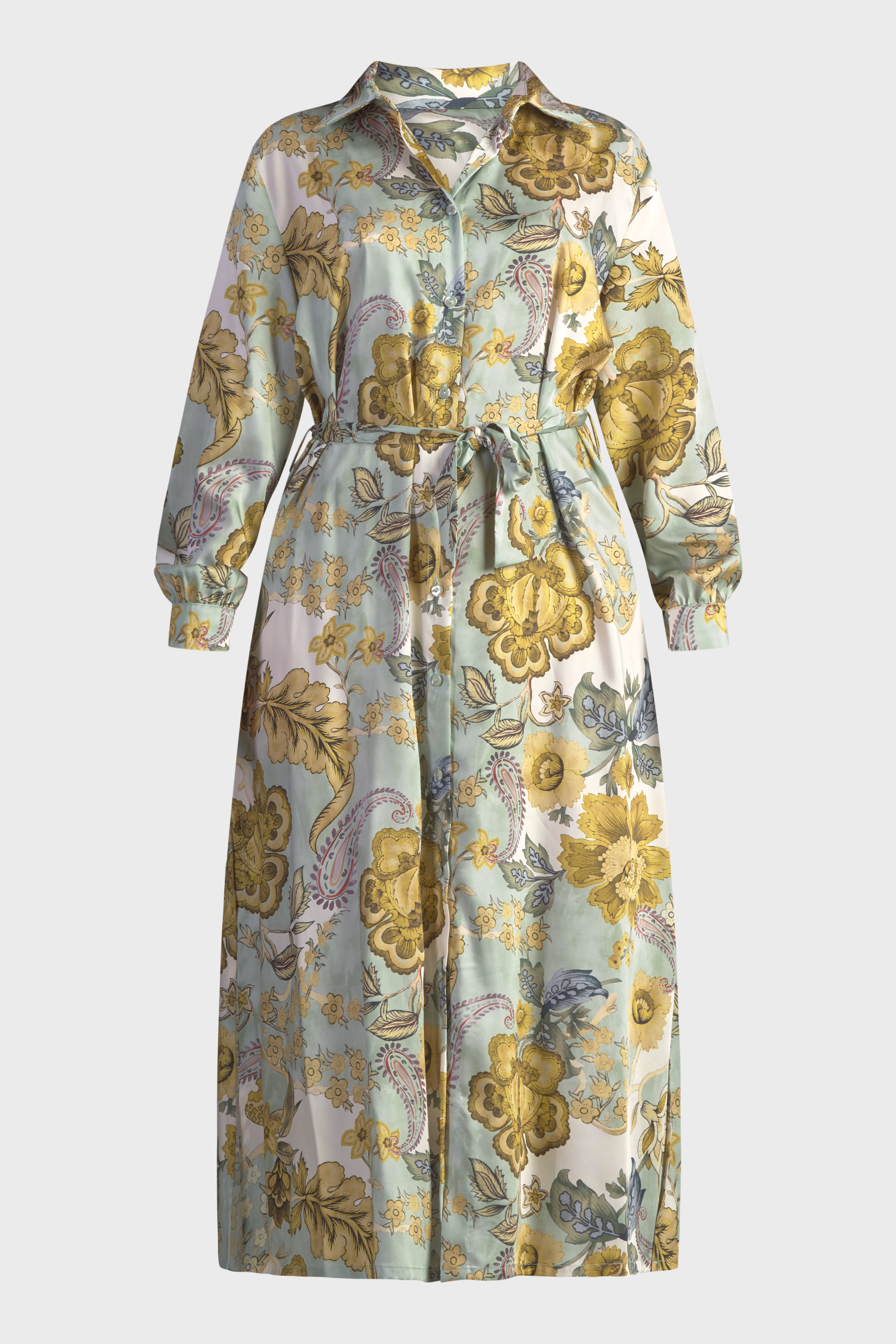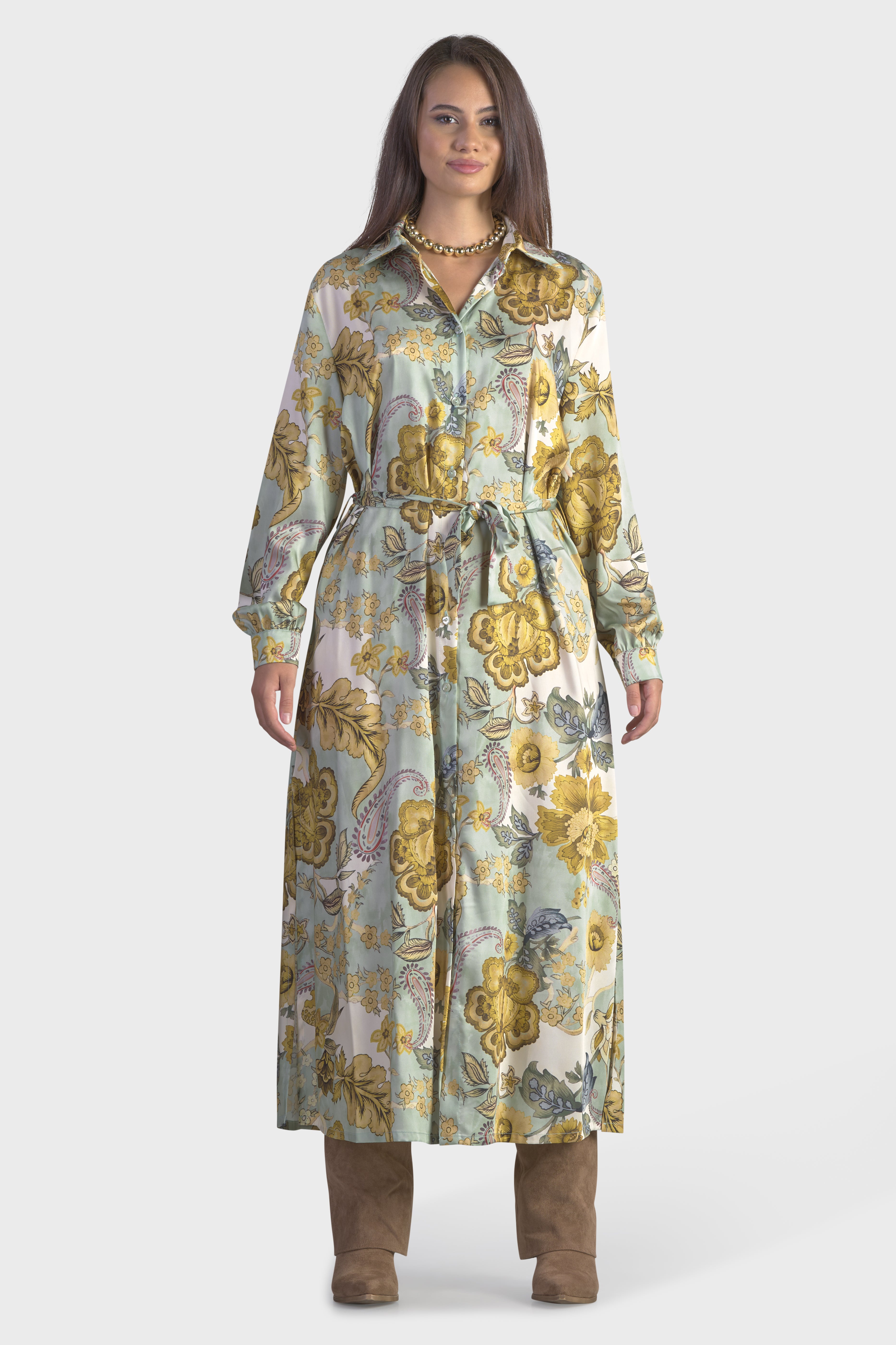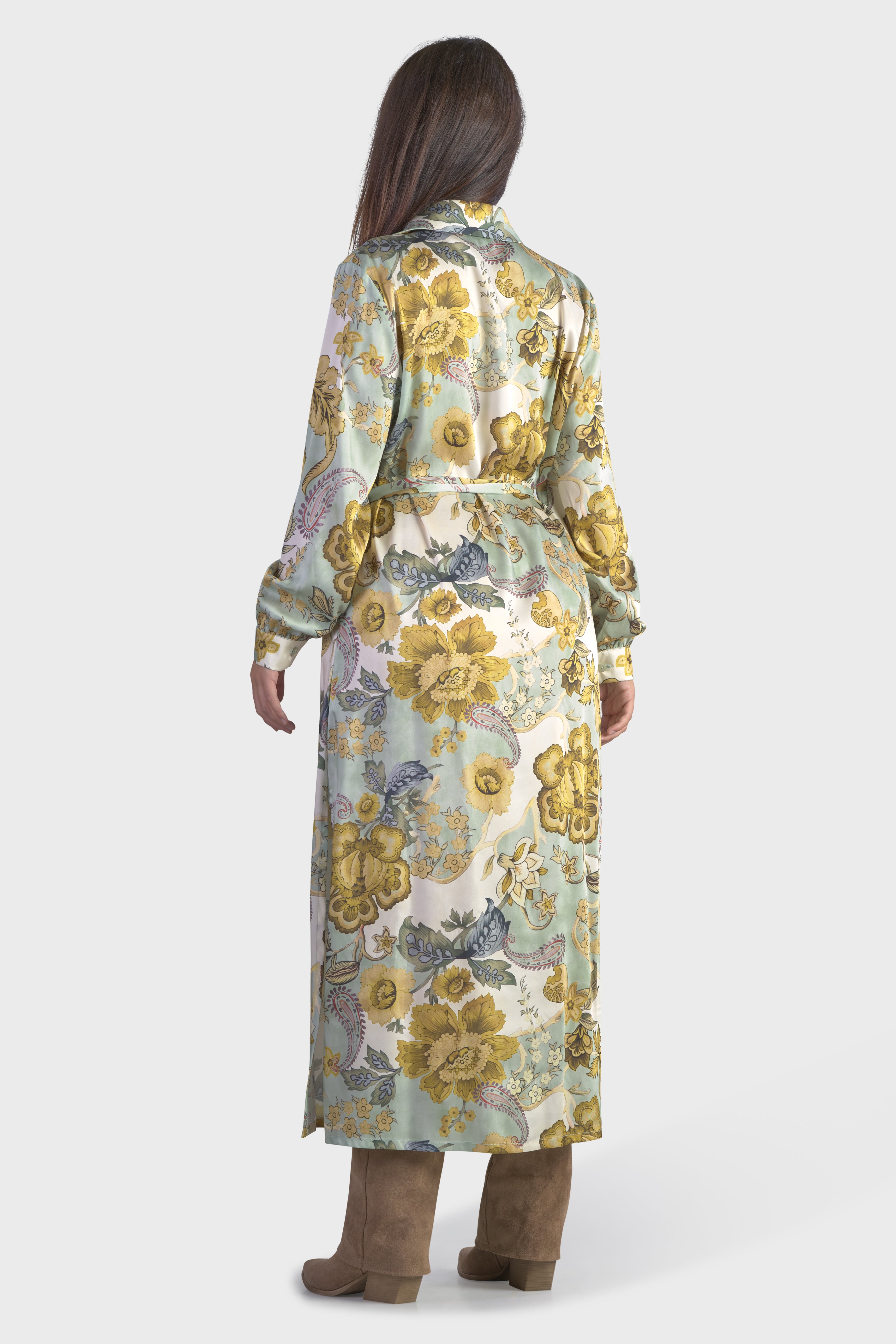 La linea morbida di questo abito chemisier, ci rimanda ad una silhouette slanciata e raffinata. Realizzato in raso stampato, tessuto scivoloso e lucente, liscio al tatto. La stampa floreale dal fondo pastello, ci rimanda ad uno scenario astratto dall’effetto dipinto. Il modello con colletto a punta è caratterizzato dall’apertura sul davanti con bottoni in tinta tono su tono, mentre al fondo è arricchito da due spacchi laterali. In vita, presenta dei passanti e una cintura realizzata nello stesso tessuto.Questo abito è ideale da indossare per un look giornaliero o di sera per un occasione informale.