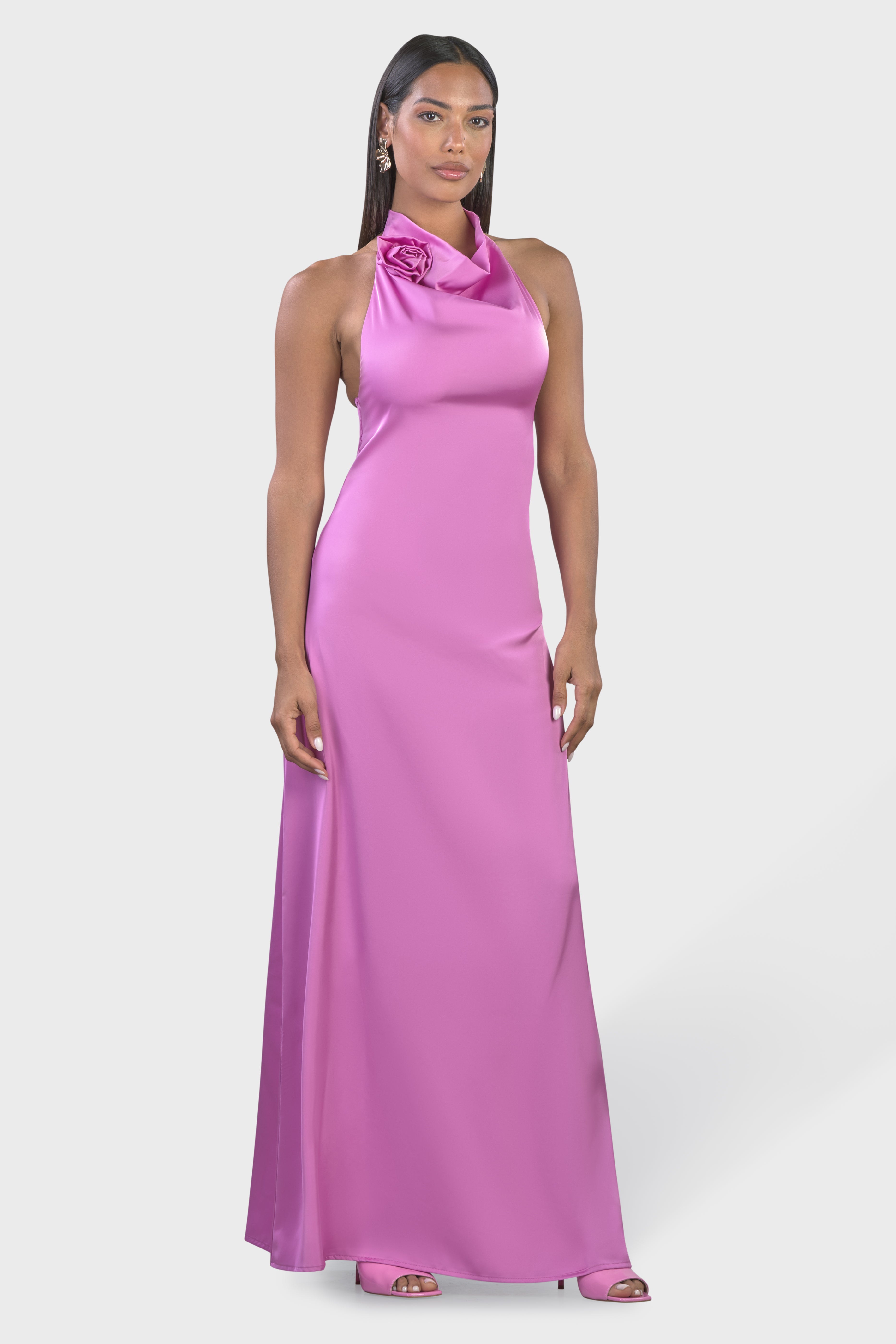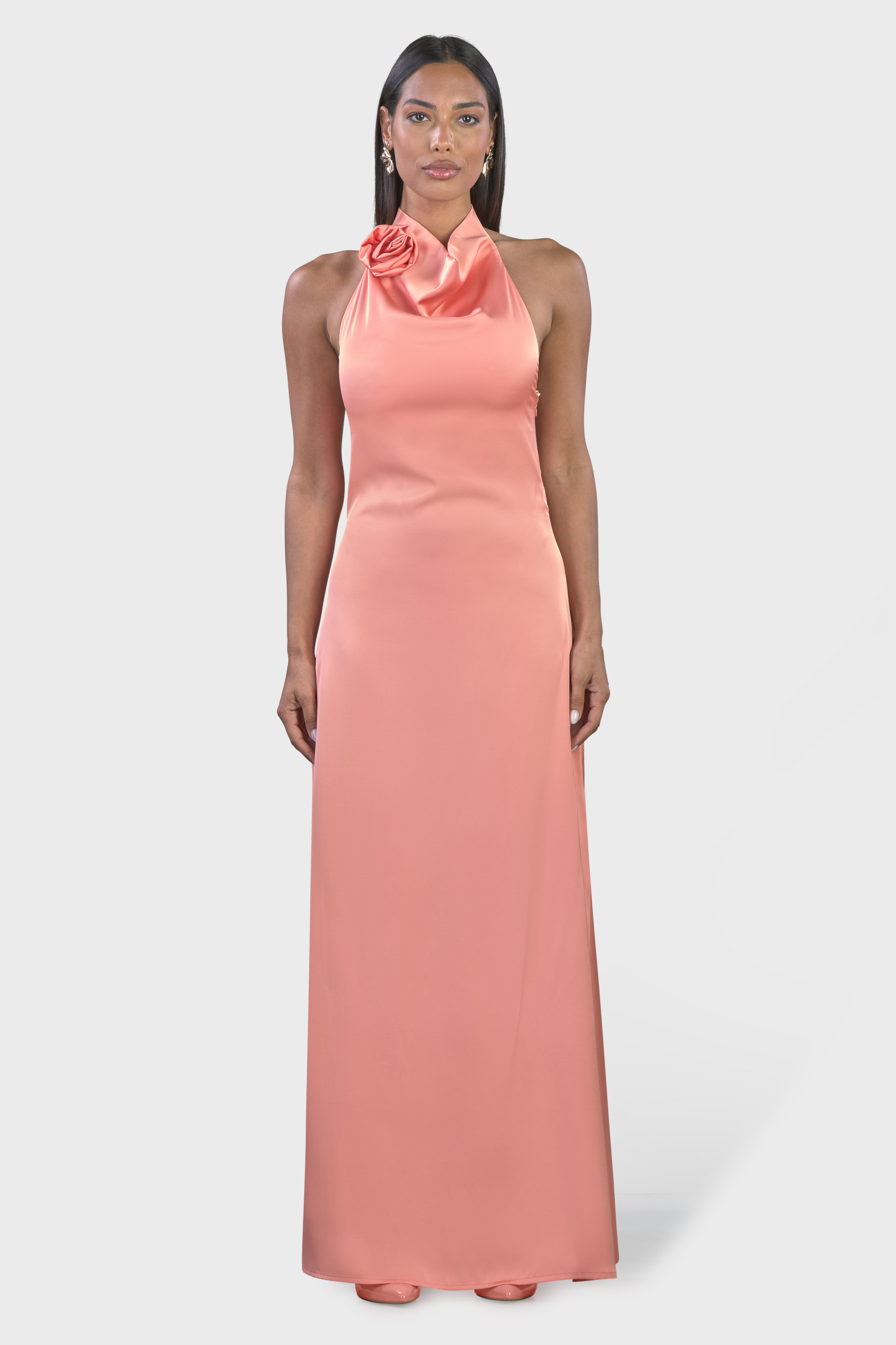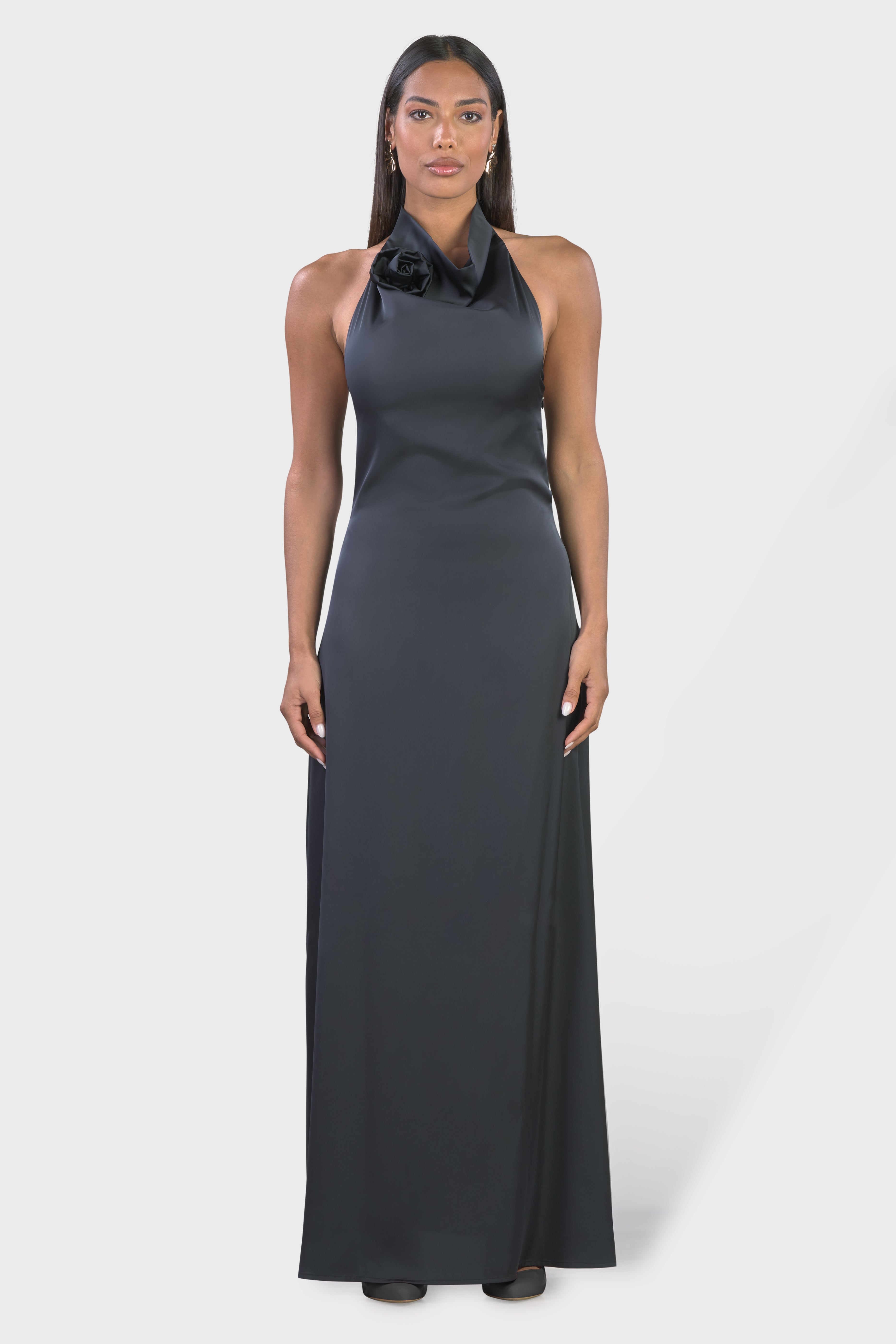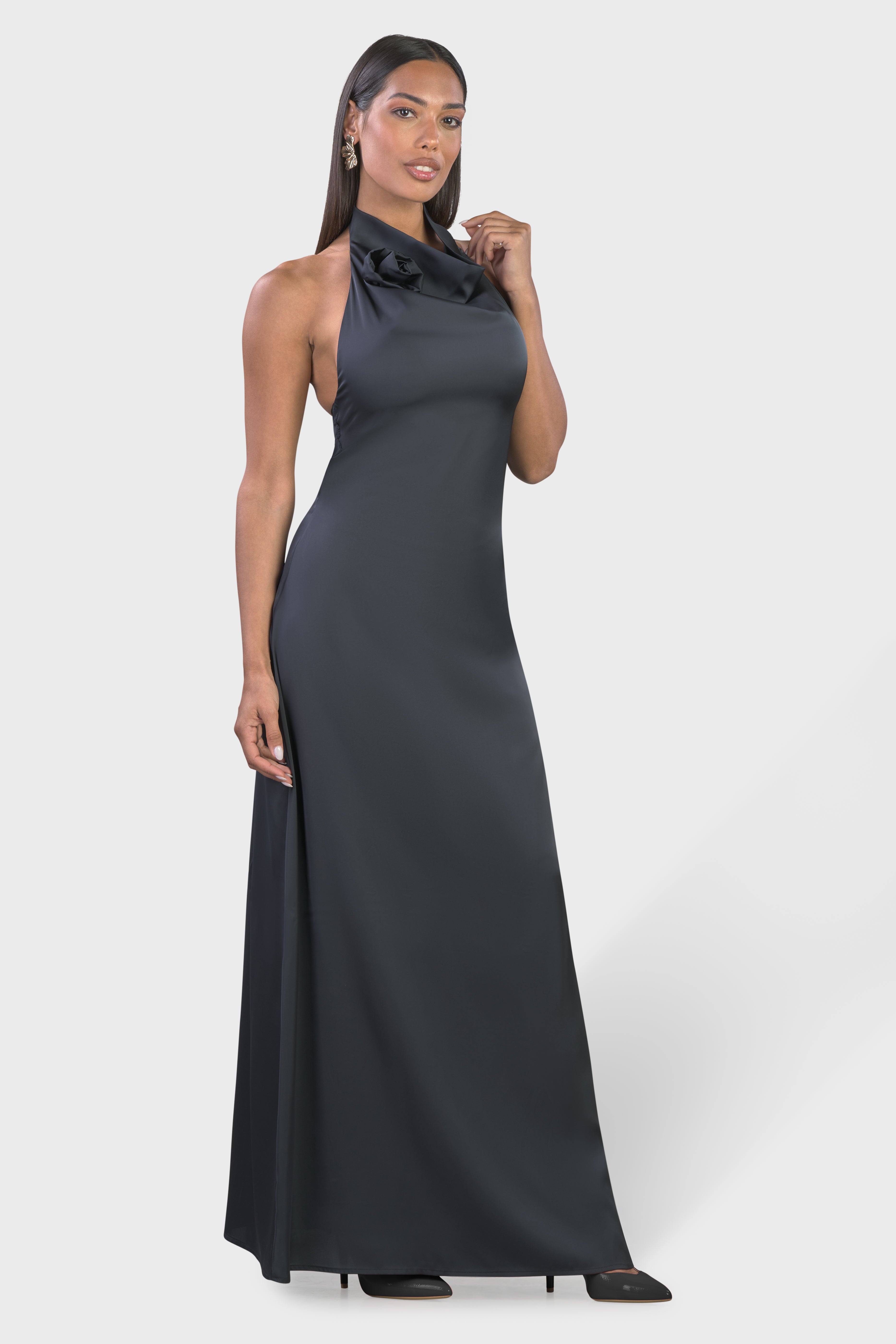 Realizzato in uno scivoloso e lucente raso, liscio al tatto. L’abito lungo è caratterizzato da uno scollo ad anello con chiusura sul retro con bottone rivestito nello stesso tessuto. E’ impreziosito dal dettaglio della rosa cucita, emblema della collezione, realizzata nello stesso tessuto. Il modello fluttuante è ideale da indossare con dei tacchi vertiginosi in grado di allungare la silhouette, ma anche con un paio di sandali per renderlo pratico e versatile.