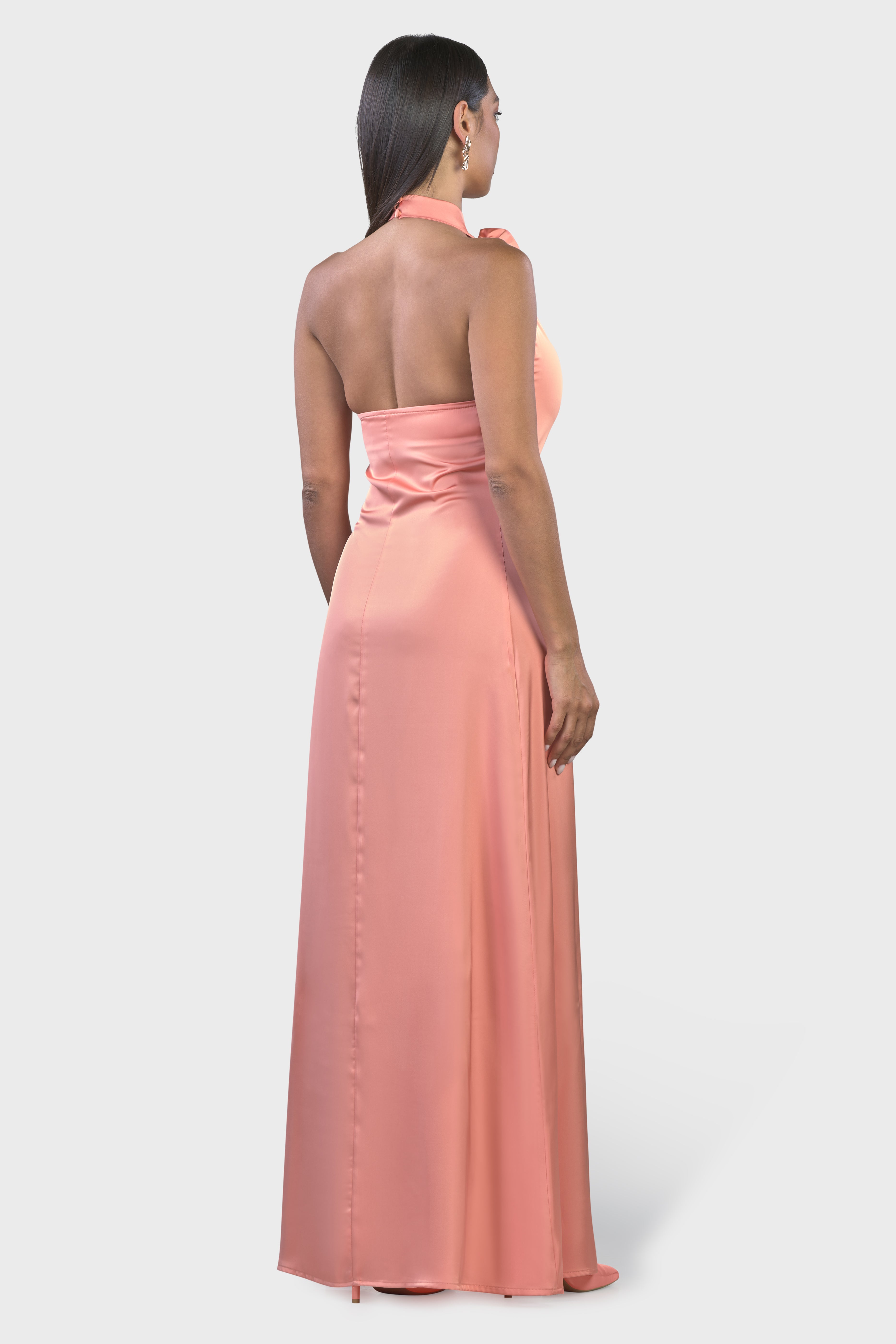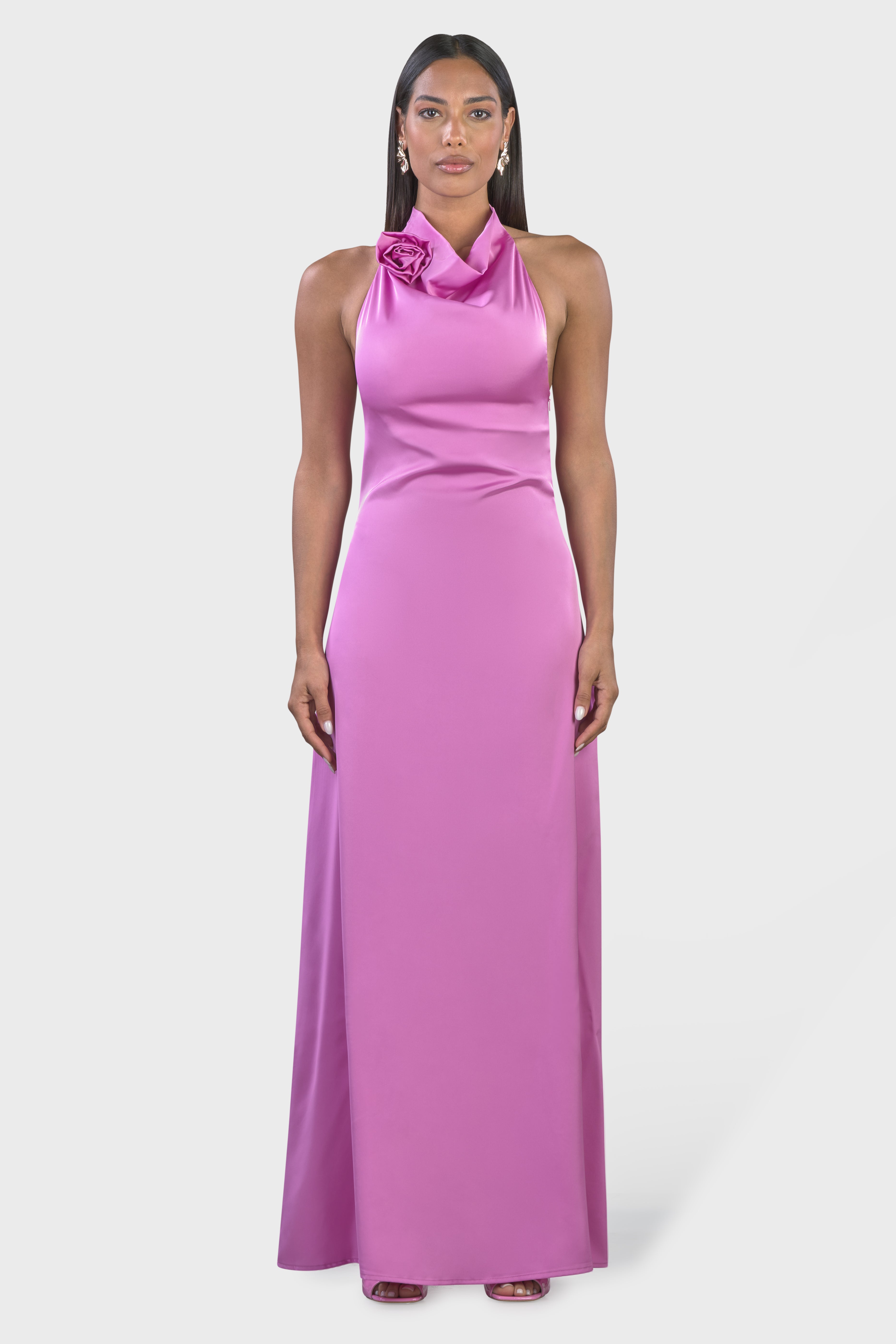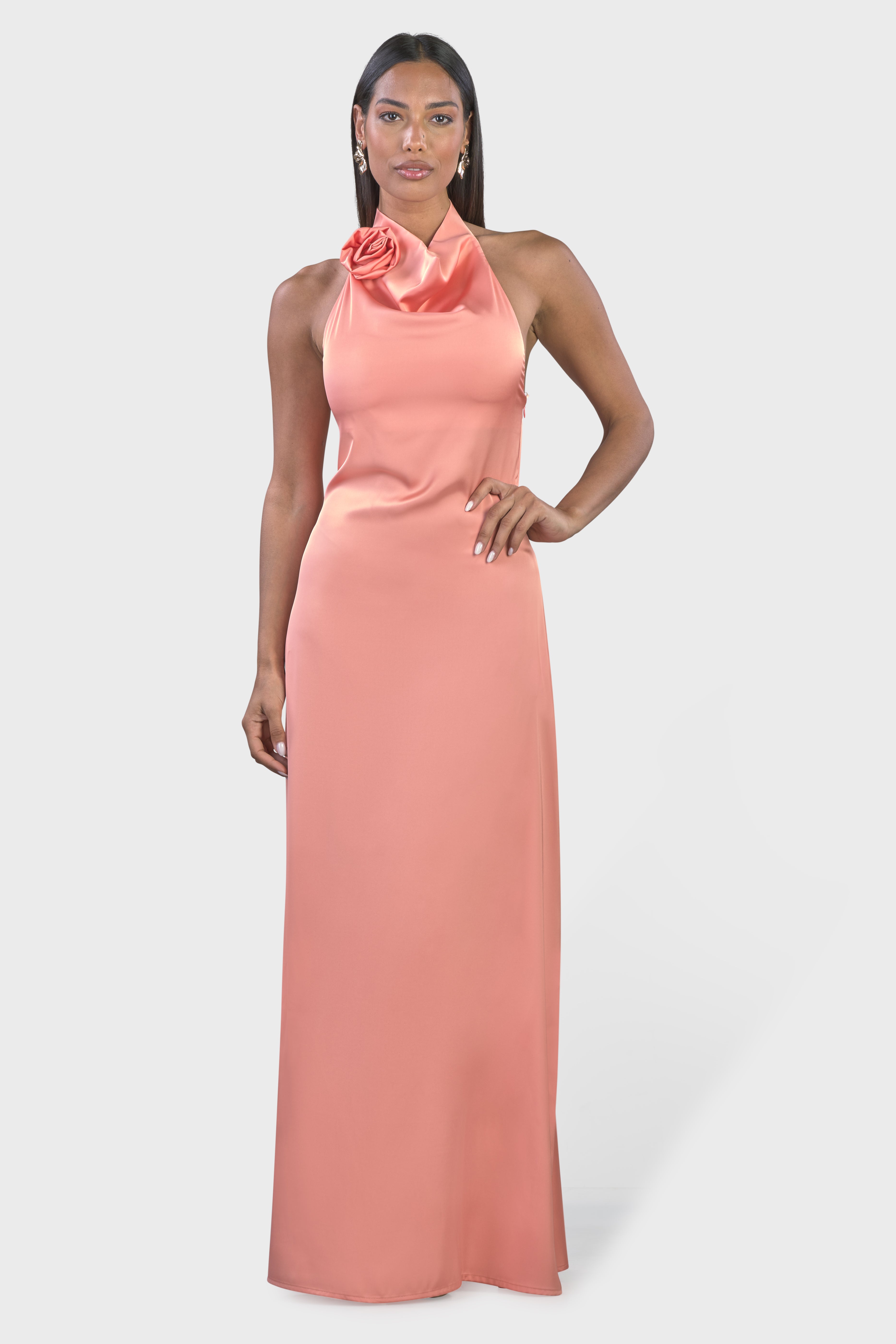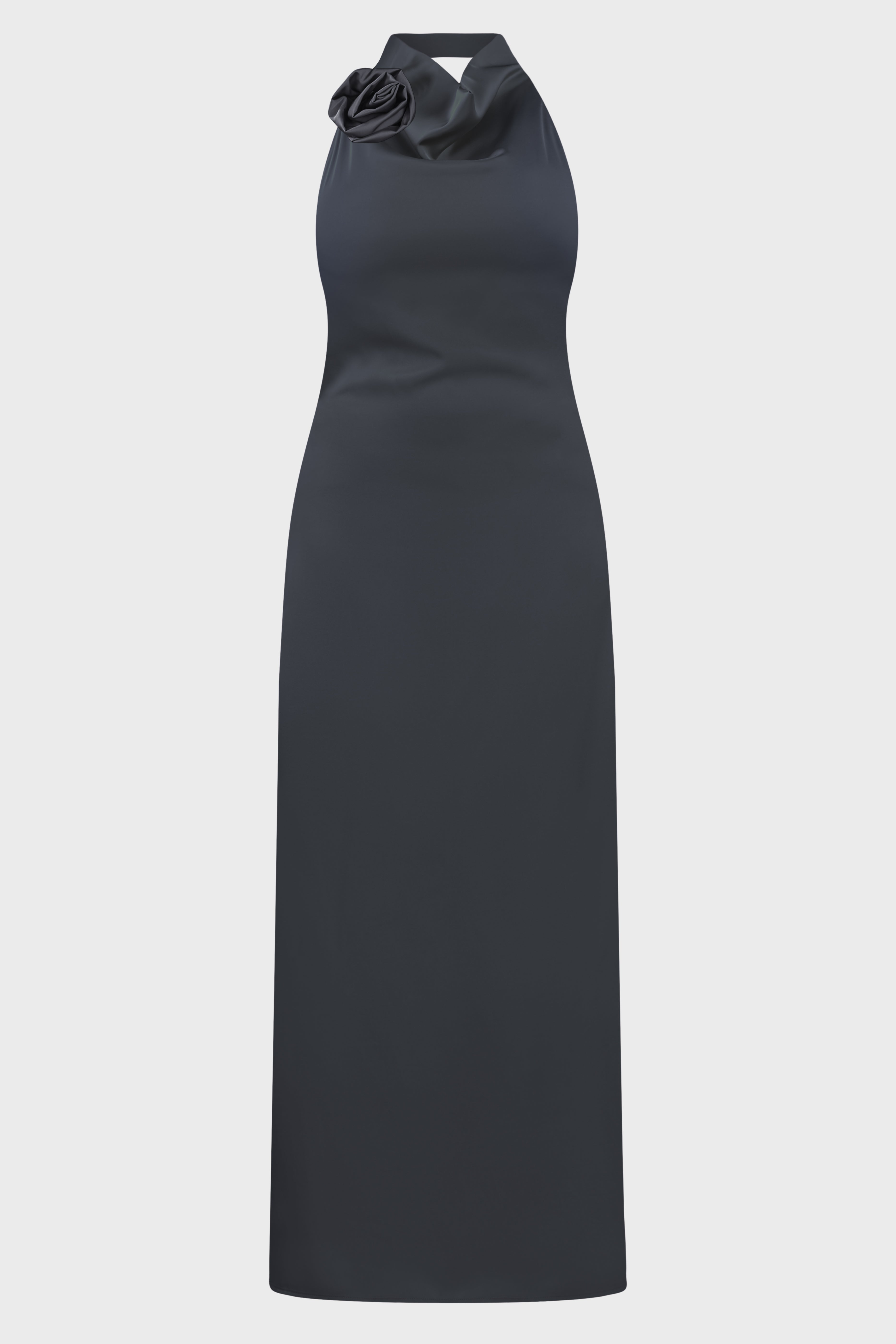 Realizzato in uno scivoloso e lucente raso, liscio al tatto. L’abito lungo è caratterizzato da uno scollo ad anello con chiusura sul retro con bottone rivestito nello stesso tessuto. E’ impreziosito dal dettaglio della rosa cucita, emblema della collezione, realizzata nello stesso tessuto. Il modello fluttuante è ideale da indossare con dei tacchi vertiginosi in grado di allungare la silhouette, ma anche con un paio di sandali per renderlo pratico e versatile.