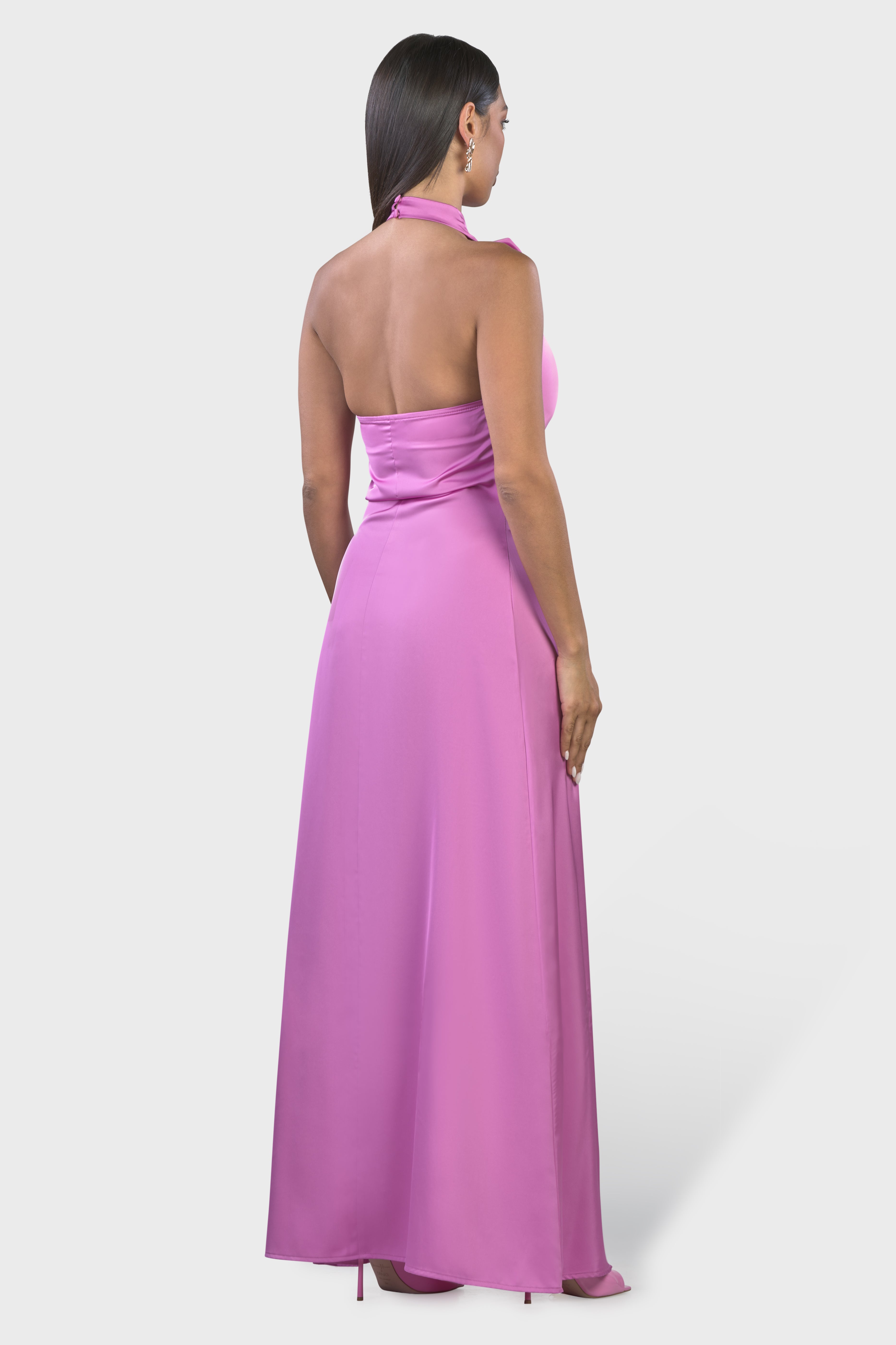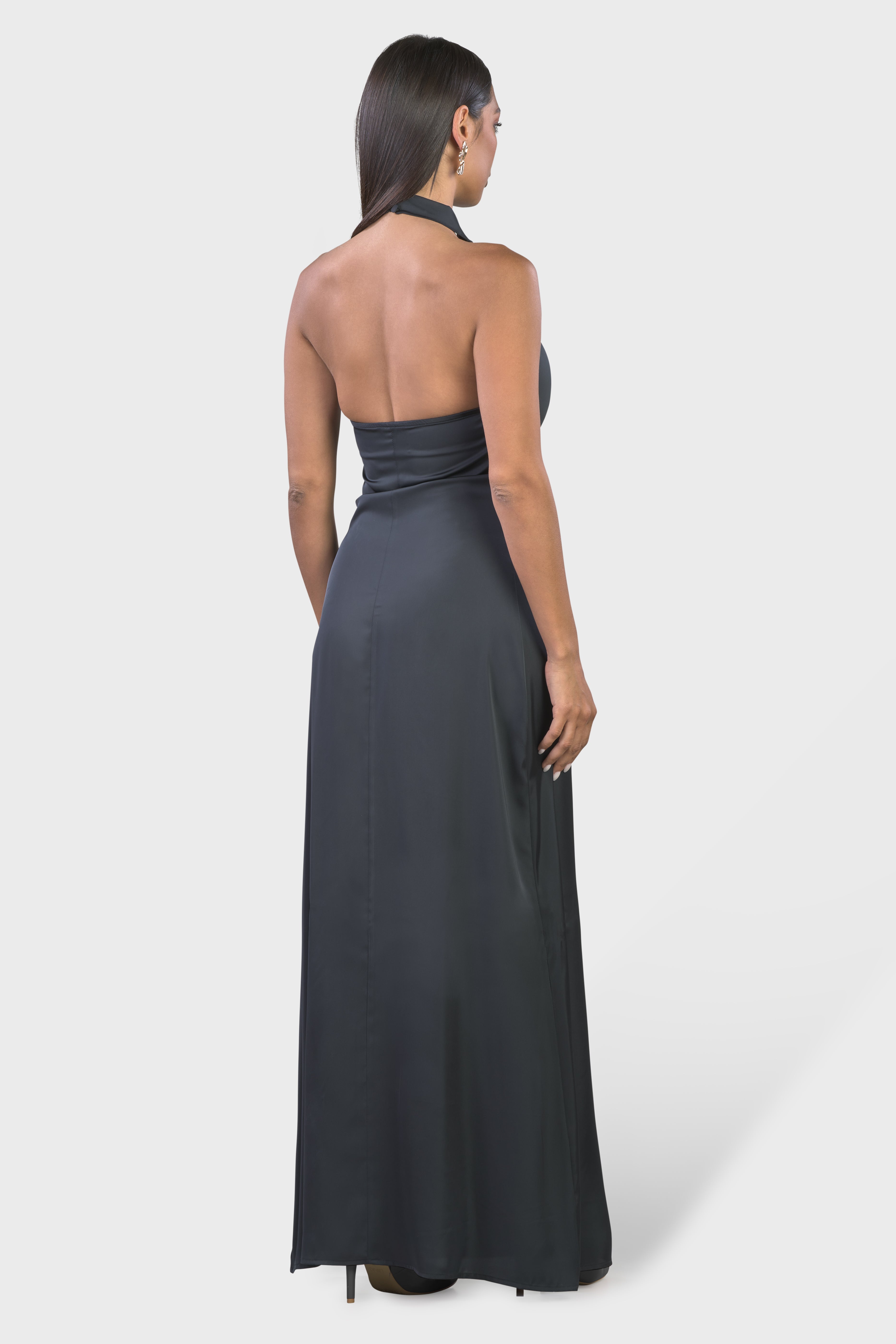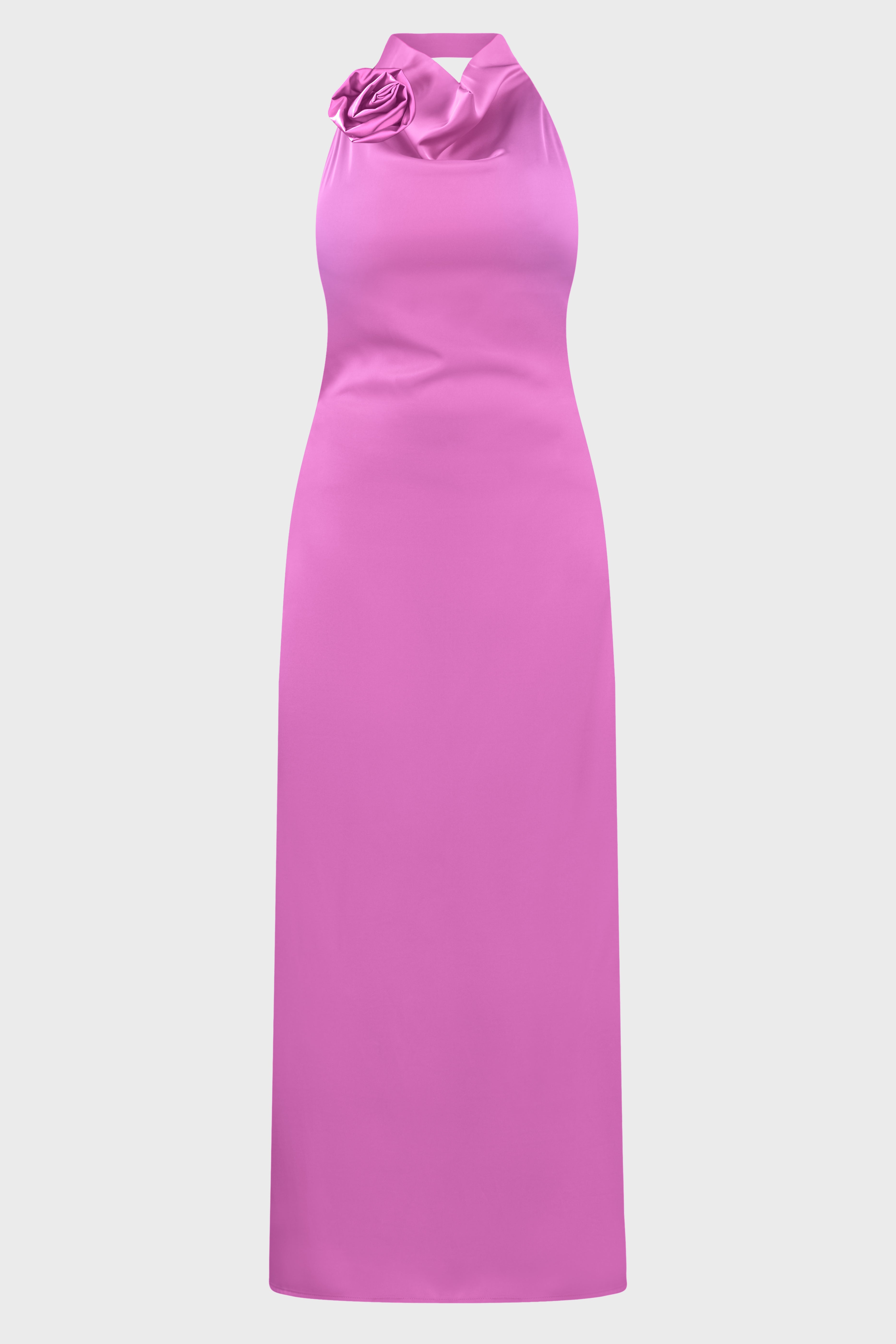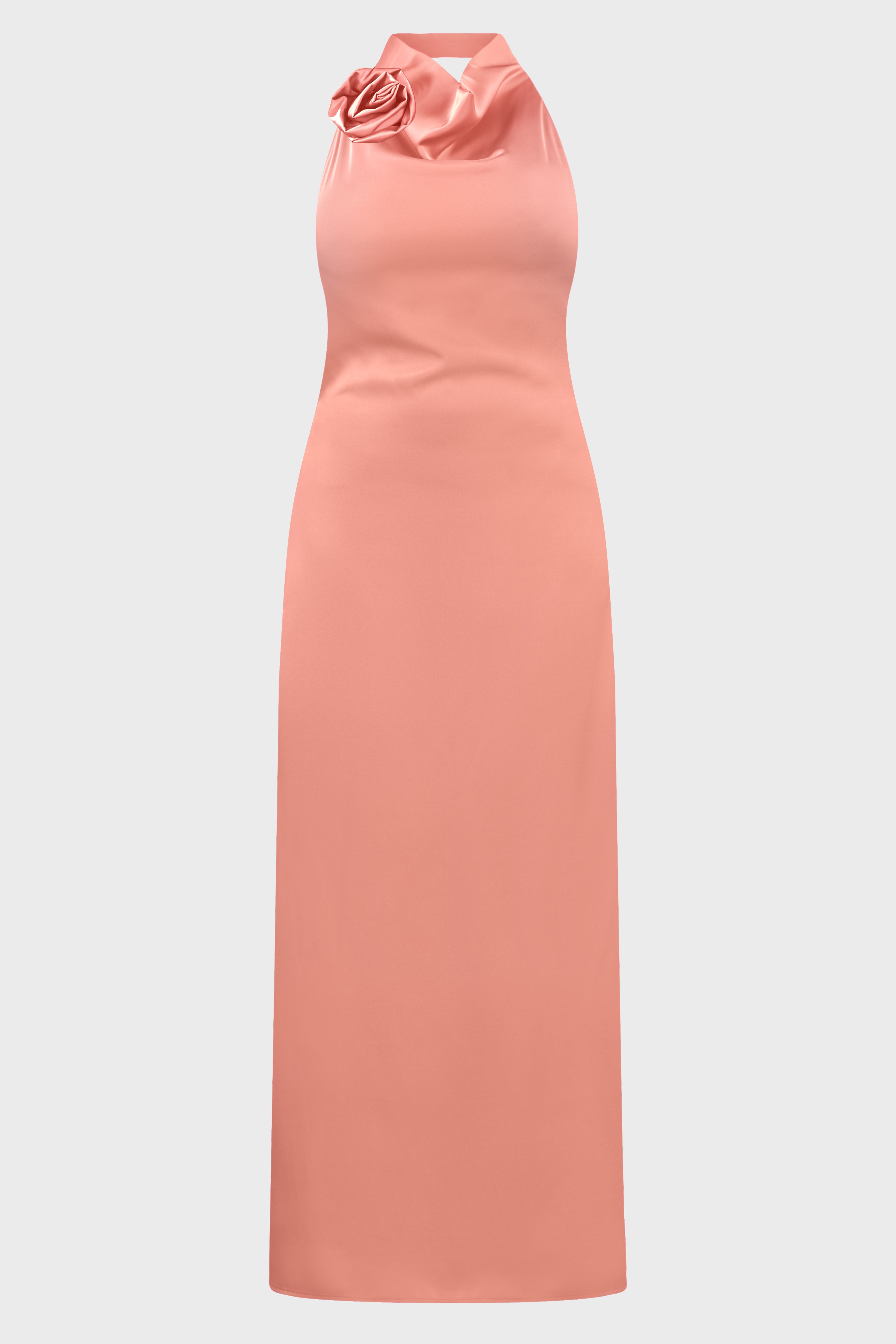 Realizzato in uno scivoloso e lucente raso, liscio al tatto. L’abito lungo è caratterizzato da uno scollo ad anello con chiusura sul retro con bottone rivestito nello stesso tessuto. E’ impreziosito dal dettaglio della rosa cucita, emblema della collezione, realizzata nello stesso tessuto. Il modello fluttuante è ideale da indossare con dei tacchi vertiginosi in grado di allungare la silhouette, ma anche con un paio di sandali per renderlo pratico e versatile.