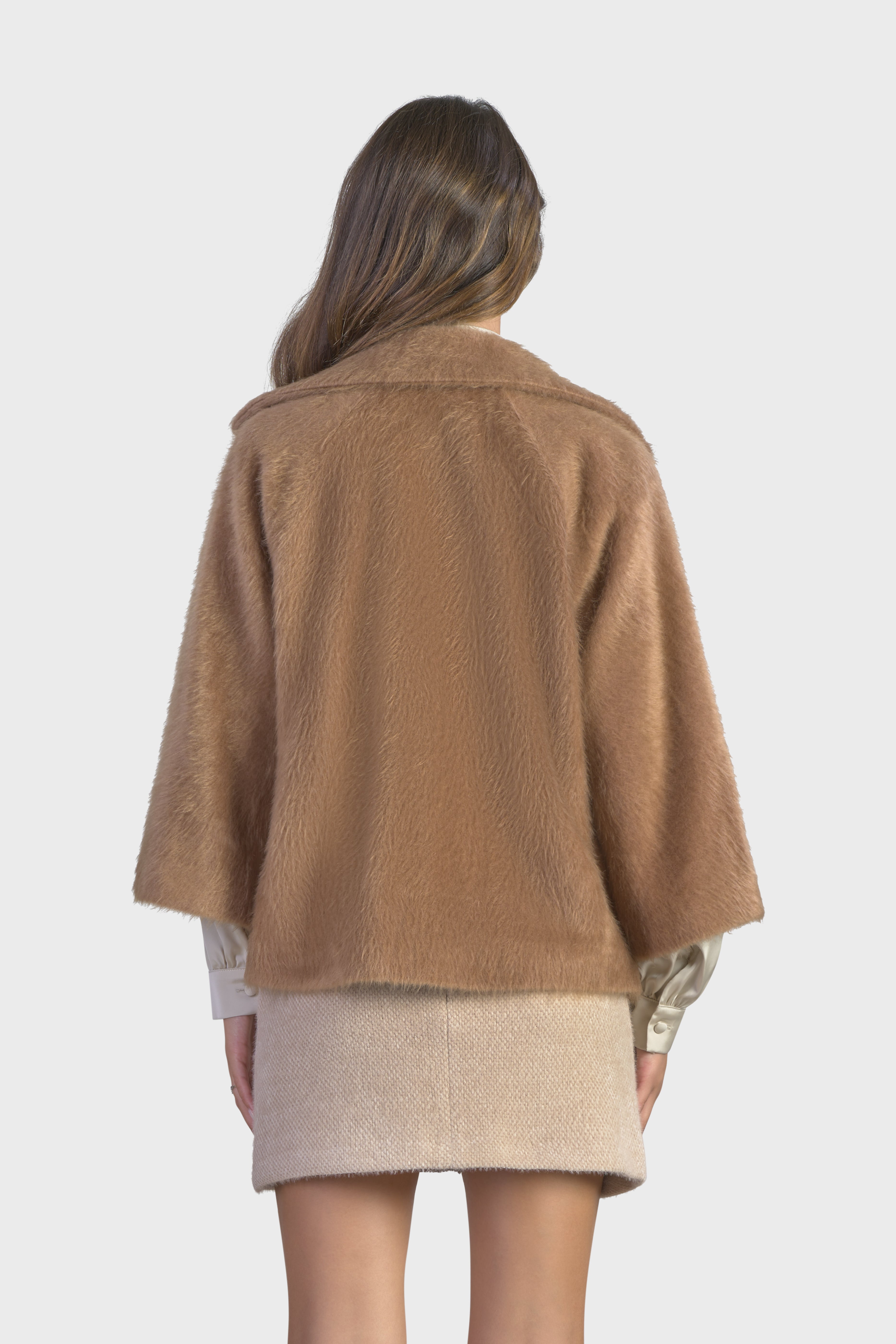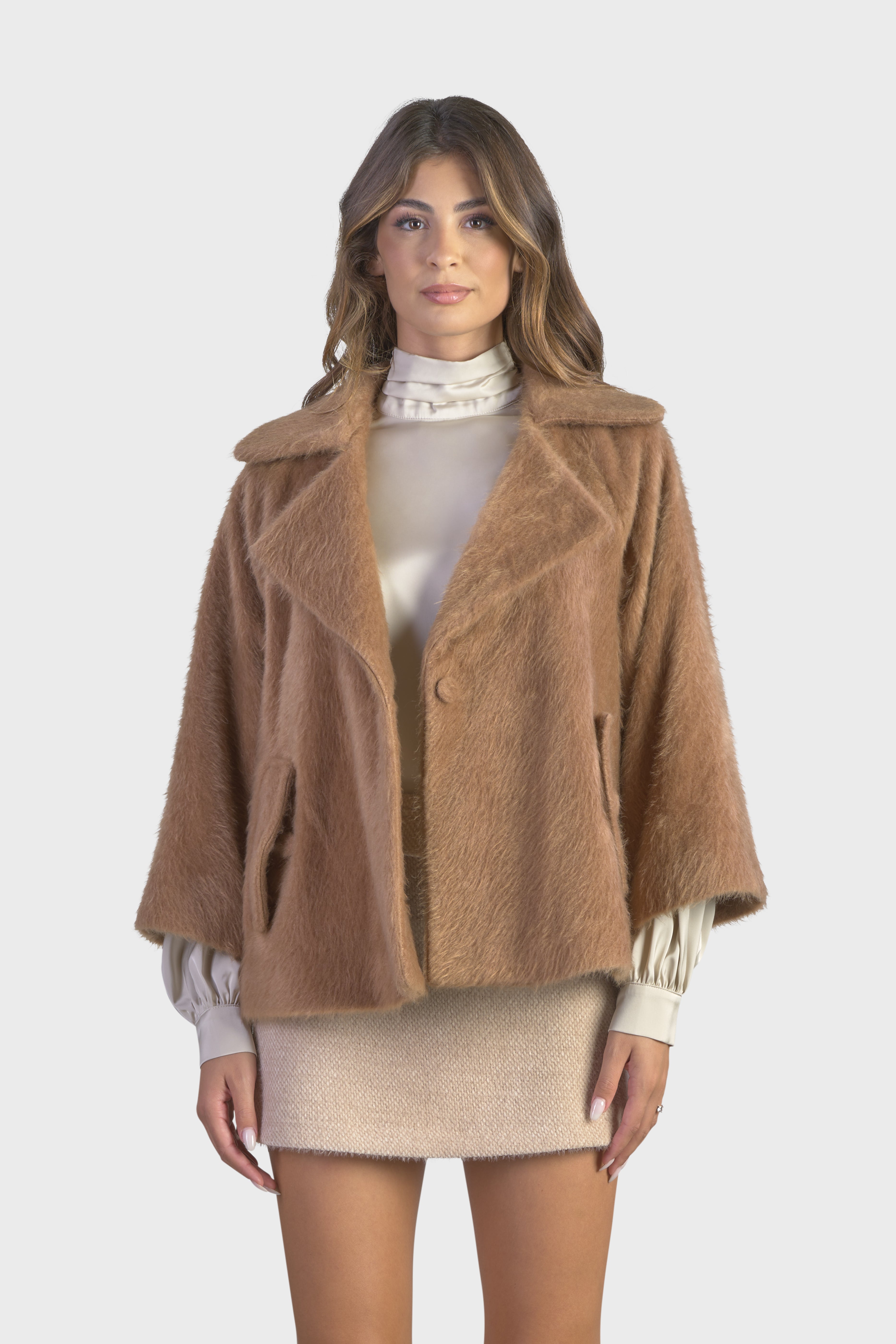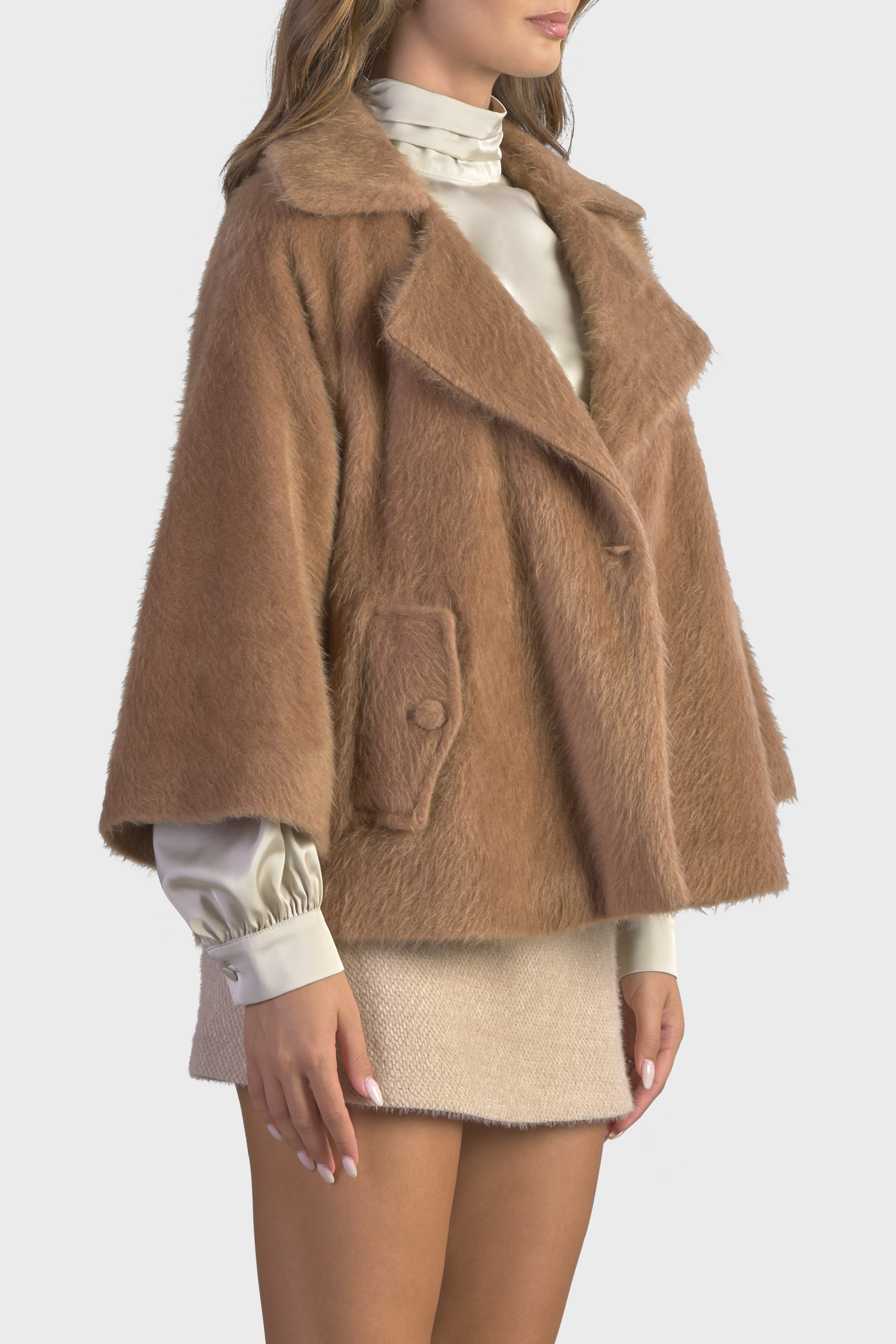 Questa raffinata pelliccia si distingue per il suo soffice e ampio collo a revers, che aggiunge un tocco di lusso e calore. La vestibilità morbida con maniche lunghe dal taglio raglan, crea un look elegante e rilassato. Realizzata in una morbida pelliccia a pelo corto, tessuto soffice, perfetto per chi cerca una moda che faccia la differenza. Il modello è dotato di due tasche con pattina sul davanti, per una funzionalità discreta. Infine i bottoni rivestiti e la lunghezza al bacino, conferiscono un’eleganza senza tempo. Perfetto per chi desidera avvolgersi nel lusso con stile e sofisticatezza durante le giornate più fredde.