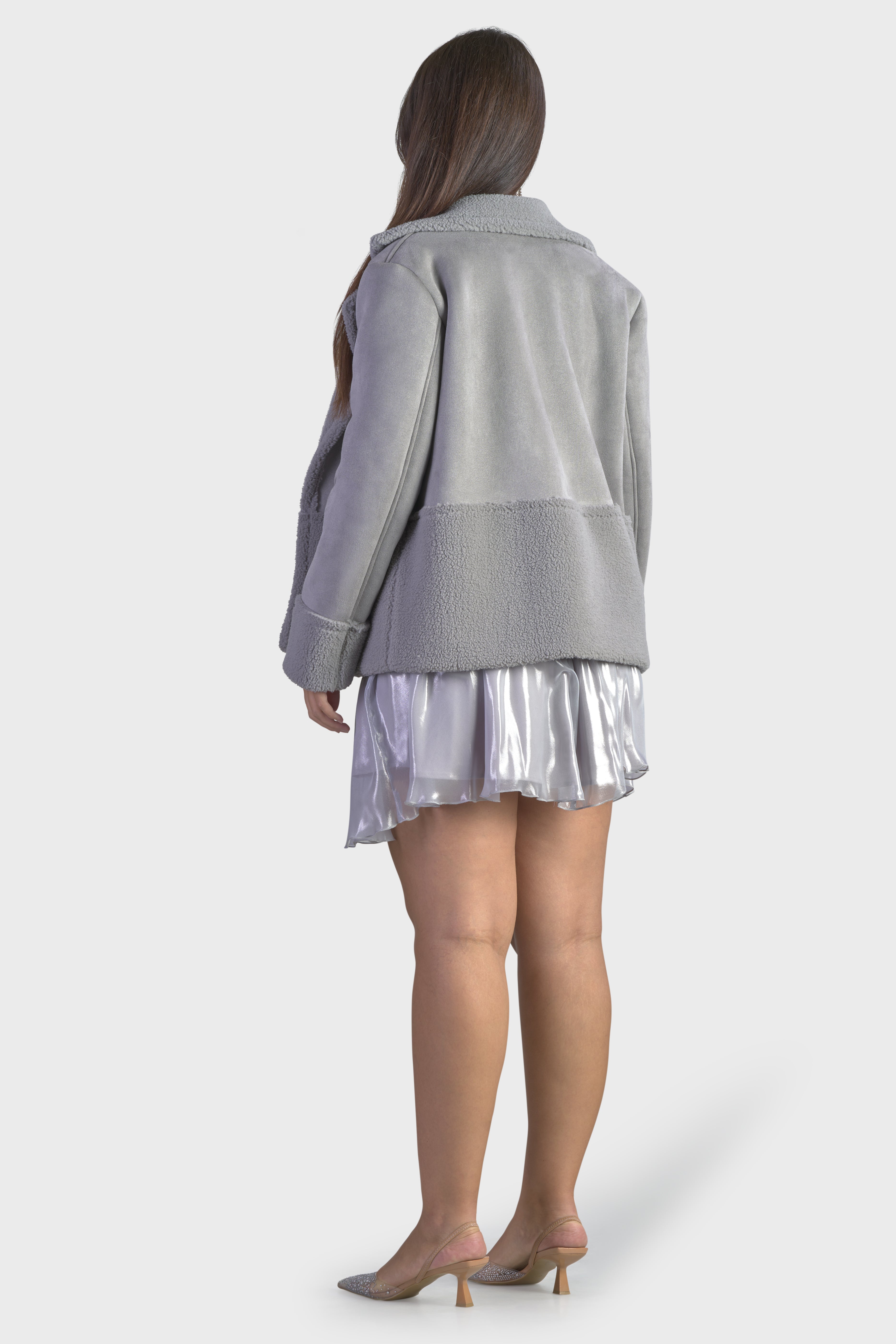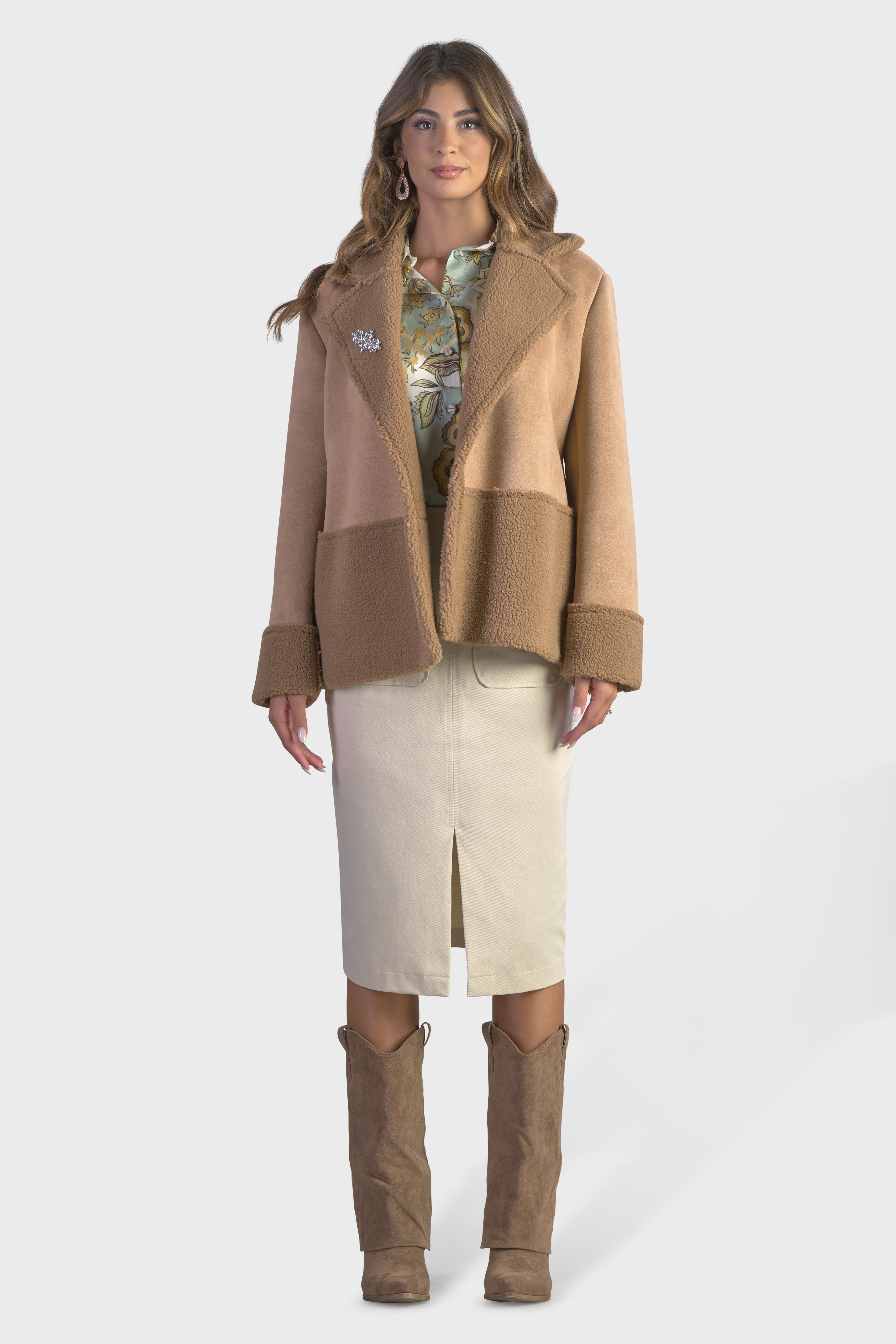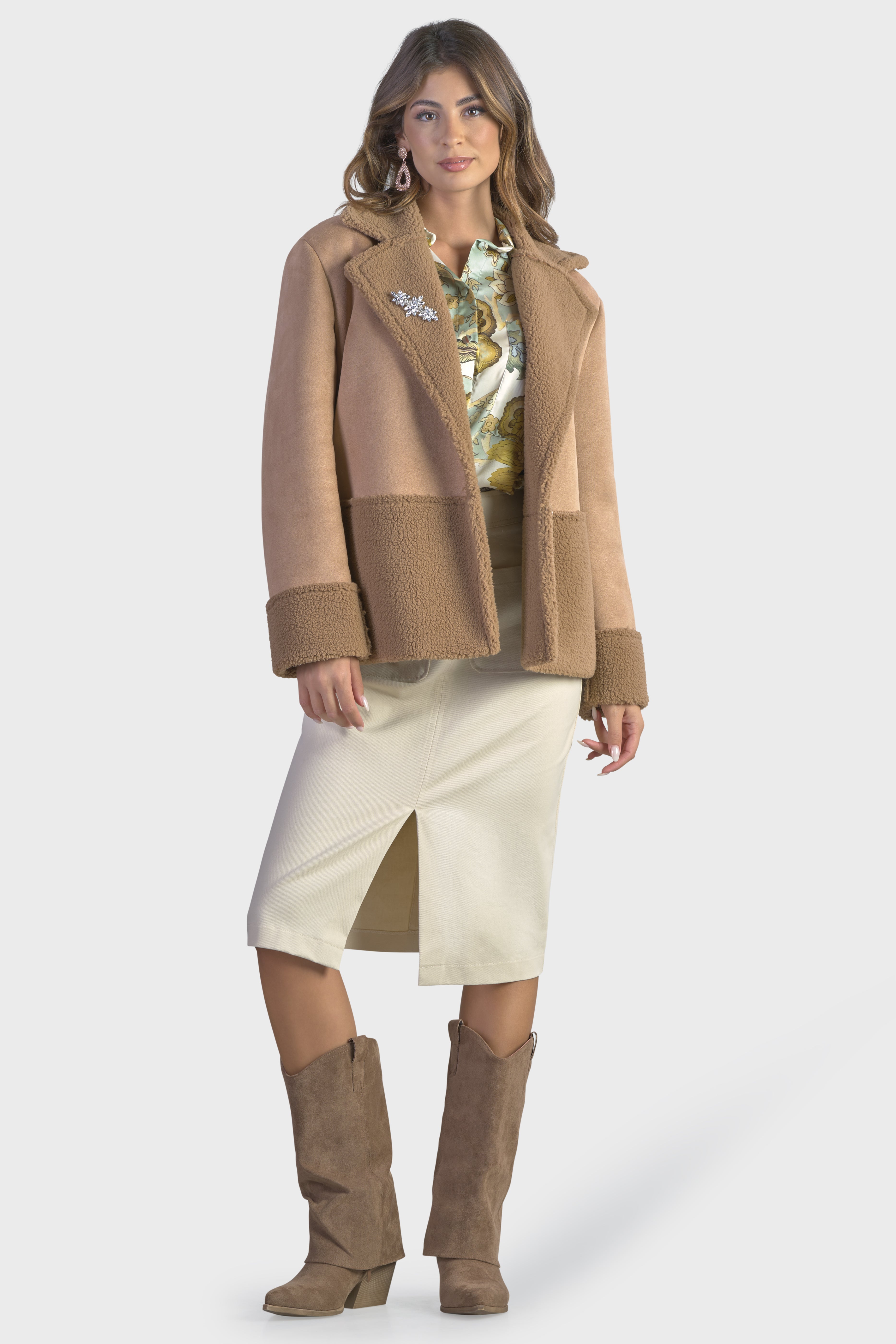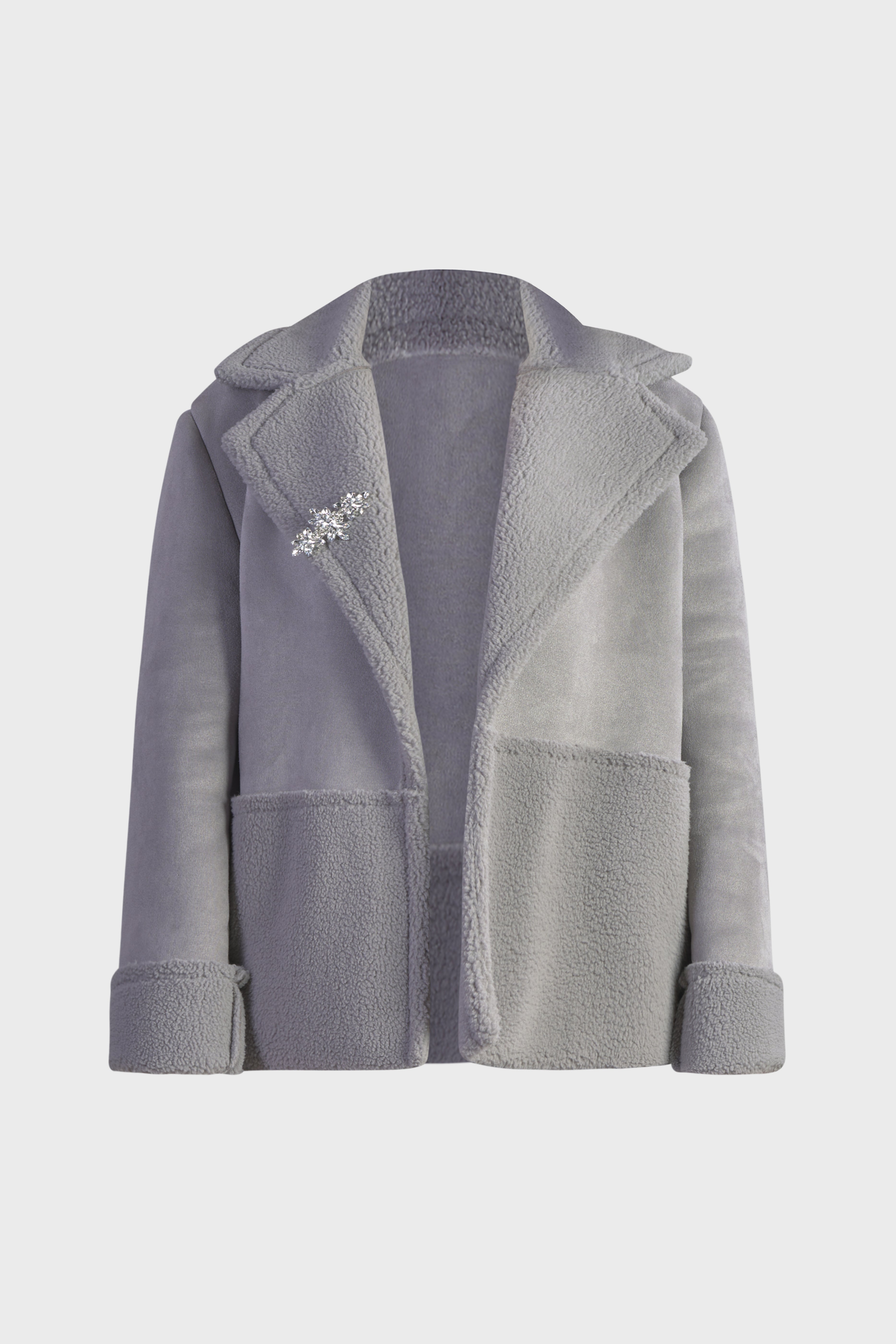 Questo cappotto corto esprime un lusso contemporaneo grazie al suo ampio collo con revers. Realizzato in montone shearling, tessuto che combina perfettamente il camoscio del lato esterno con un teddy sontuosamente morbido e soffice all’interno. Il modello dalle linee arrotondate è caratterizzato dai tagli in vita e sui polsi che creano degli armoniosi contrasti tra camoscio e pelliccia. A impreziosire il modello è la spilla con pietre argento, dettaglio esclusivo, dal design raffinato. La lunghezza al bacino, rende questo capo versatile, adatto sia a outfit formali che casual. Sarà la nuova alternativa al cappotto e il piumino, ideale per affrontare le giornate più fredde senza rinunciare allo stile.
