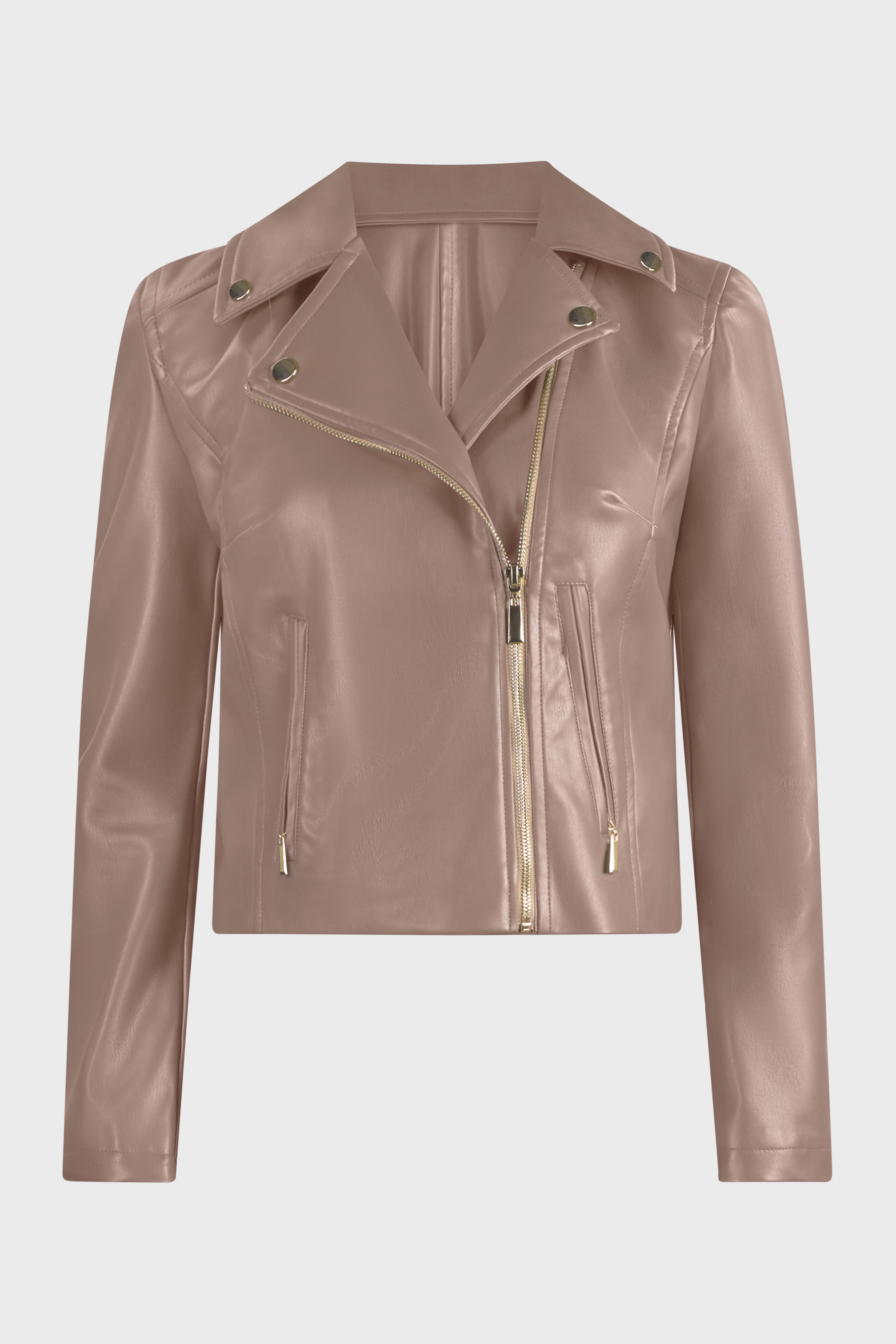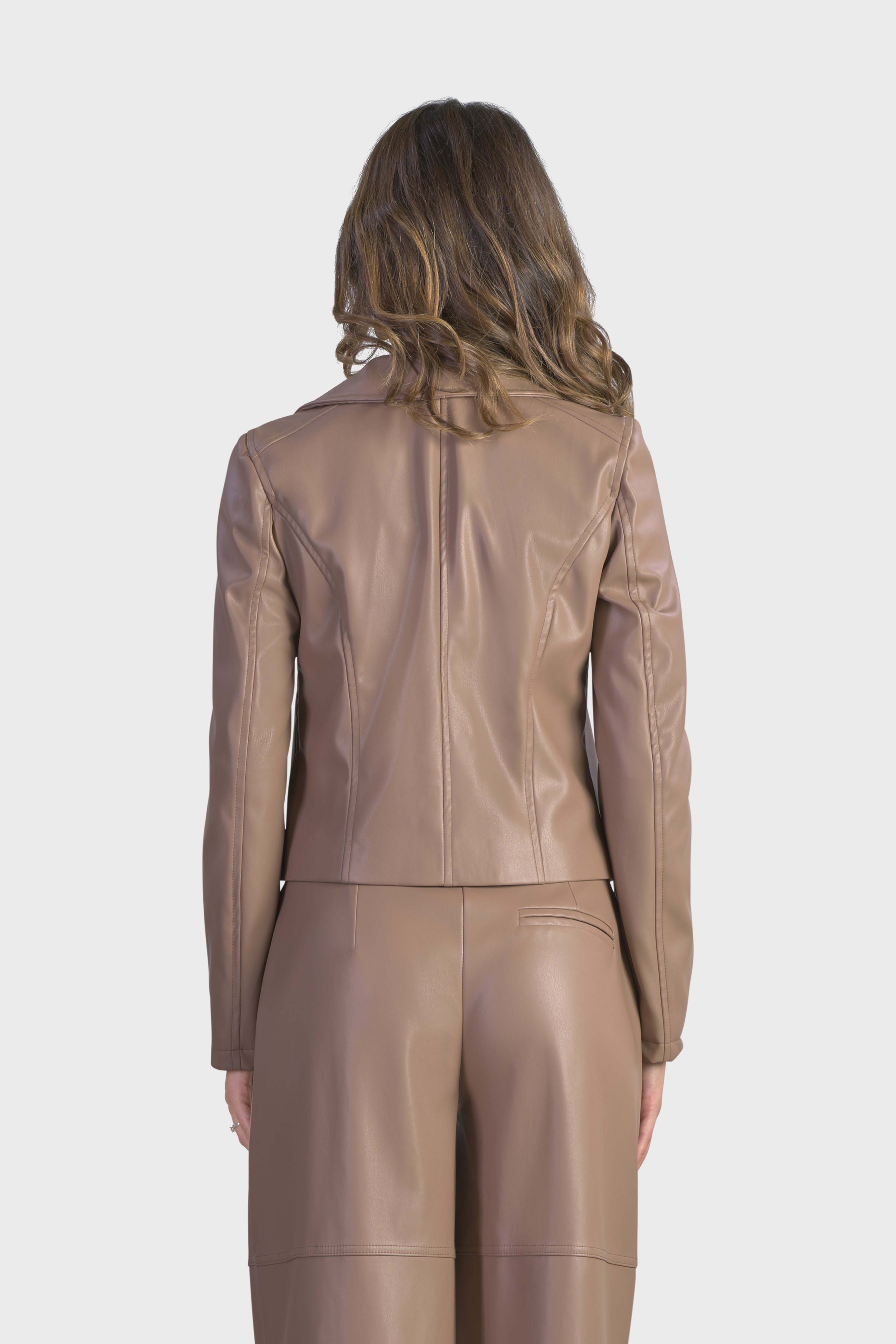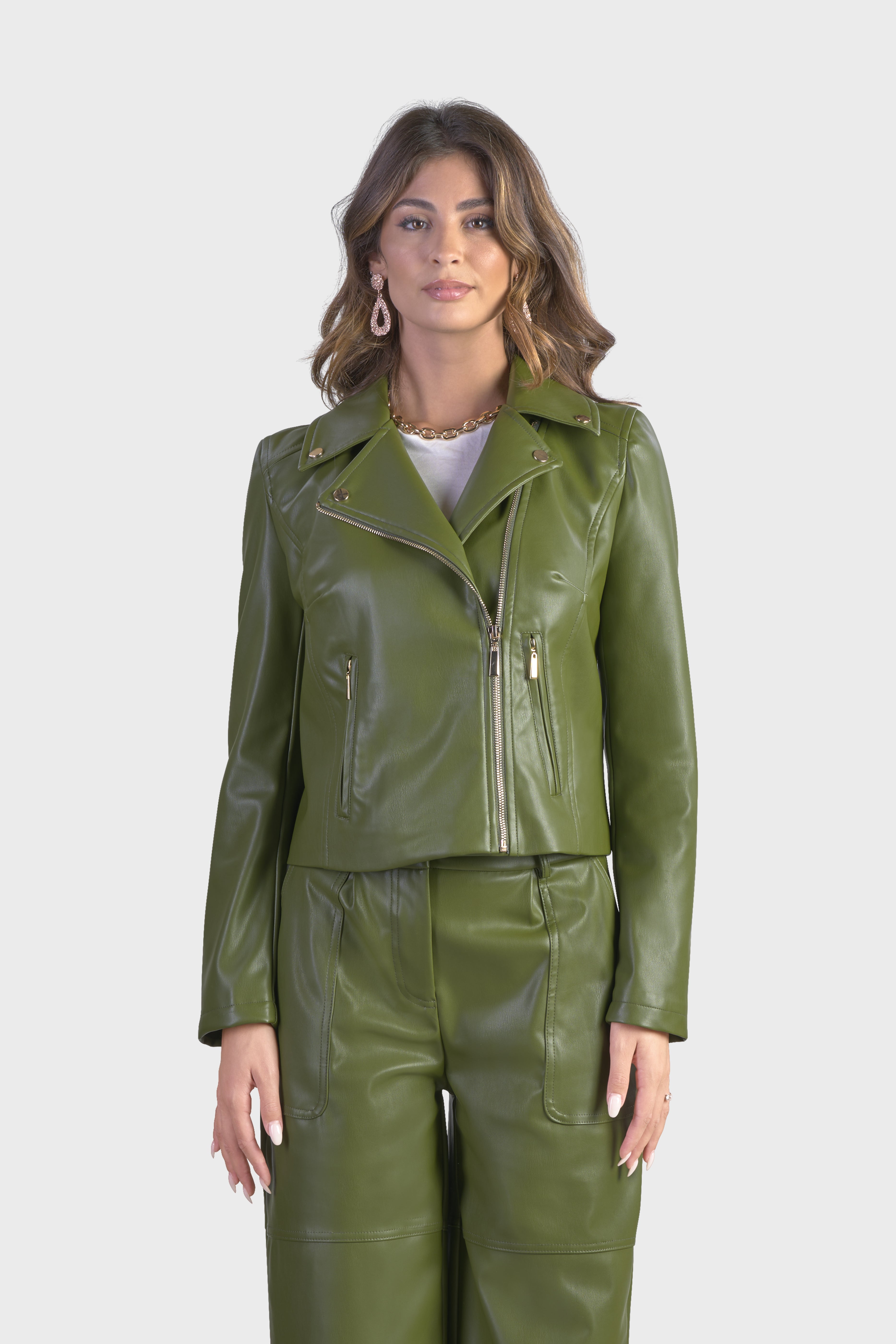 Una giacca in pelle dal design moderno e sofisticato, arricchita da una chiusura con zip asimmetrica e dettagli in metallo. Perfetta per coloro che desiderano esprimere il proprio stile unico e raffinato. Realizzata in simil pelle, tessuto morbido e delicato al tatto. A impreziosire il modello è la fodera che richiama la stampa emblema della collezione. Questa giacca aggiunge un tocco di carattere a qualsiasi outfit, rendendolo ideale per la vita metropolitana. Perfetto da abbinare al pantalone Skin in coordinato della collezione.