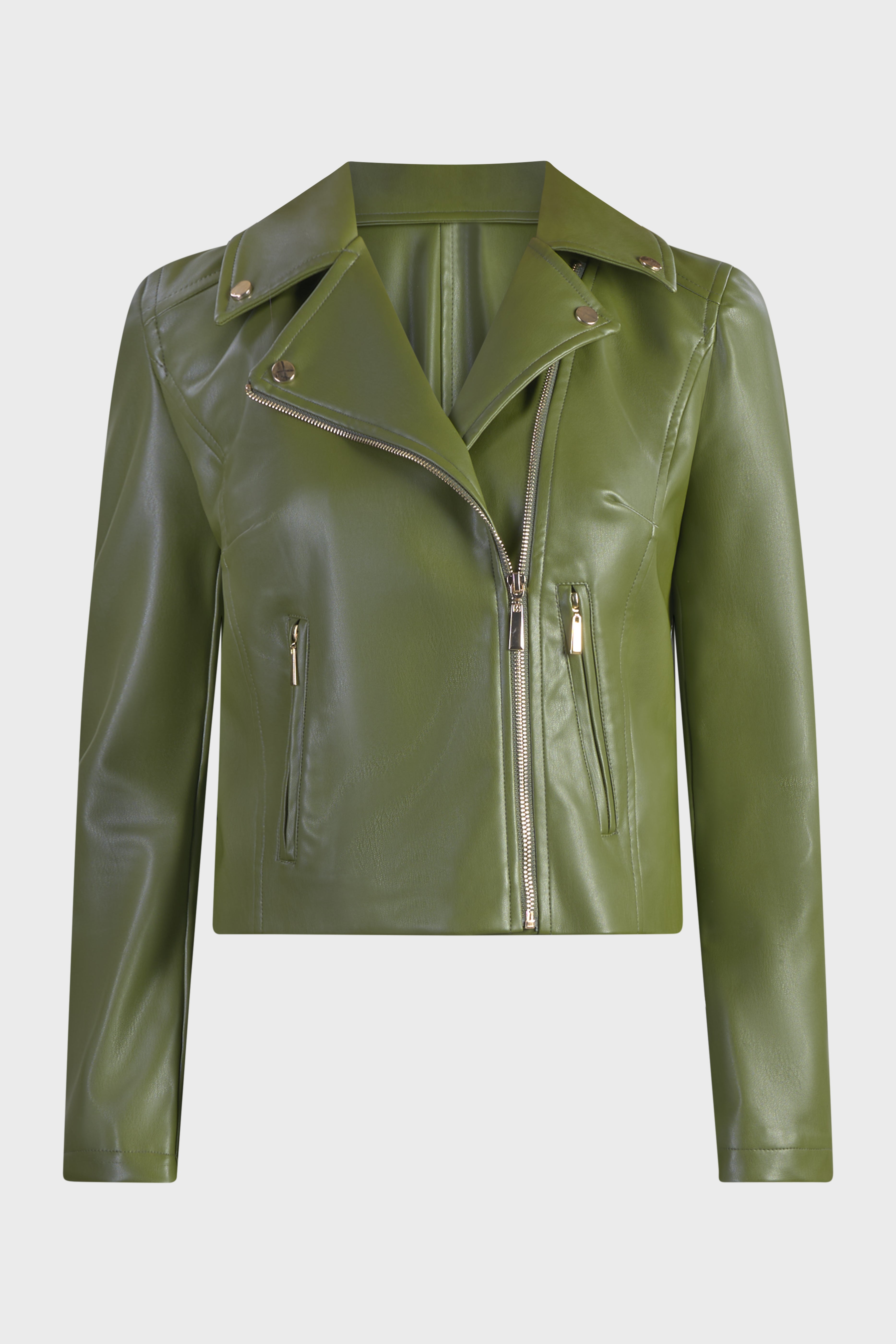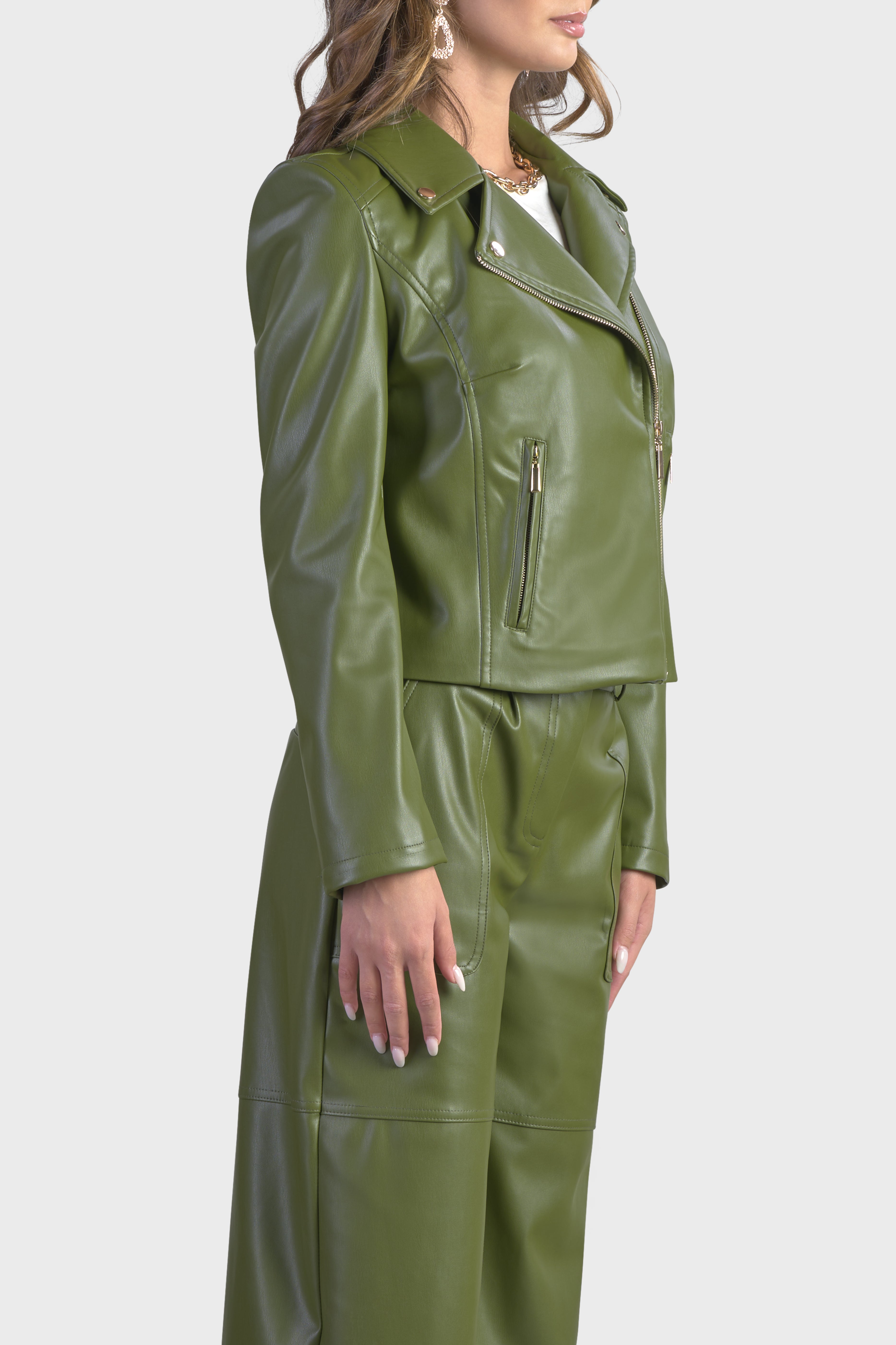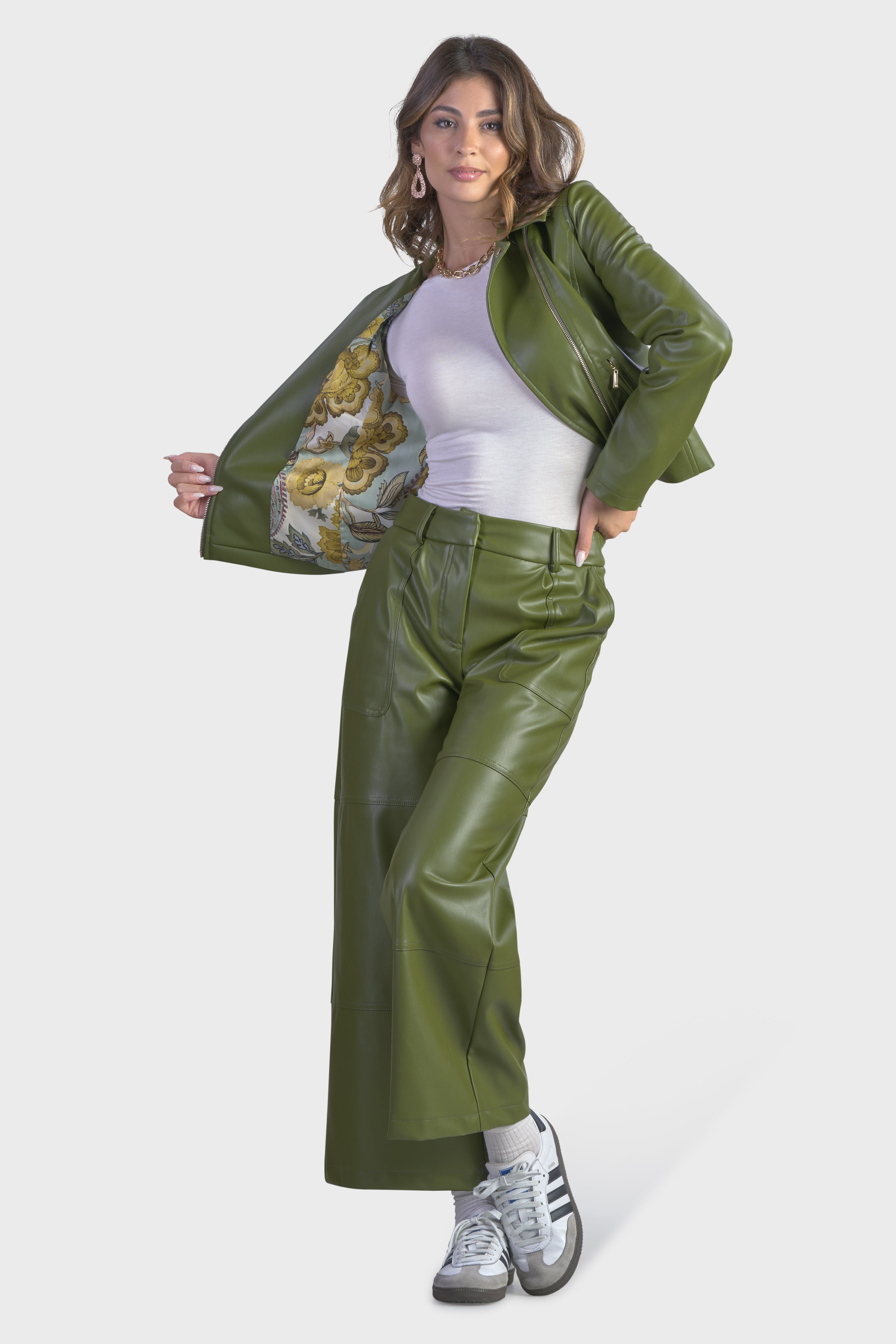 Una giacca in pelle dal design moderno e sofisticato, arricchita da una chiusura con zip asimmetrica e dettagli in metallo. Perfetta per coloro che desiderano esprimere il proprio stile unico e raffinato. Realizzata in simil pelle, tessuto morbido e delicato al tatto. A impreziosire il modello è la fodera che richiama la stampa emblema della collezione. Questa giacca aggiunge un tocco di carattere a qualsiasi outfit, rendendolo ideale per la vita metropolitana. Perfetto da abbinare al pantalone Skin in coordinato della collezione.